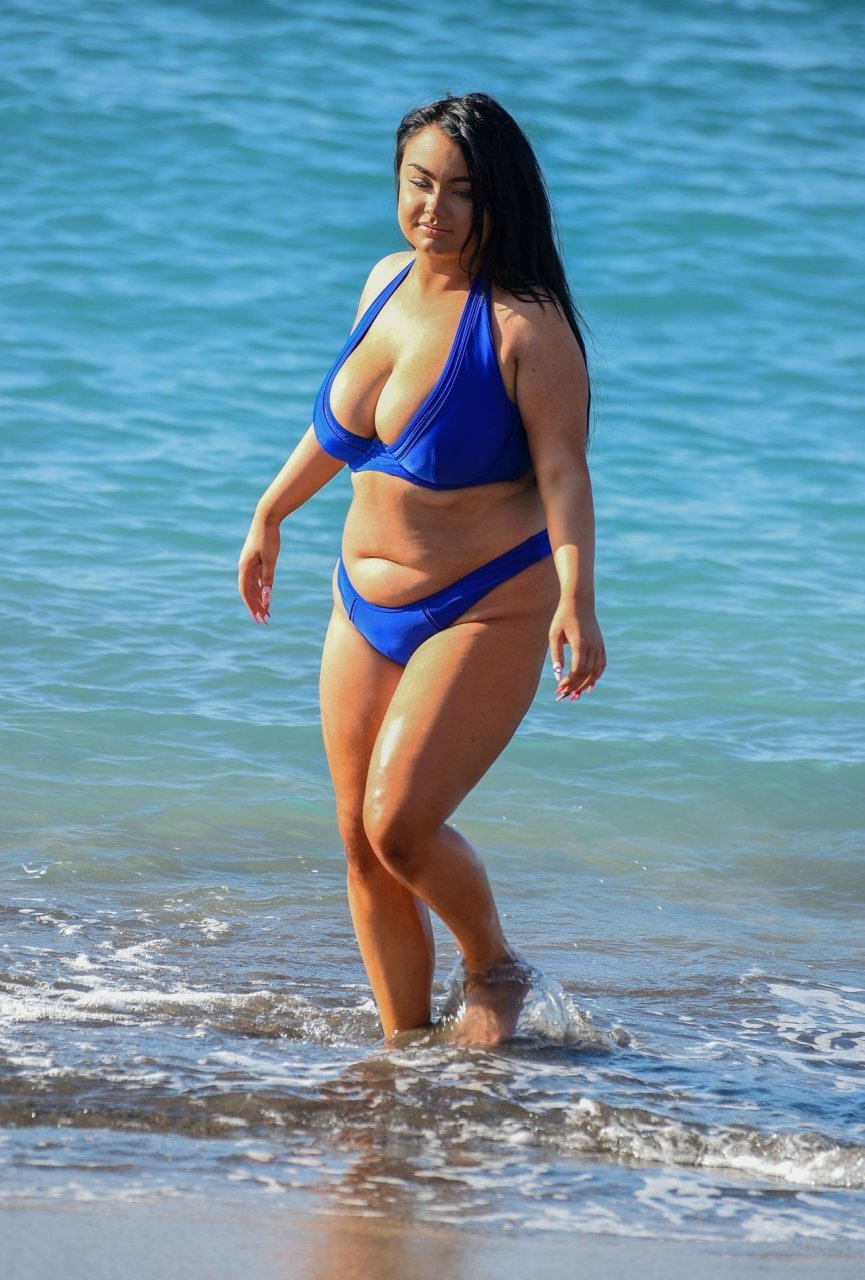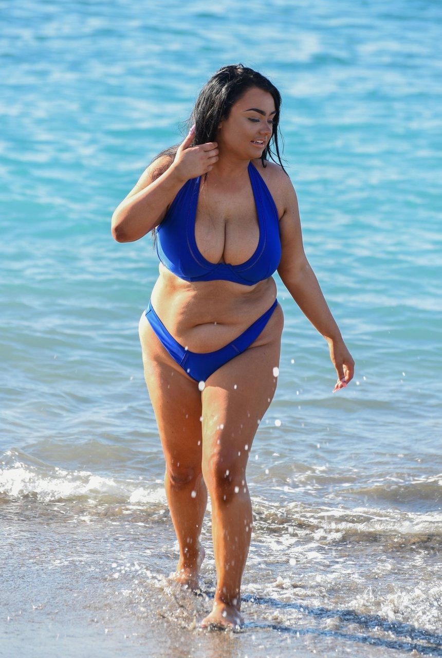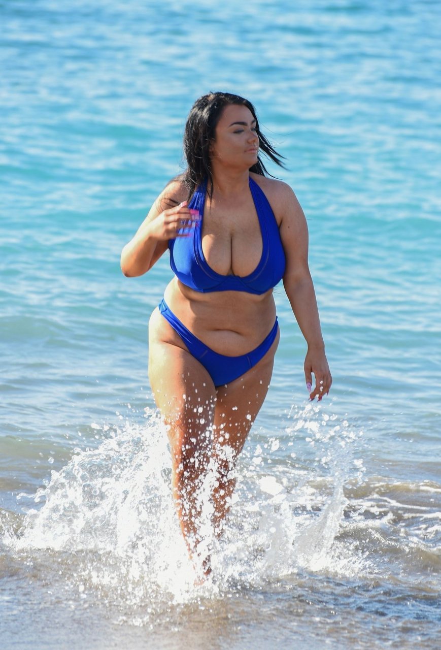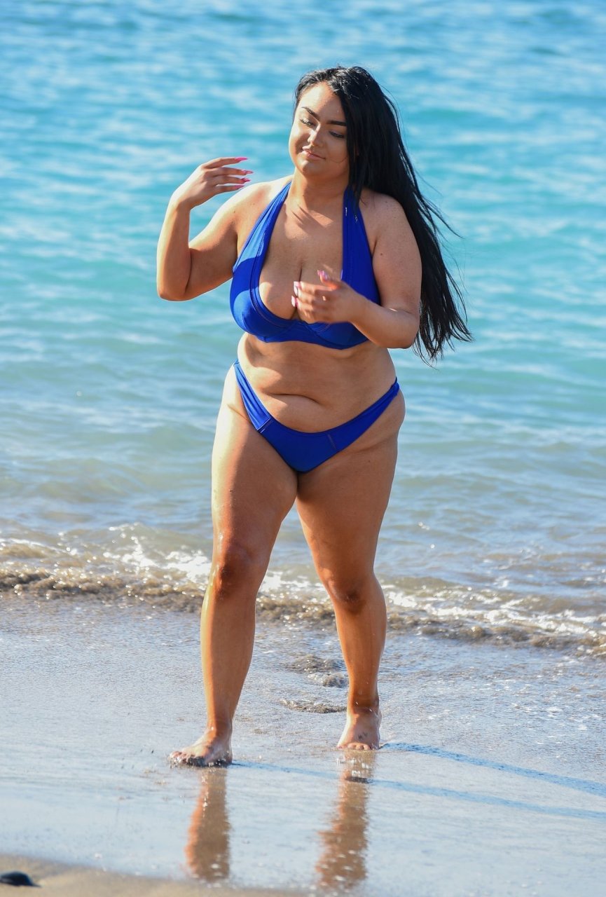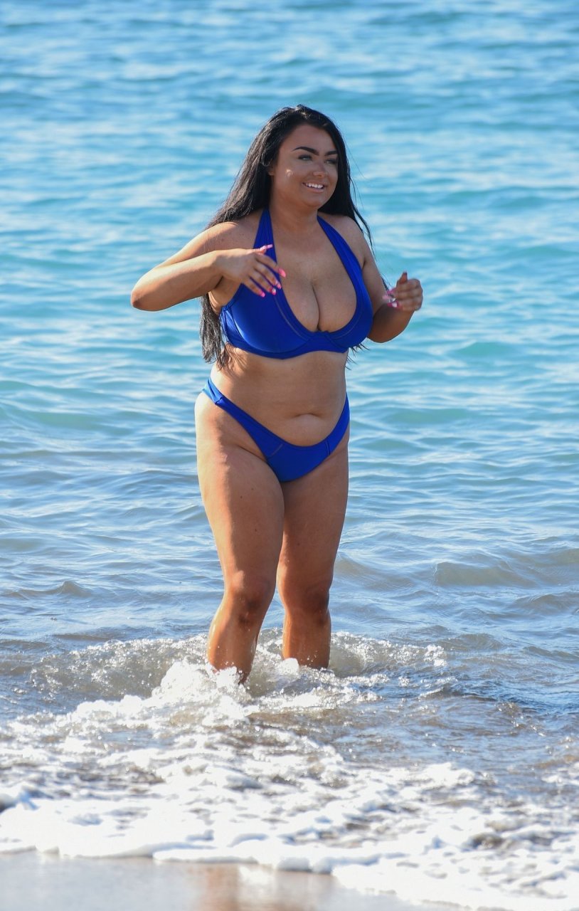 Linda morena, Faith Mullen do Geordie Shore exibe seu corpo de biquíni tamanho 16 em um biquíni azul durante as férias em Tenerife, 18/12/2018.