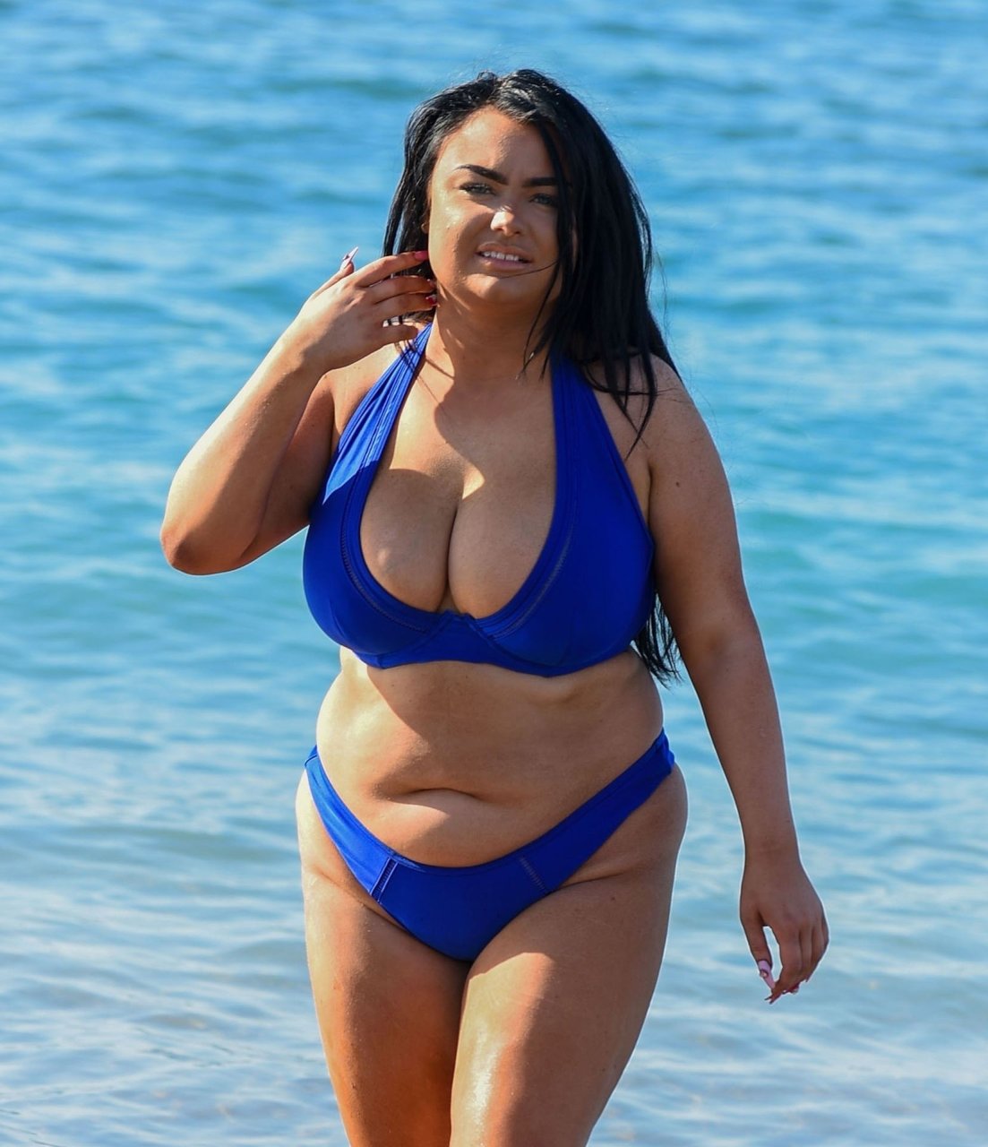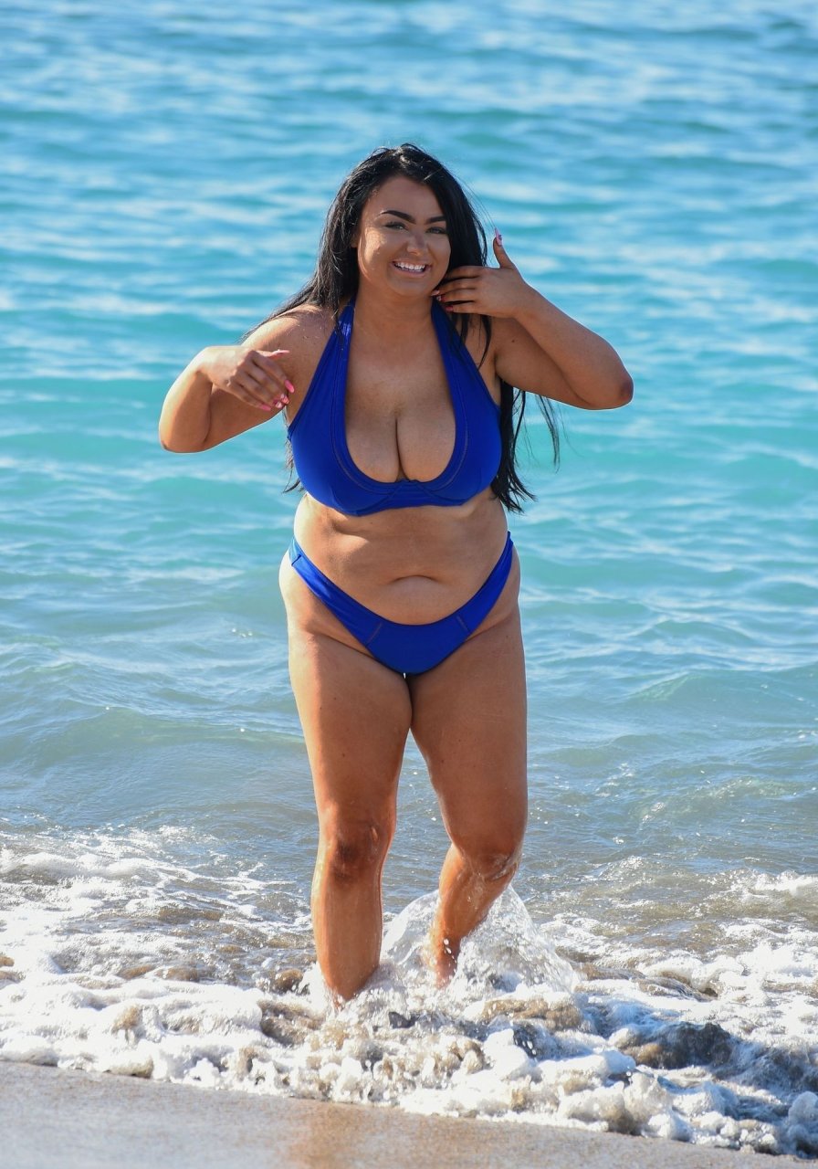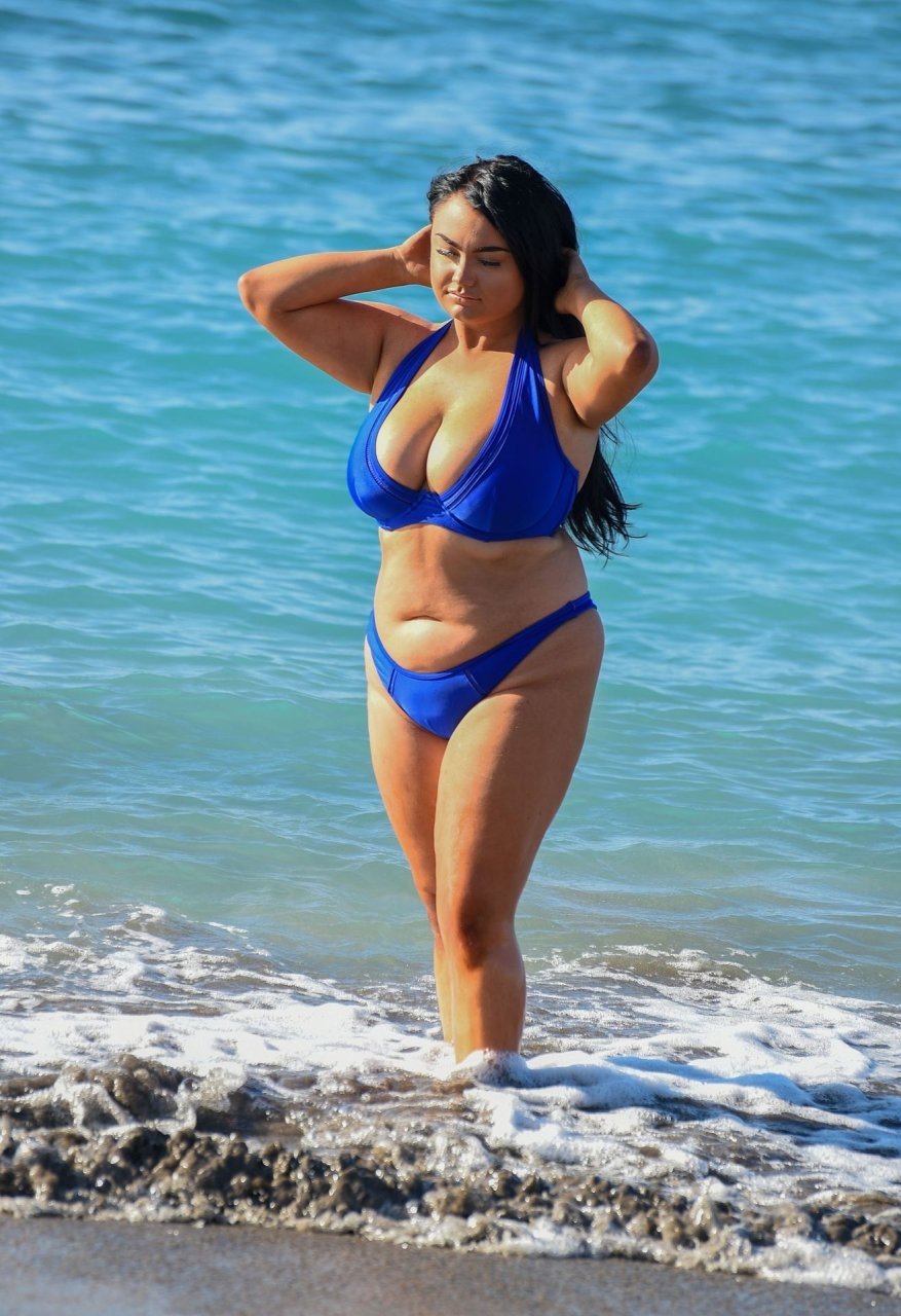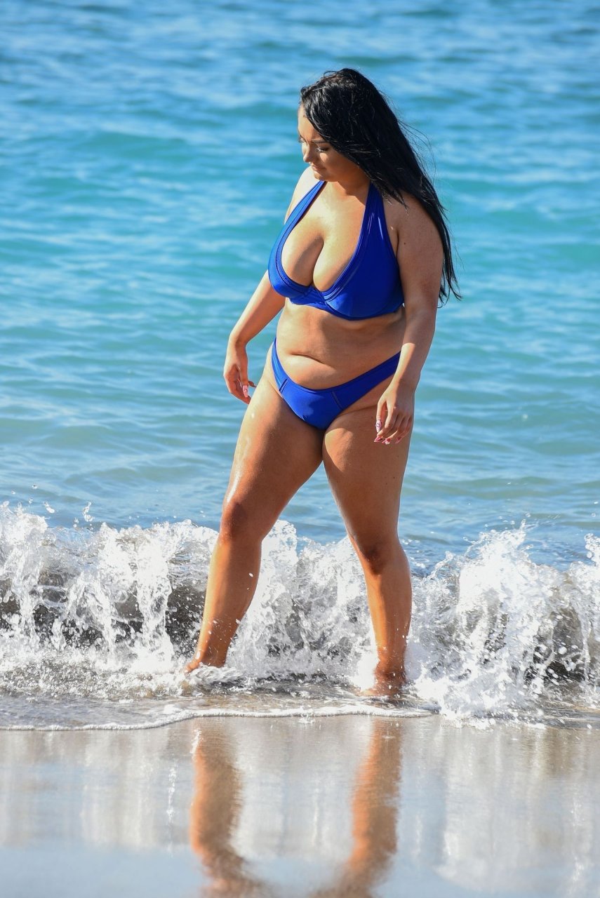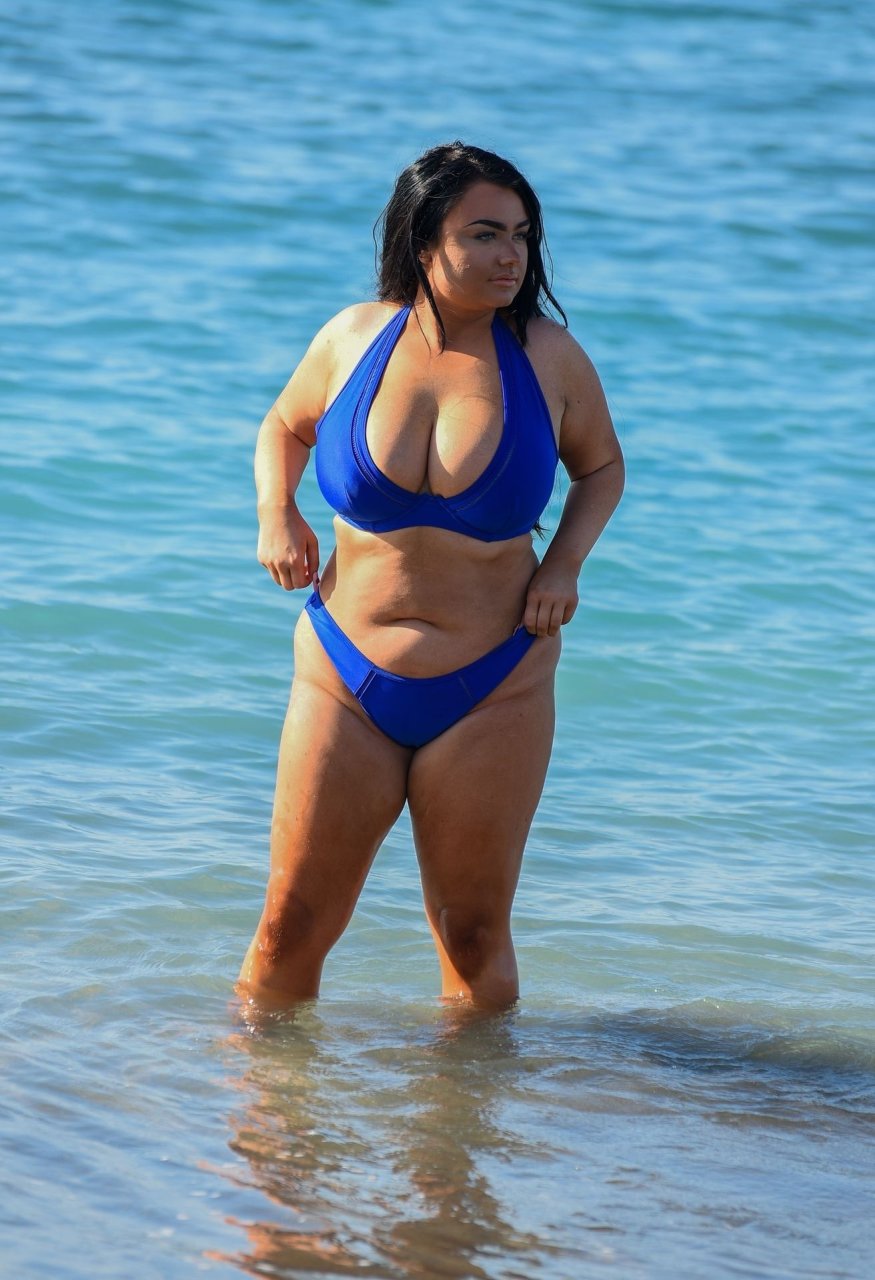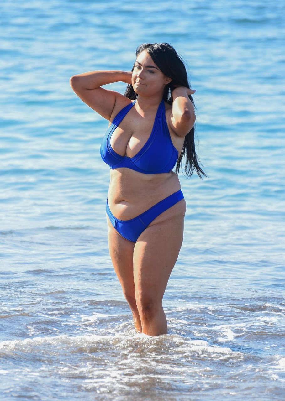 Linda morena, Faith Mullen do Geordie Shore exibe seu corpo de biquíni tamanho 16 em um biquíni azul durante as férias em Tenerife, 18/12/2018.