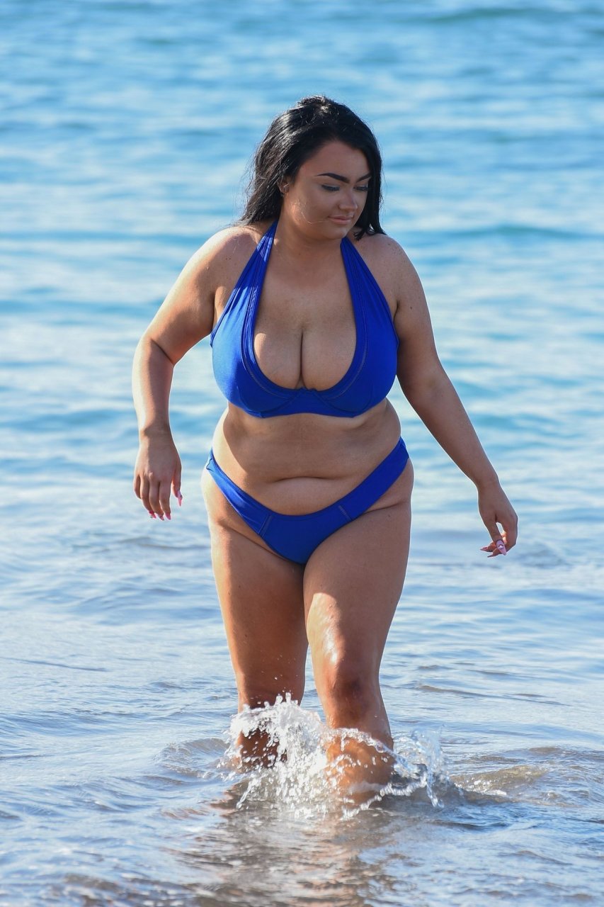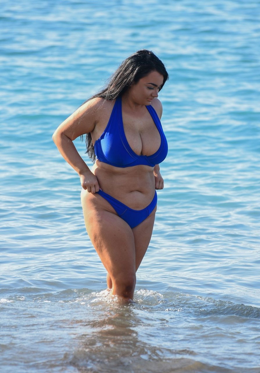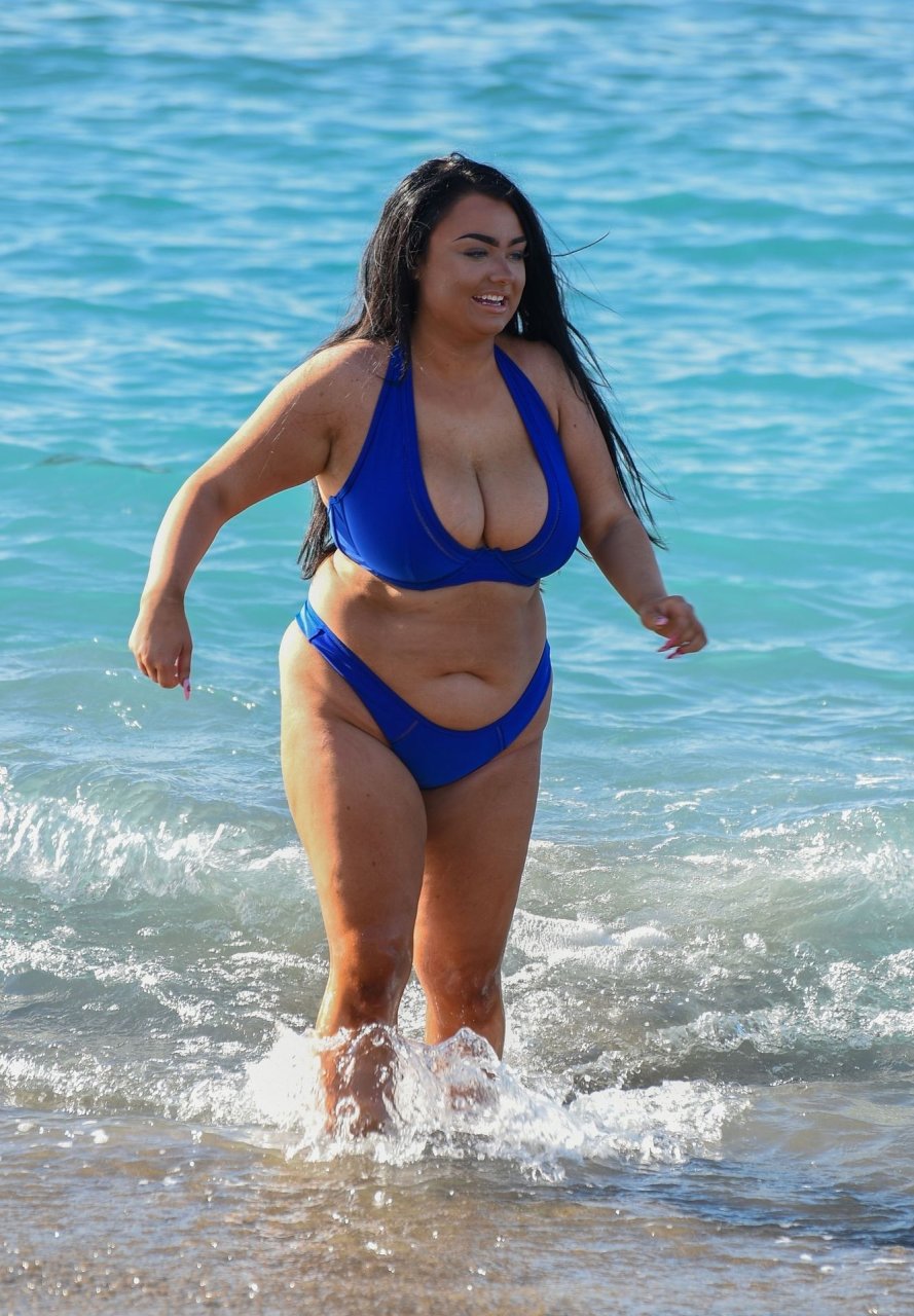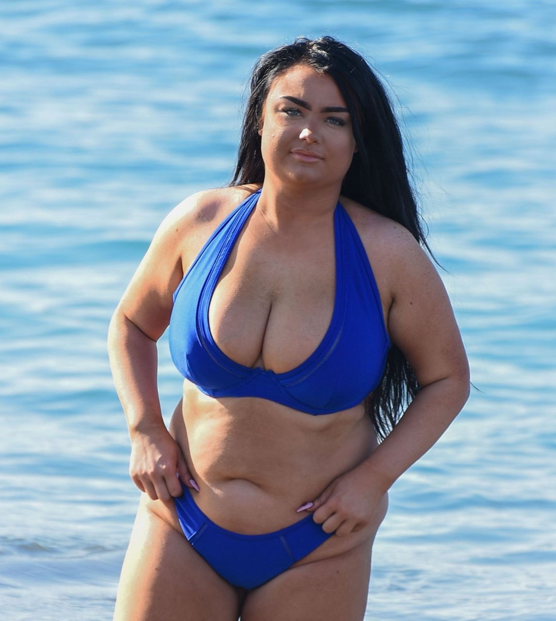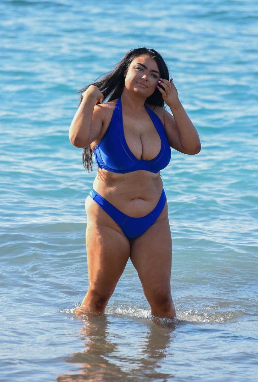 Linda morena, Faith Mullen do Geordie Shore exibe seu corpo de biquíni tamanho 16 em um biquíni azul durante as férias em Tenerife, 18/12/2018.