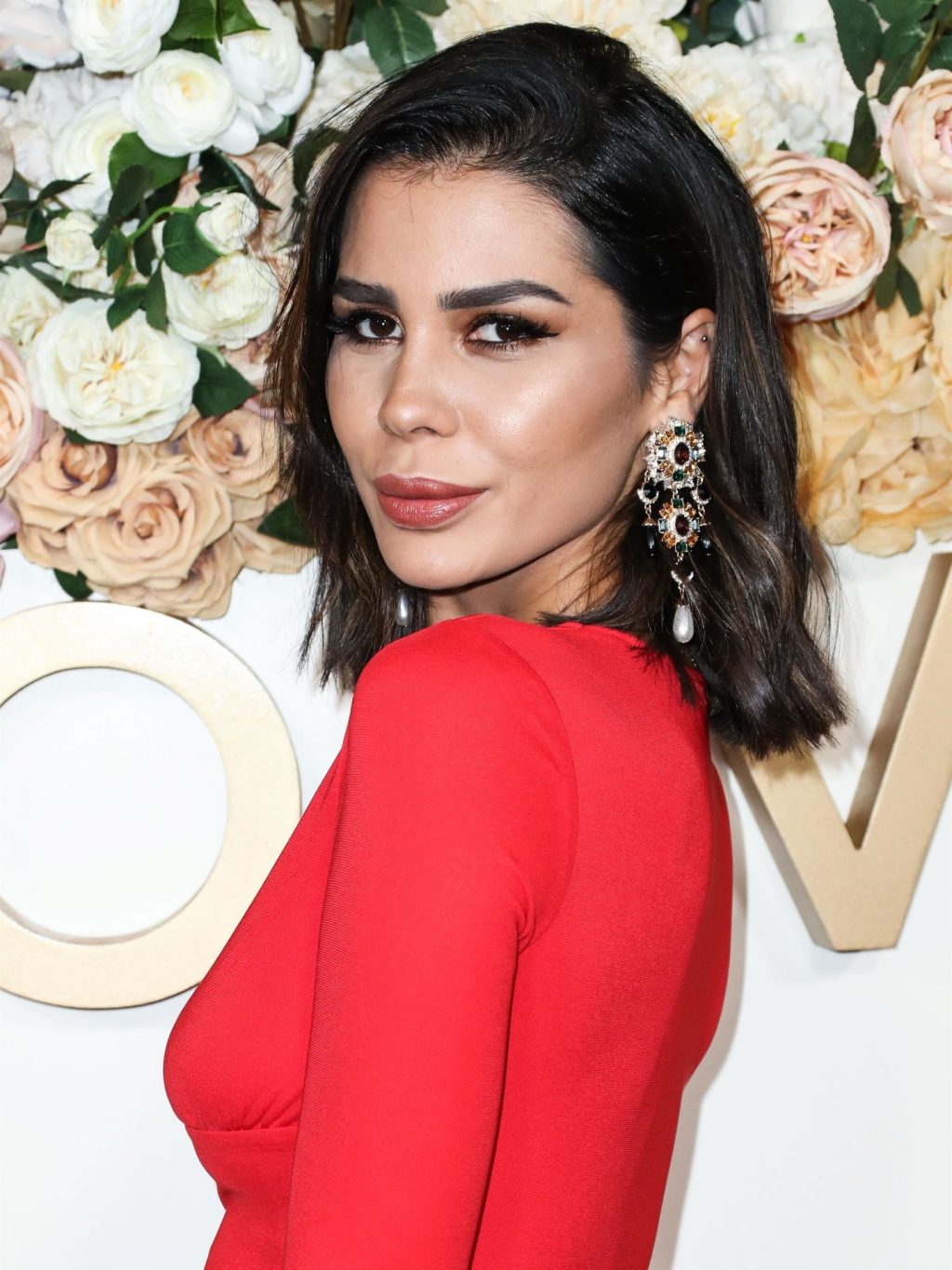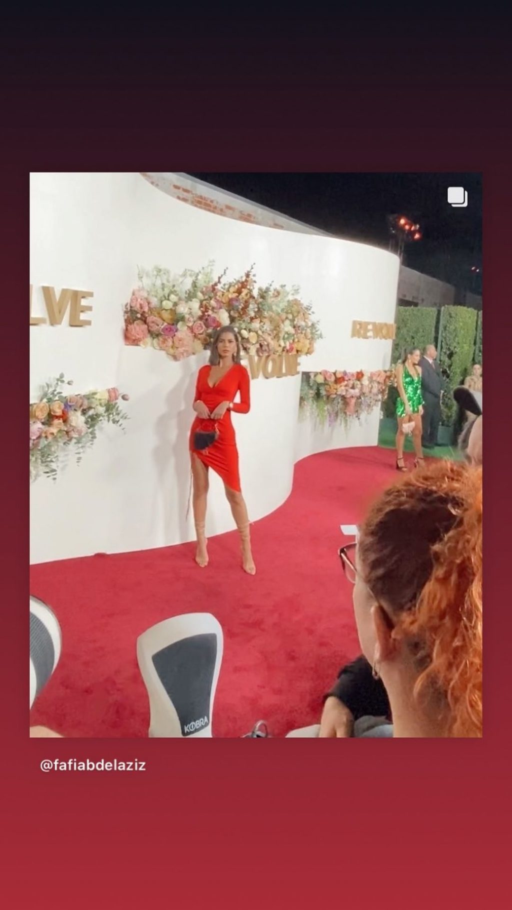 Farah Aziz exibiu suas pernas esbeltas e um belo decote enquanto posava com um vestido vermelho no 3º Annual #REVOLVEawards 2019 realizado no Goya Studios em Hollywood, Los Angeles, 15/11/2019.