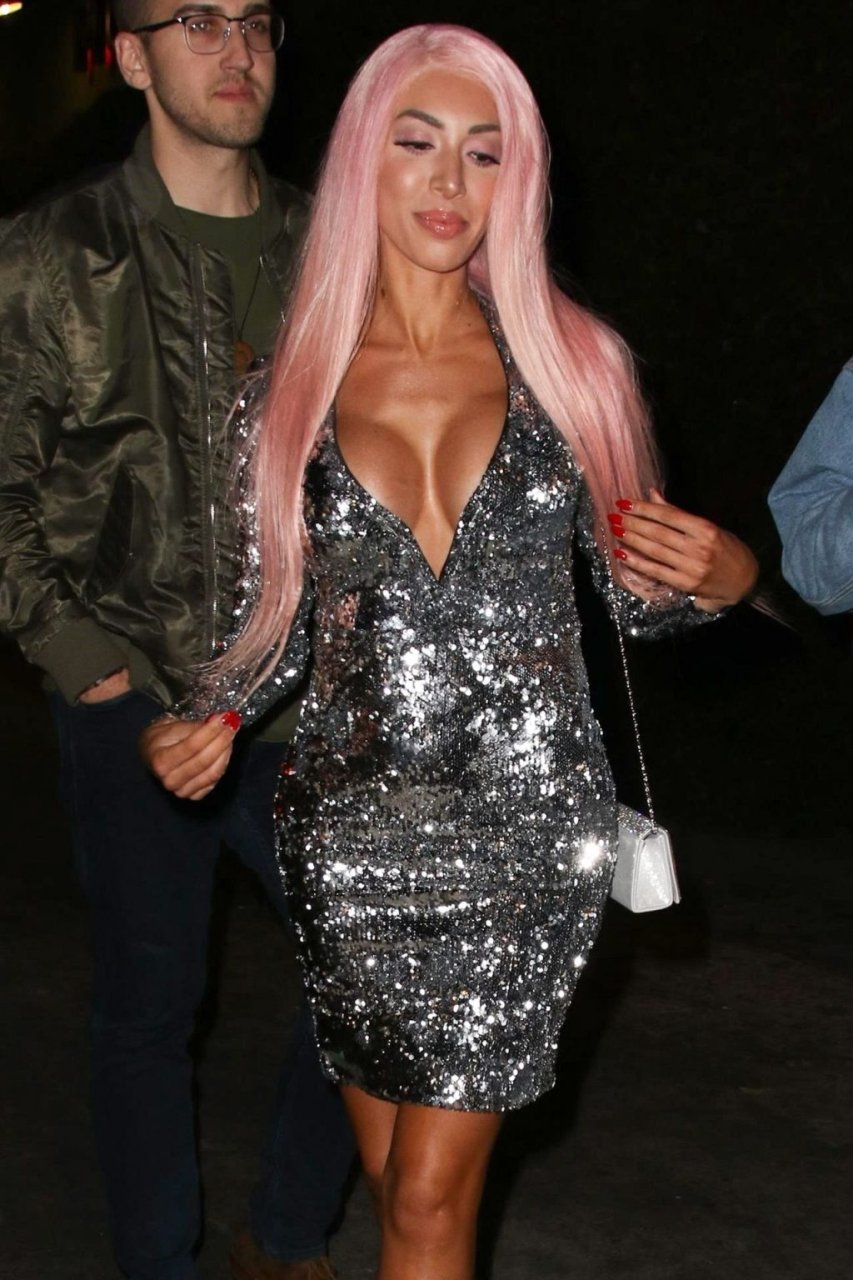Farrah Abraham brilha em prata no Academy Nightclub em Hollywood, 15/12/2018. A estrela de 27 anos de “Teen Mom” exibe seu visual sensual de férias com um vestido de lantejoulas, cabelo rosa e saltos de pele rosa combinando.