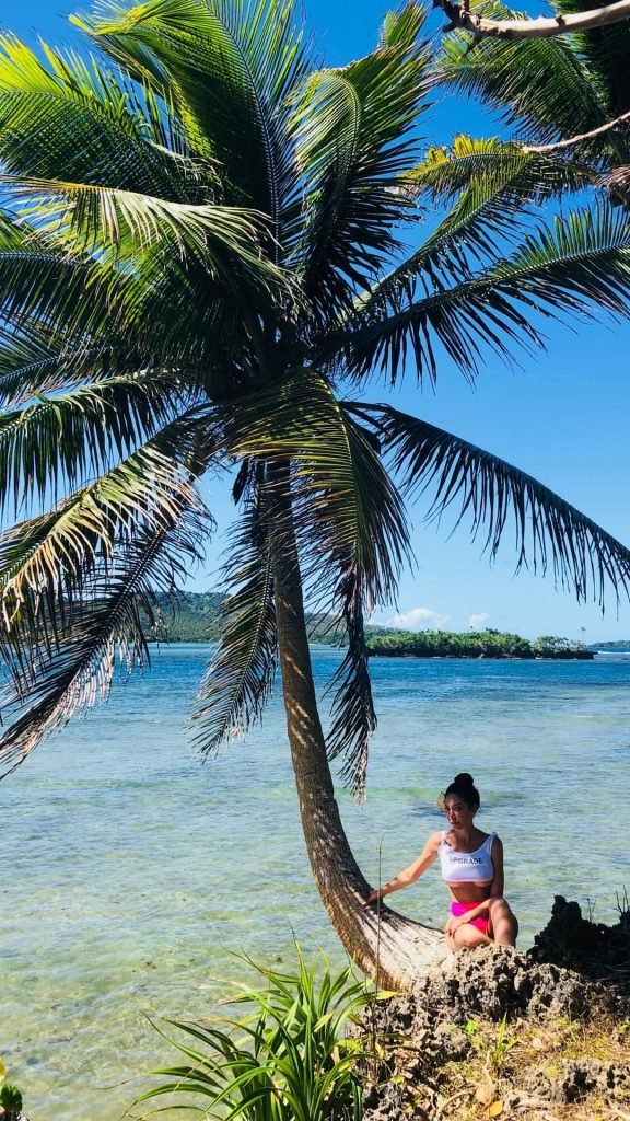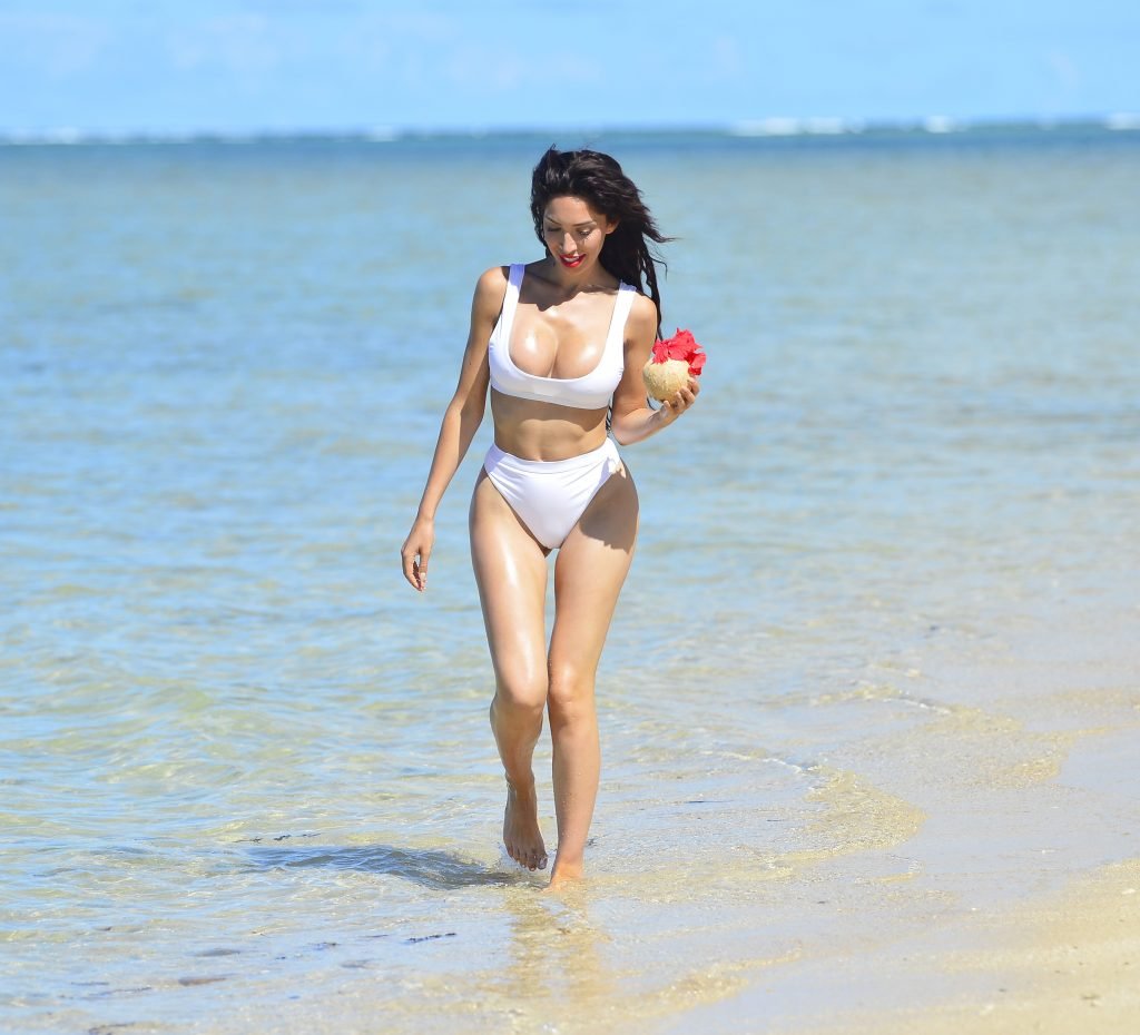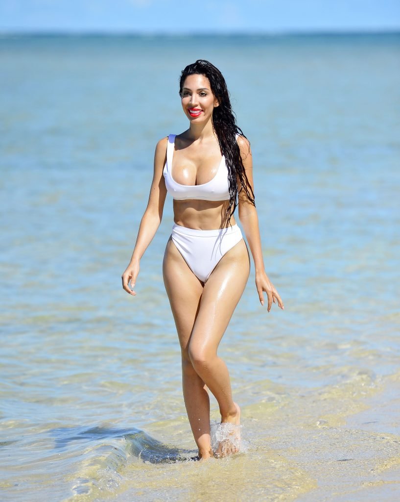 Farrah Abraham, 26, exibe seu corpo incrível enquanto aproveita o sol durante um dia na praia em Fiji, 05/05/2018. A estrela de reality show usava um biquíni branco, destacando seus grandes seios falsos e bumbum estilo Kardashian.