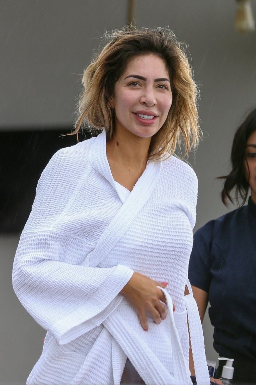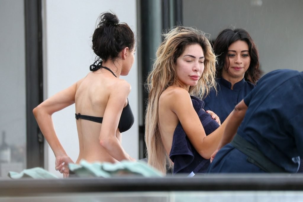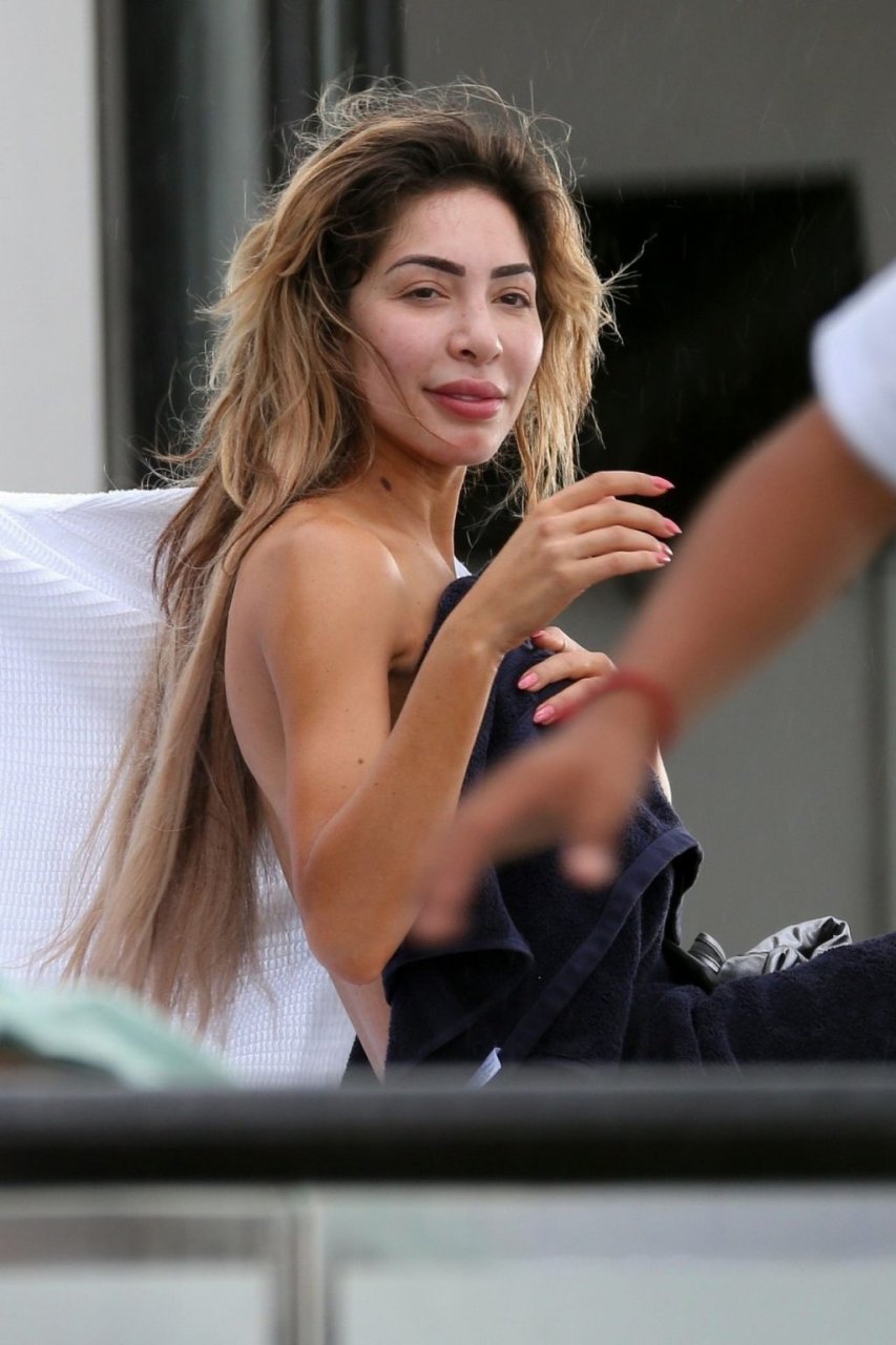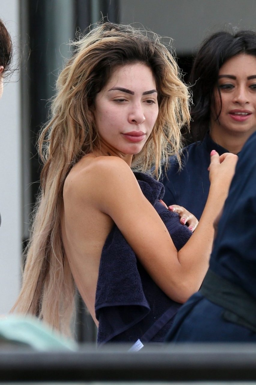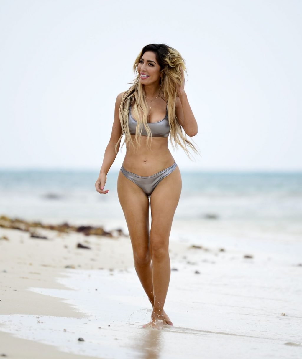 Farrah sports a skimpy metallic bikini as she showcases her new larger butt implants at the beach!