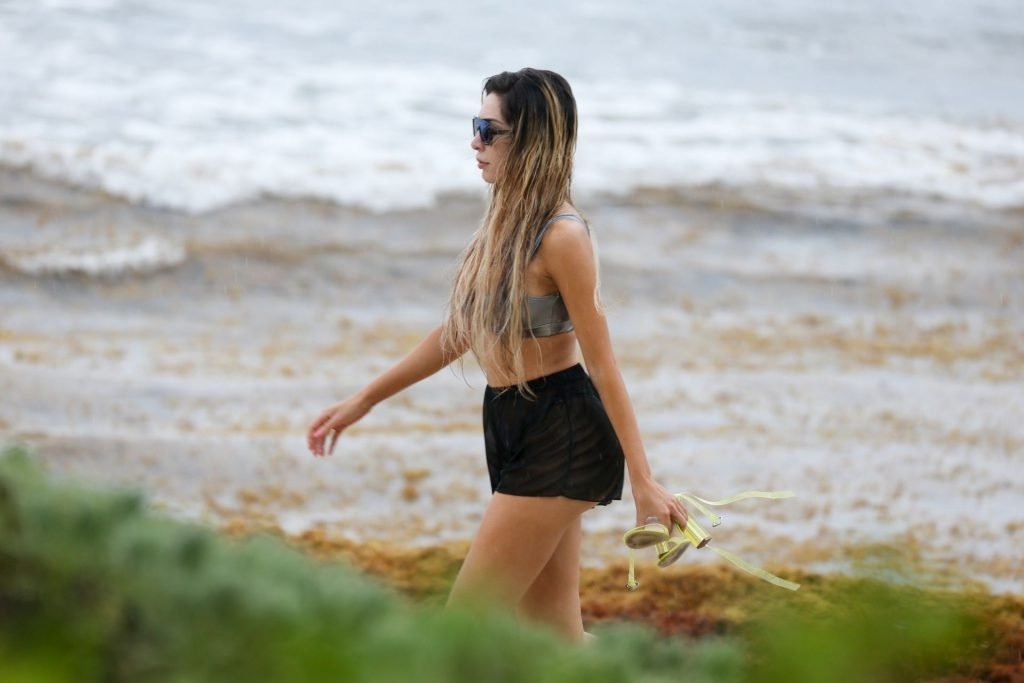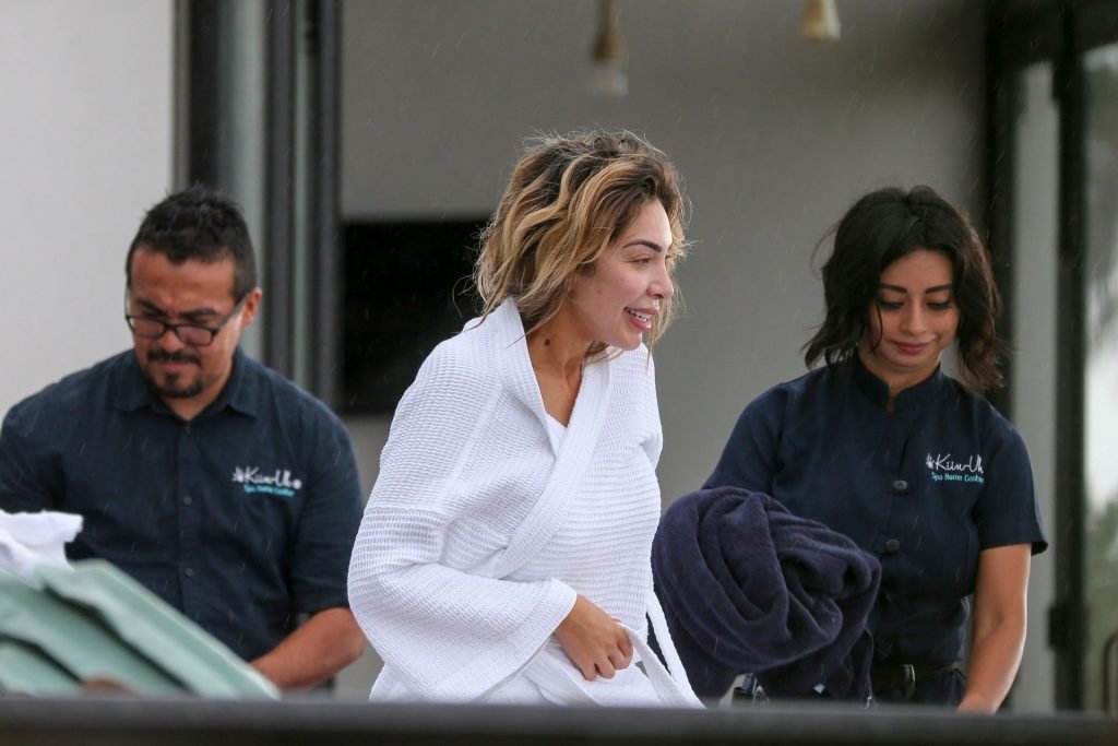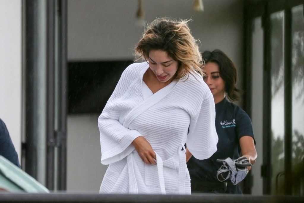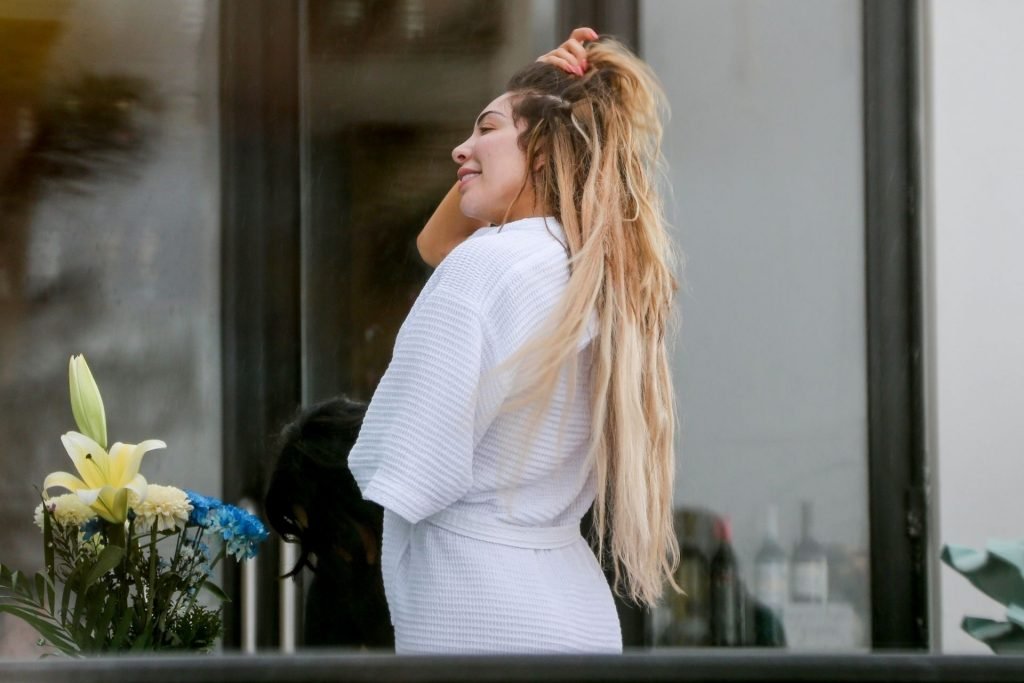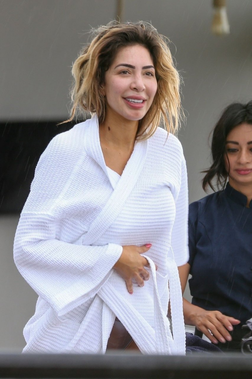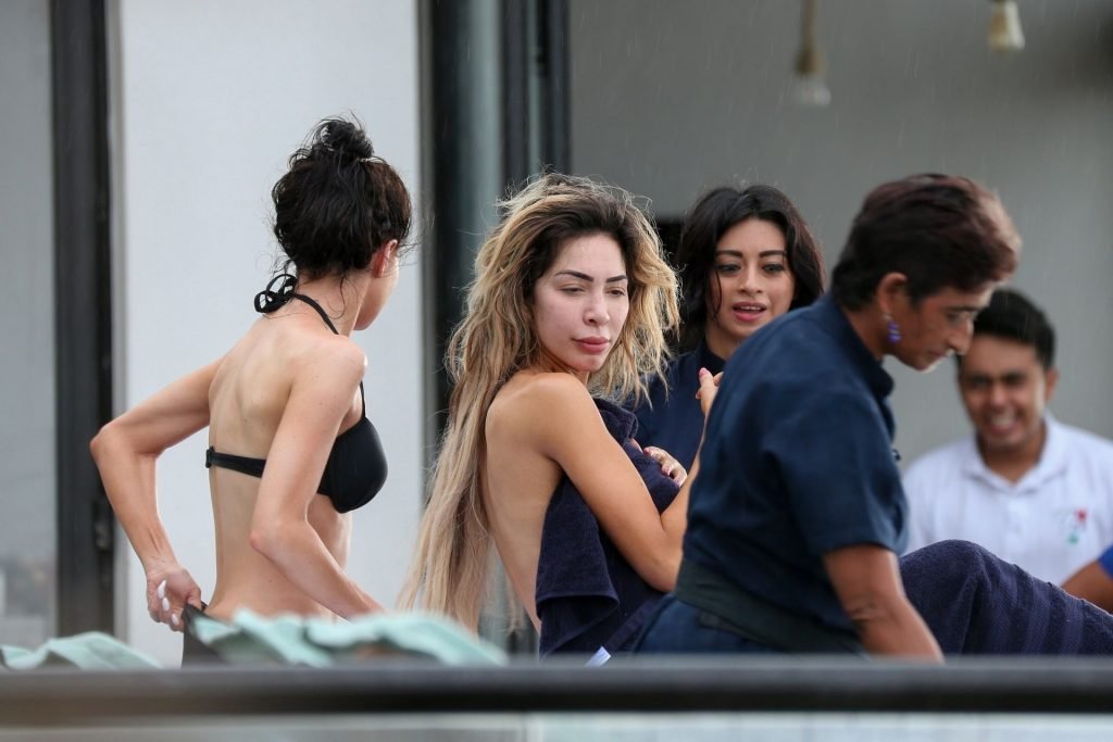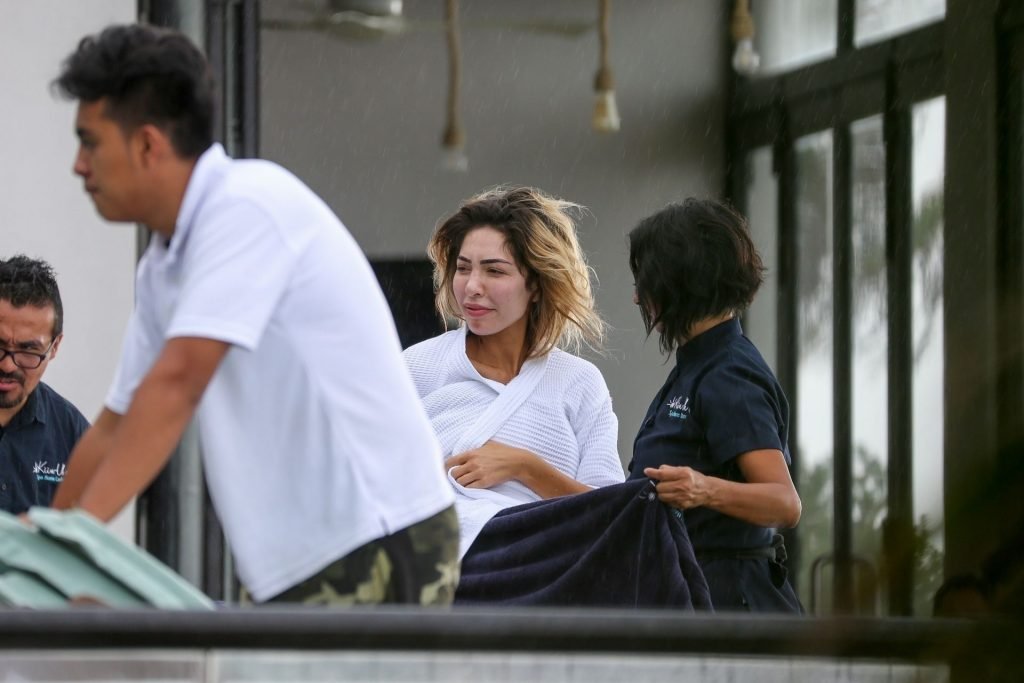Farrah Abraham aproveita um tempo livre em Tulum, México, com uma amiga, 11/04/2019. A estrela da realidade com rosto fresco estava recebendo uma massagem quando foi interrompida pela chuva. Farrah então troca para shorts transparentes e um top de biquíni enquanto volta para seu hotel à beira-mar.