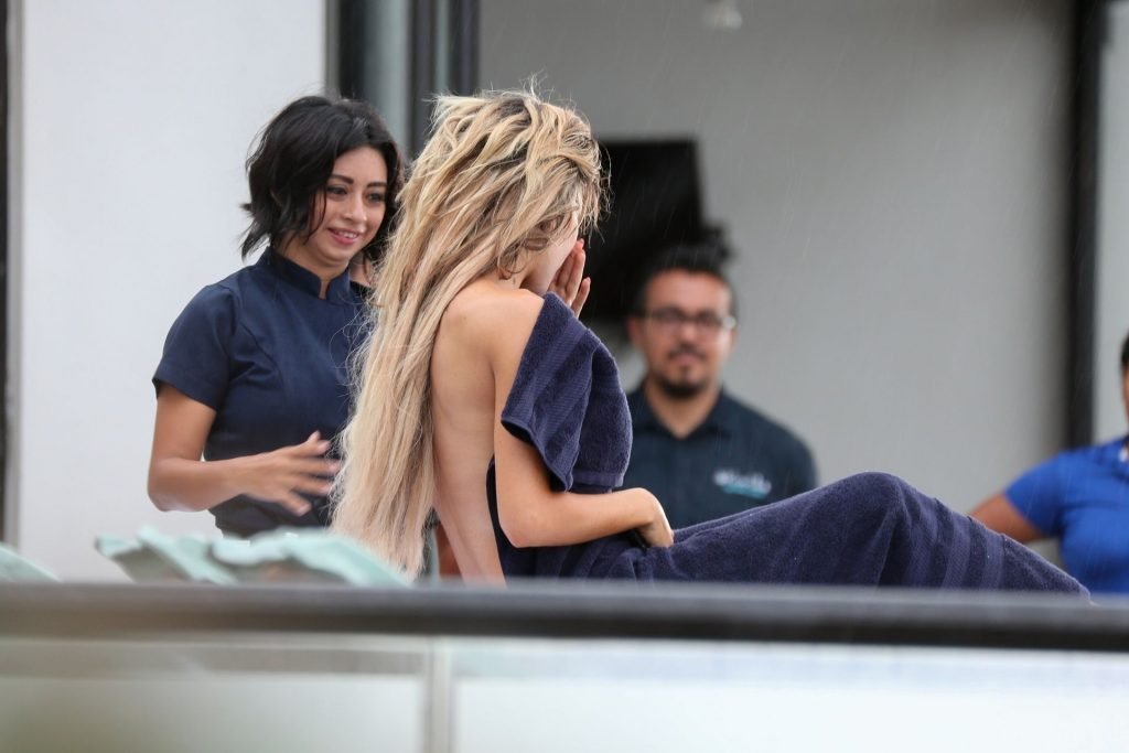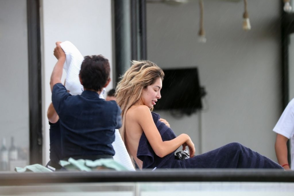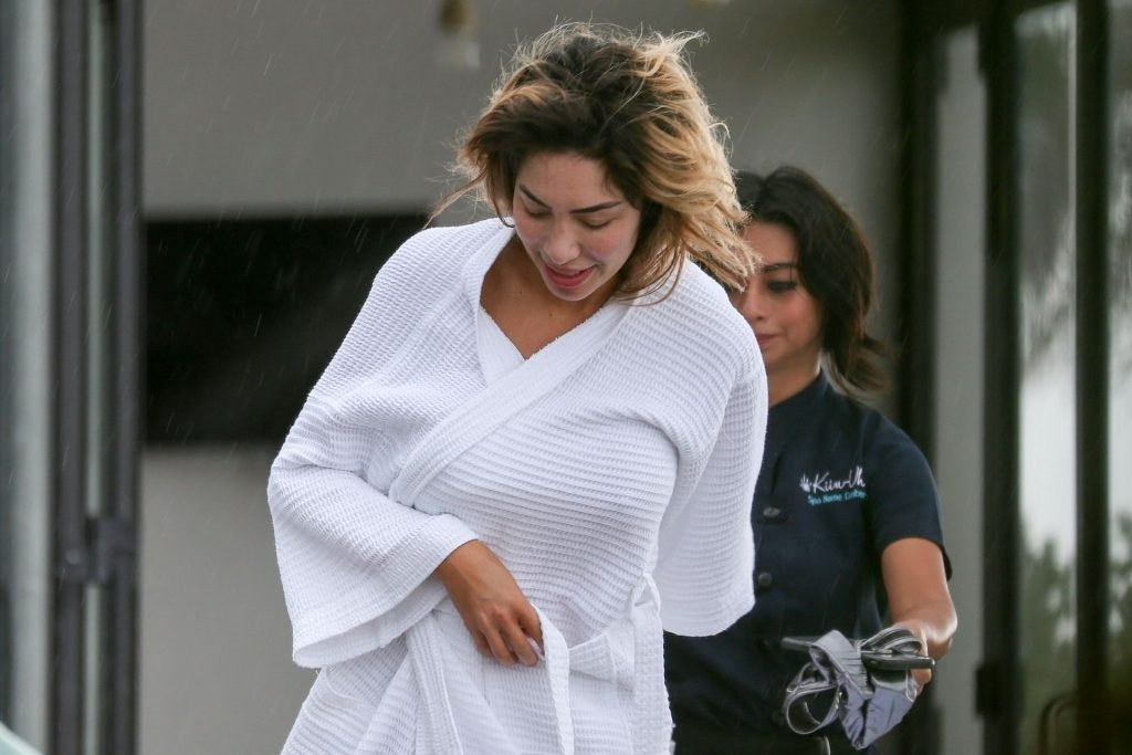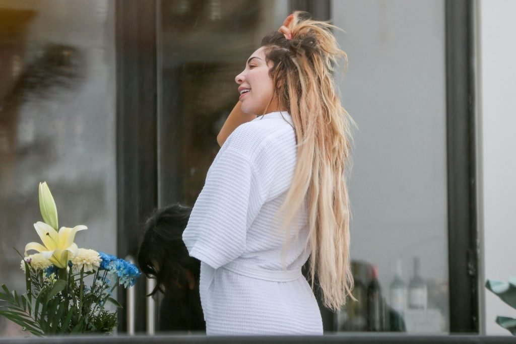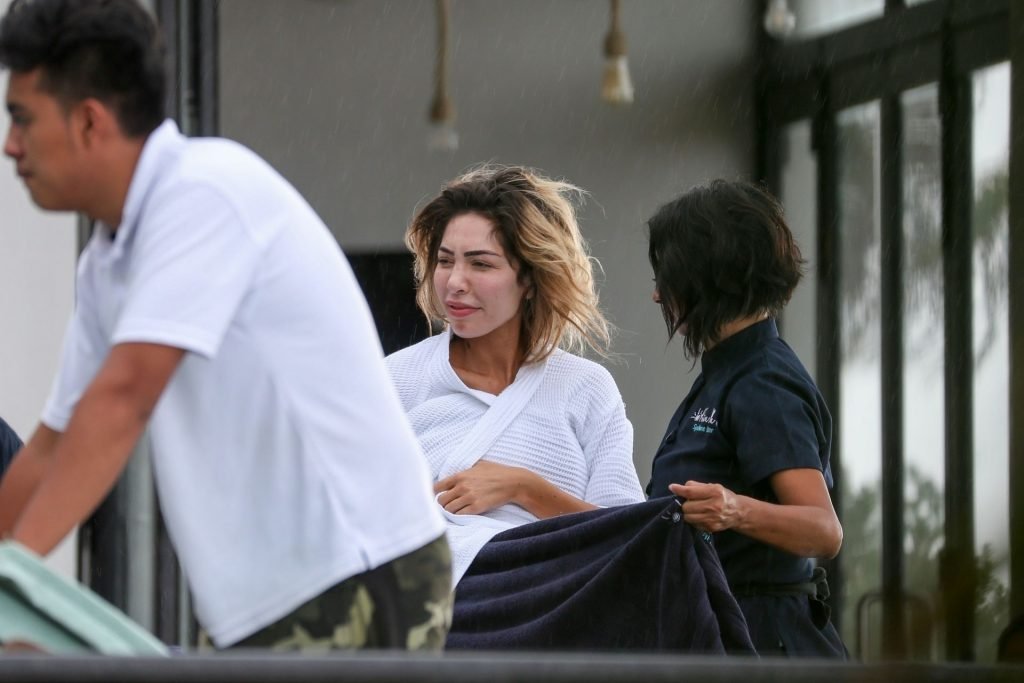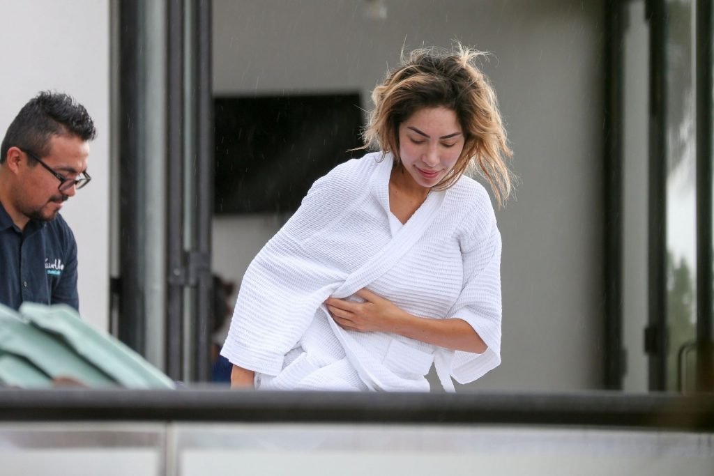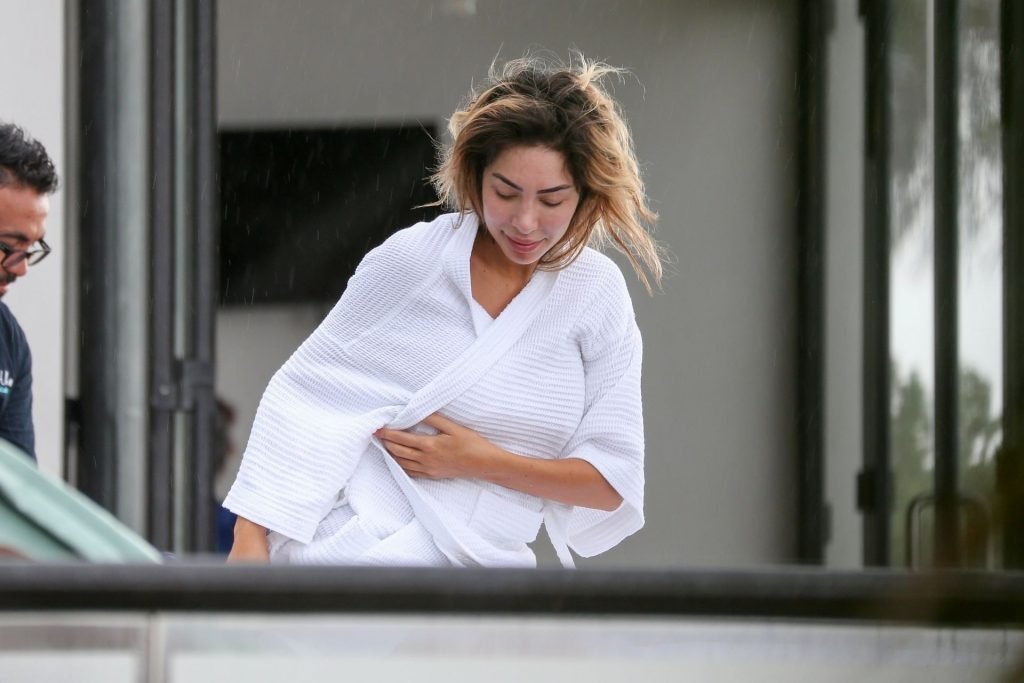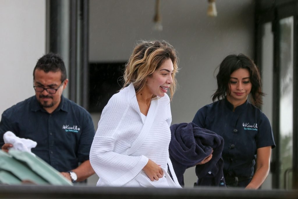 Farrah Abraham aproveita um tempo livre em Tulum, México, com uma amiga, 11/04/2019. A estrela da realidade com rosto fresco estava recebendo uma massagem quando foi interrompida pela chuva. Farrah então troca para shorts transparentes e um top de biquíni enquanto volta para seu hotel à beira-mar.