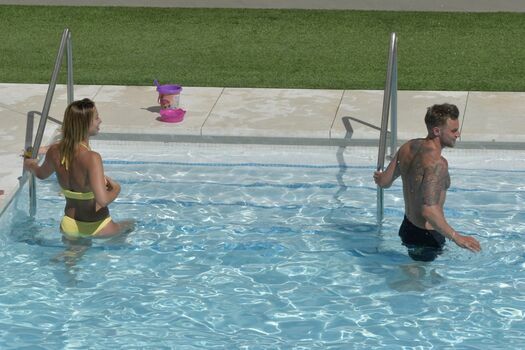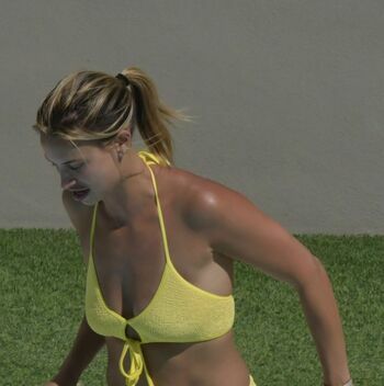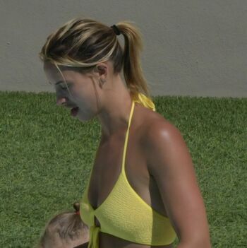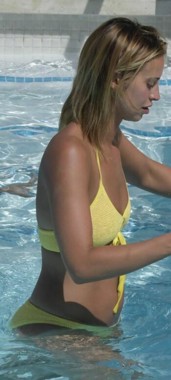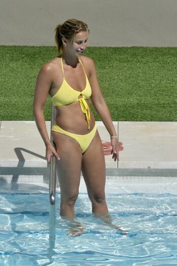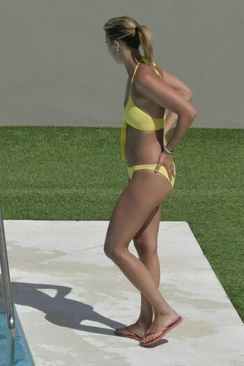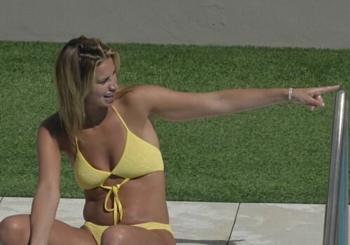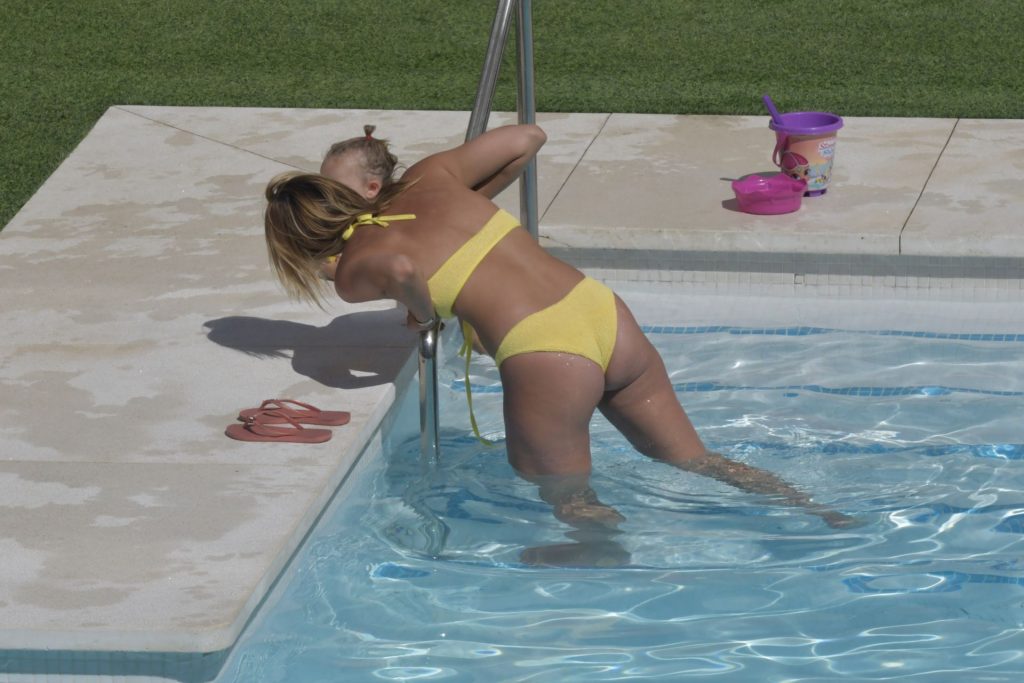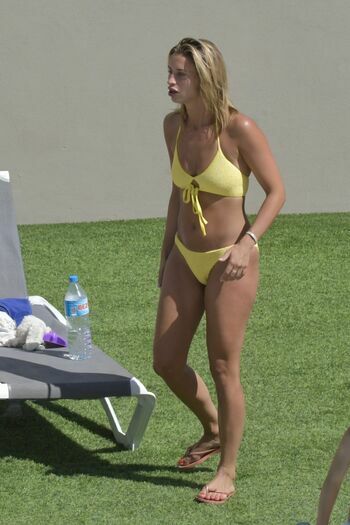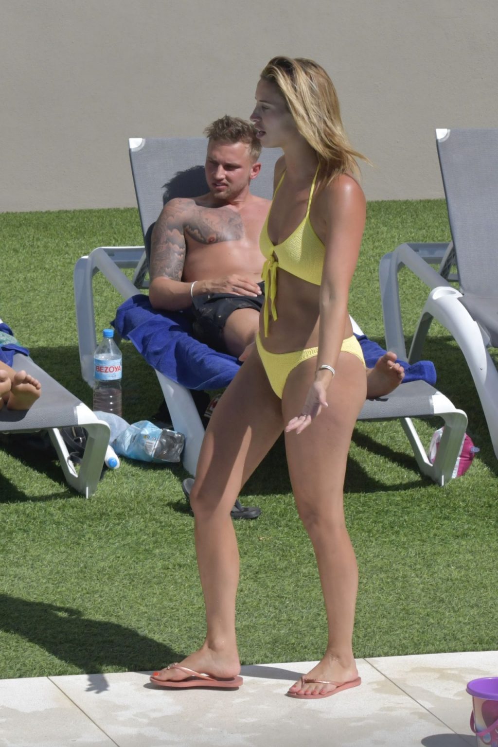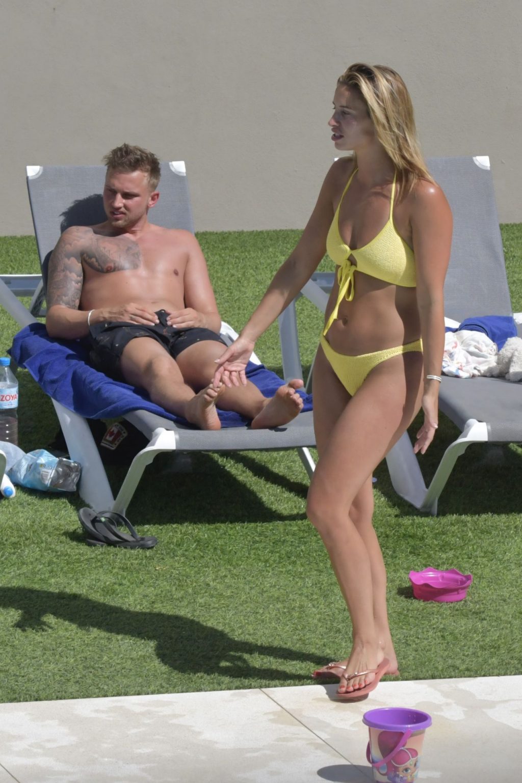 Ferne McCann exibe sua figura de supermodelo em um biquíni amarelo de duas peças enquanto relaxa na piscina durante as férias em Marbella, 29/07/2019.