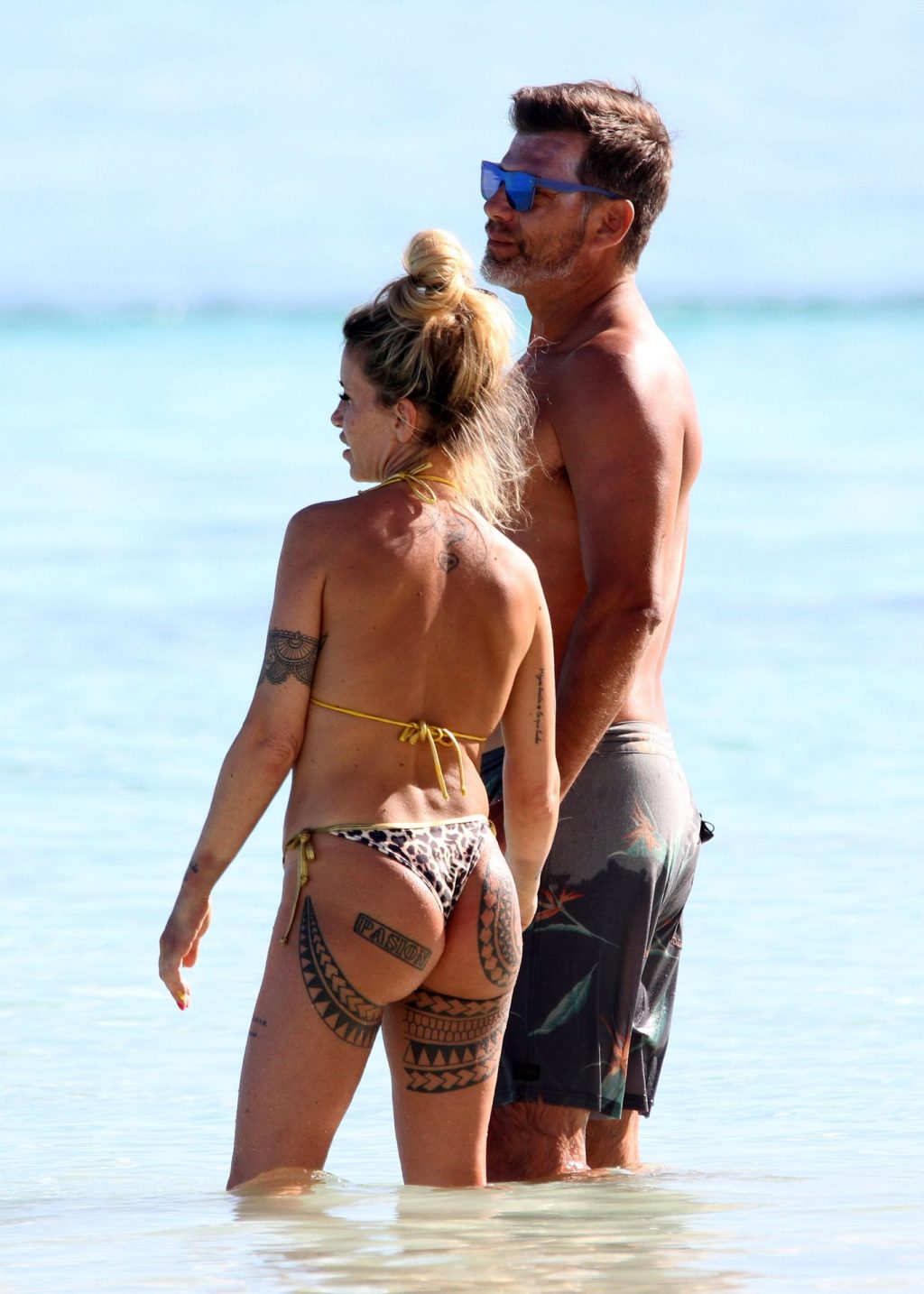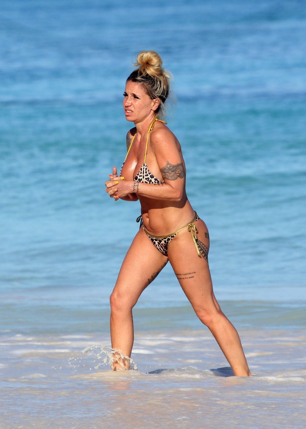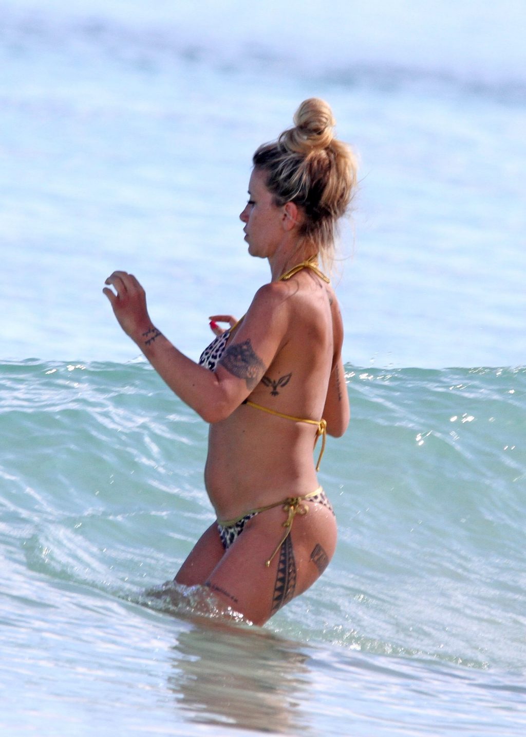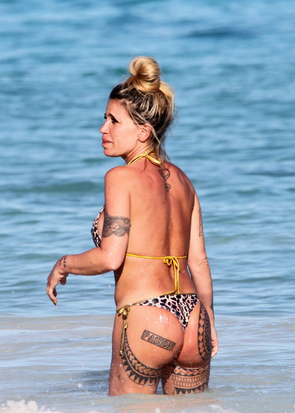 A atriz argentina Florencia Peña usa um biquíni estampado de onça enquanto é vista aproveitando a praia durante as férias no México, 31/12/2019.