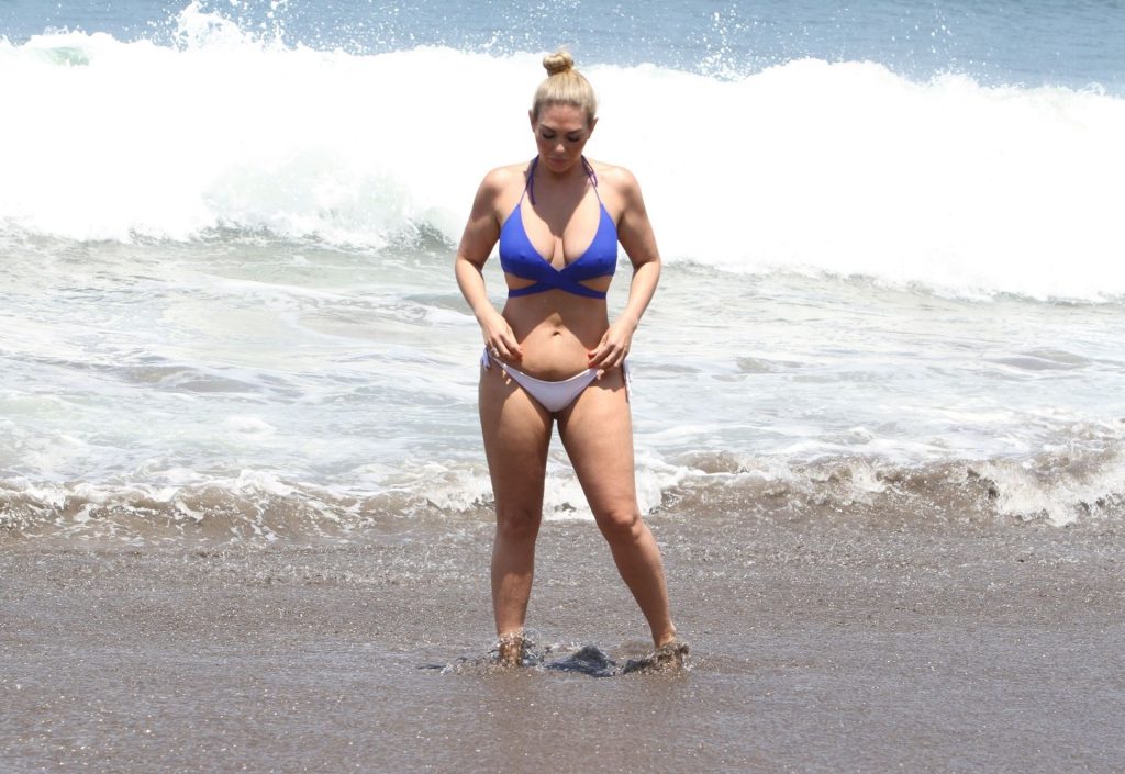 Reality star Frankie Essex exibe sua perda de 2 pedras em um top de biquíni azul e calcinha branca durante férias em Tenerife, 01/01/2020.