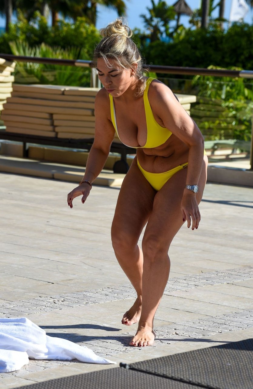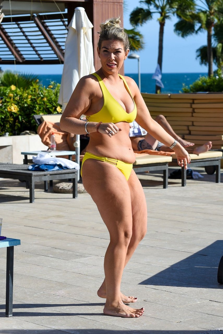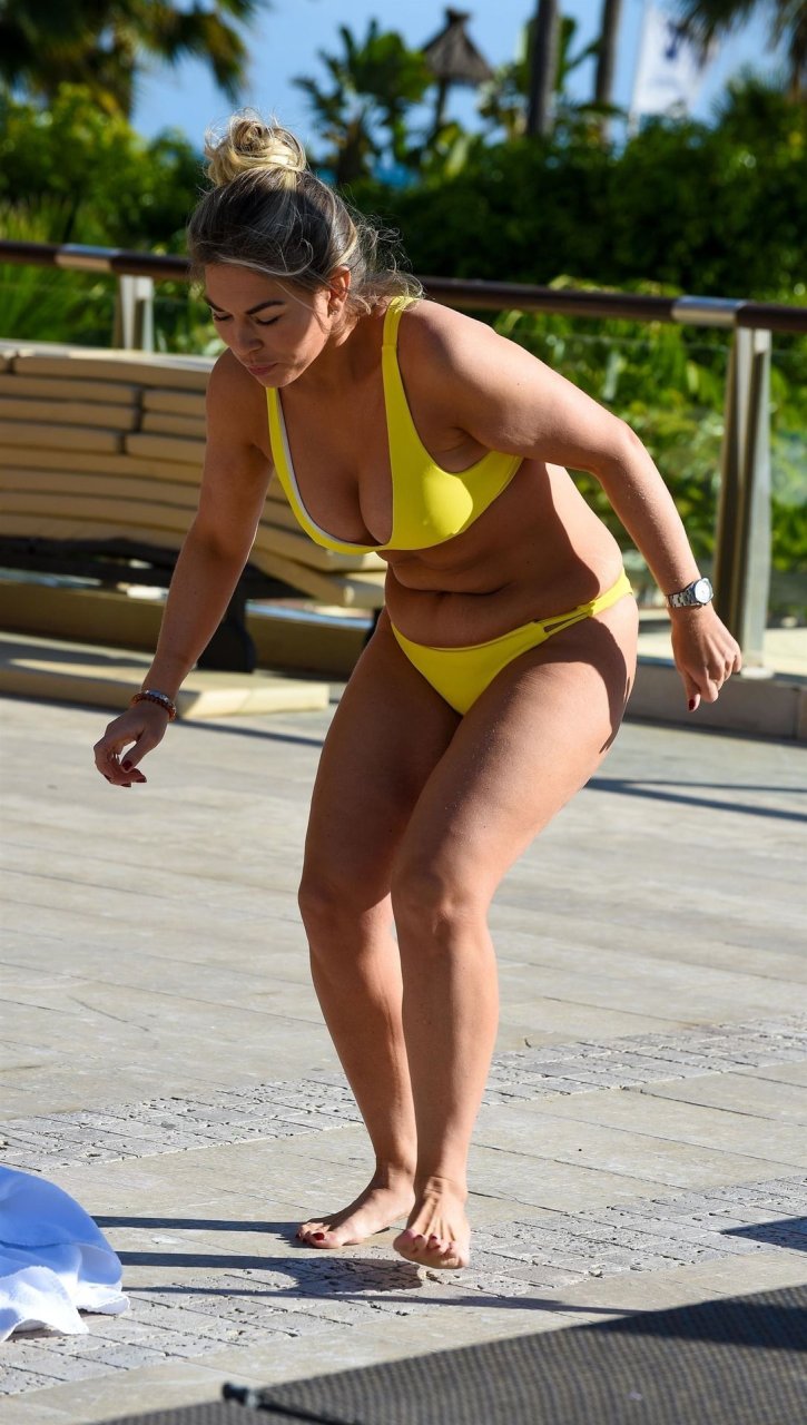 A estrela do TOWIE, Frankie Essex, foi vista de férias em Tenerife, 02/03/2019. Foi revelado ontem que Frankie tem sido alvo de hackers online, juntamente com outras celebridades Katie Price e Chloe Sims, que afirmam ter fotos do Fappening da sua cirurgia de aumento dos seios. Frankie foi vista usando um biquíni amarelo exibindo seu corpo curvilíneo ao redor da piscina.