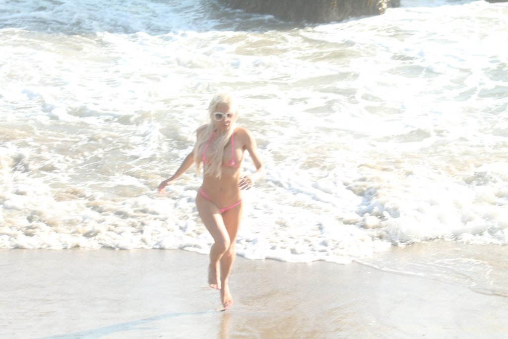 “Celebrity Big Brother” estrela Frenchy Morgan (43) foi vista usando um biquíni rosa minúsculo enquanto corria na praia em Malibu, 29/10/2018.