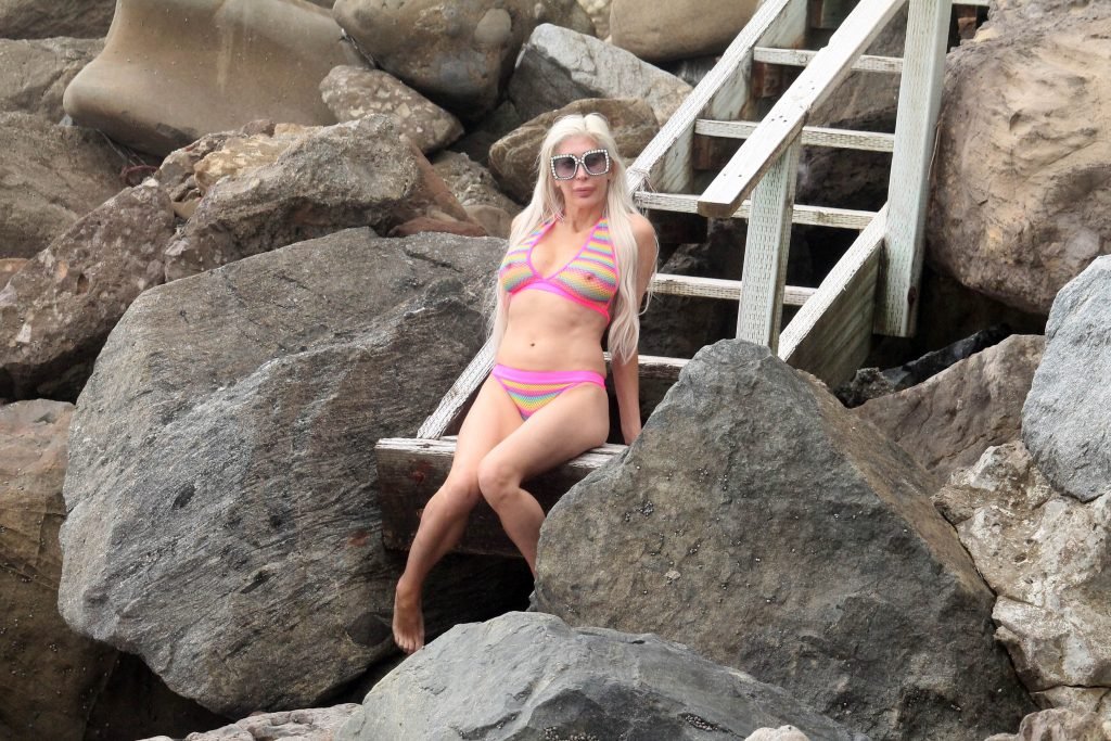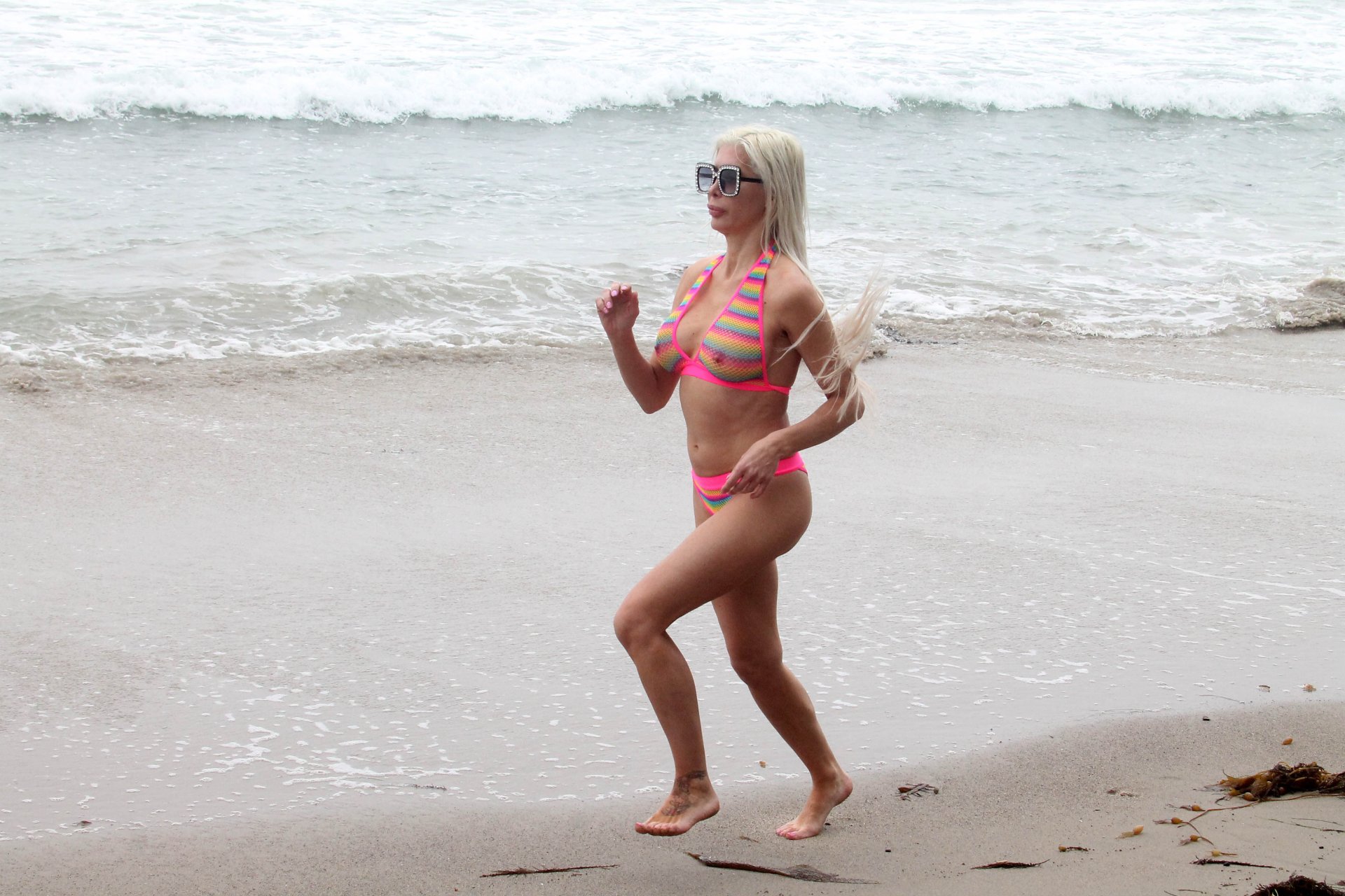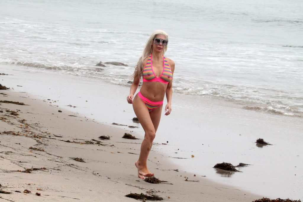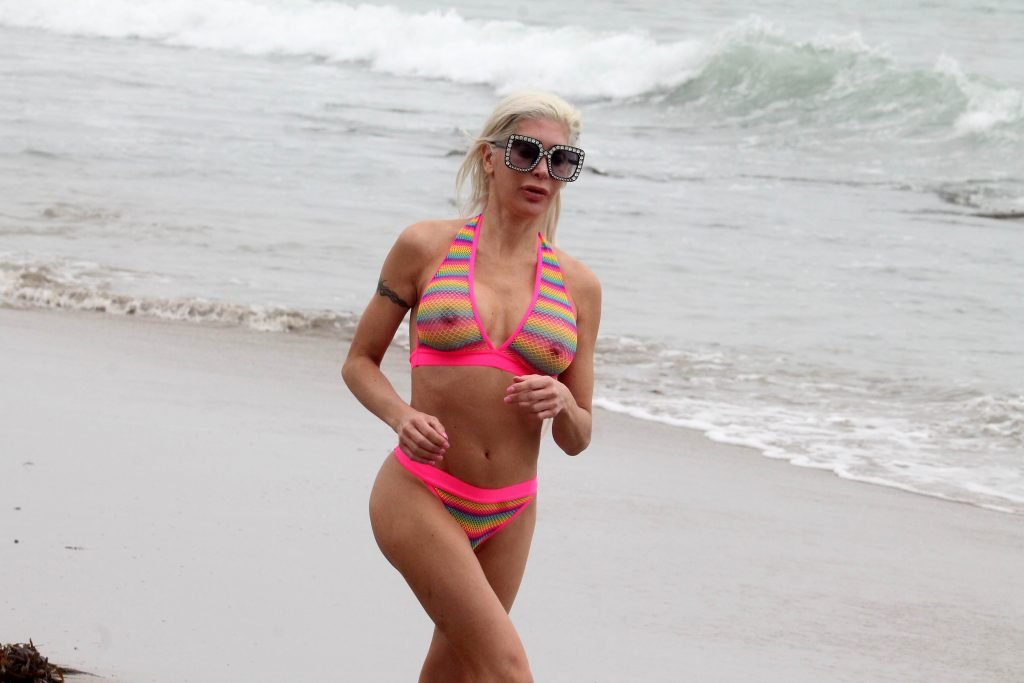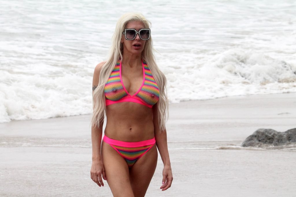 A estrela de reality show Frenchy Morgan, 42, vista com um biquíni colorido de malha transparente na Praia de Malibu, 08/05/2018. A loira milf exibiu seus grandes seios falsos, pernas esbeltas e bunda velha e firme.