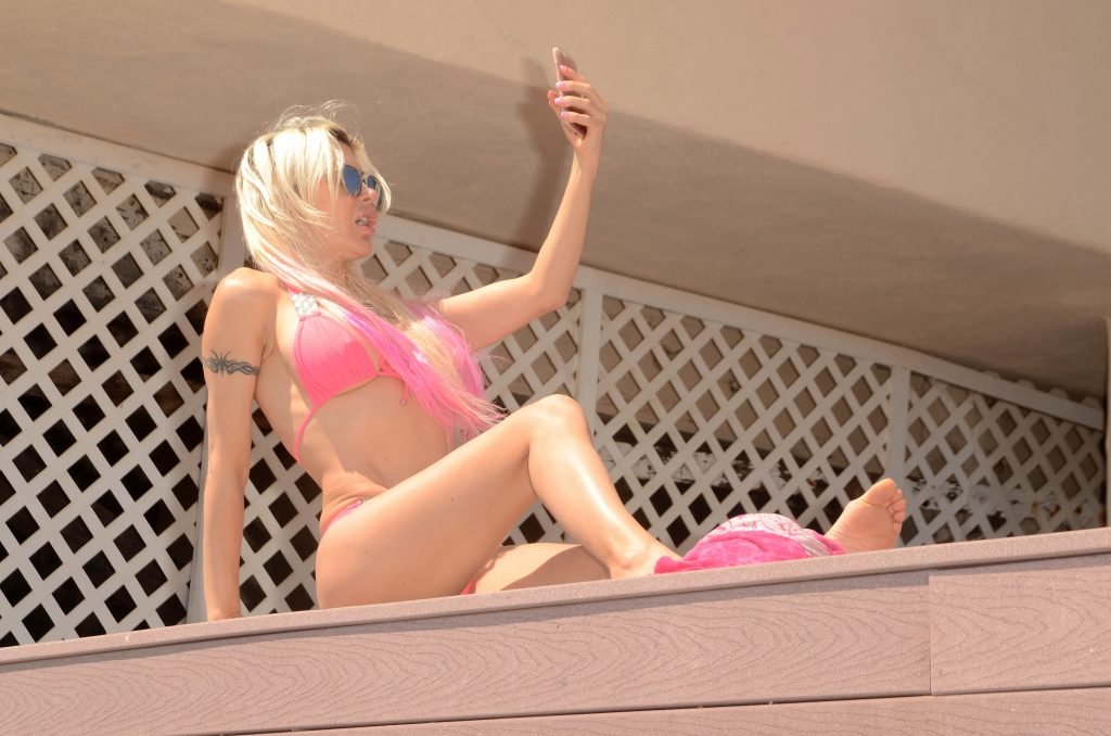 Frenchy Morgan vista de biquíni rosa tirando selfies em Malibu, 09/05/2017. Angelique “Frenchy” Morgan é uma personalidade de reality show (Celebrity Big Brother), atriz, modelo & dançarina de Paris. Idade – 41.