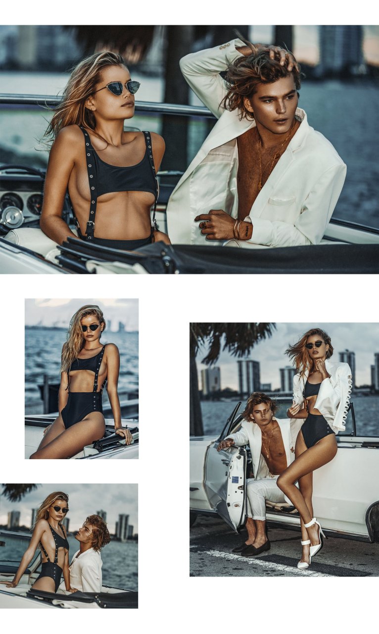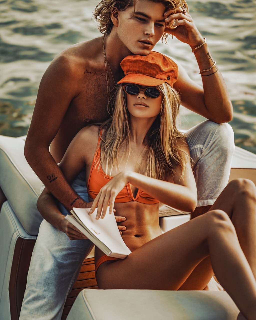 Modelos Frida Aasen e Jordan Barrett fotografados por Kesler Tran para a campanha Fristelser da Fae Swim (Primavera/Verão 2018). Frida Aasen é uma top model de 23 anos de Kristiansand, Noruega.