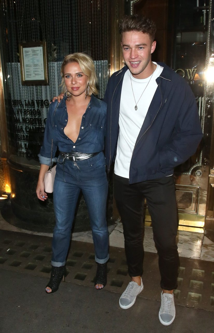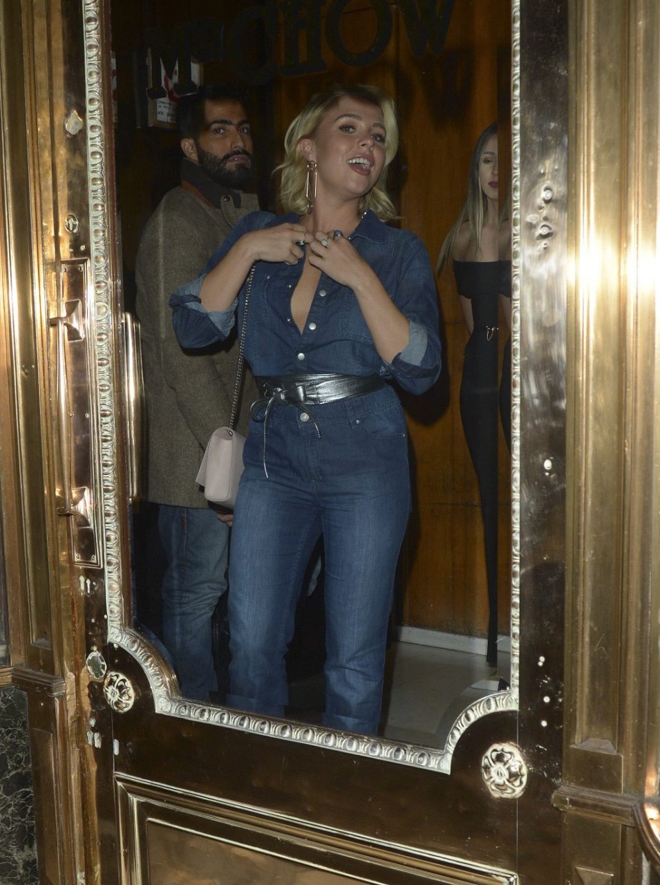 Reality TV star Gabby Allen (26) fotografada saindo do restaurante Mr. Chow em Knightsbridge, Londres, 09/12/2018. Gabby estava sem sutiã, vestindo uma camisa jeans aberta com botões, jeans azul e sapatos pretos de bico aberto.