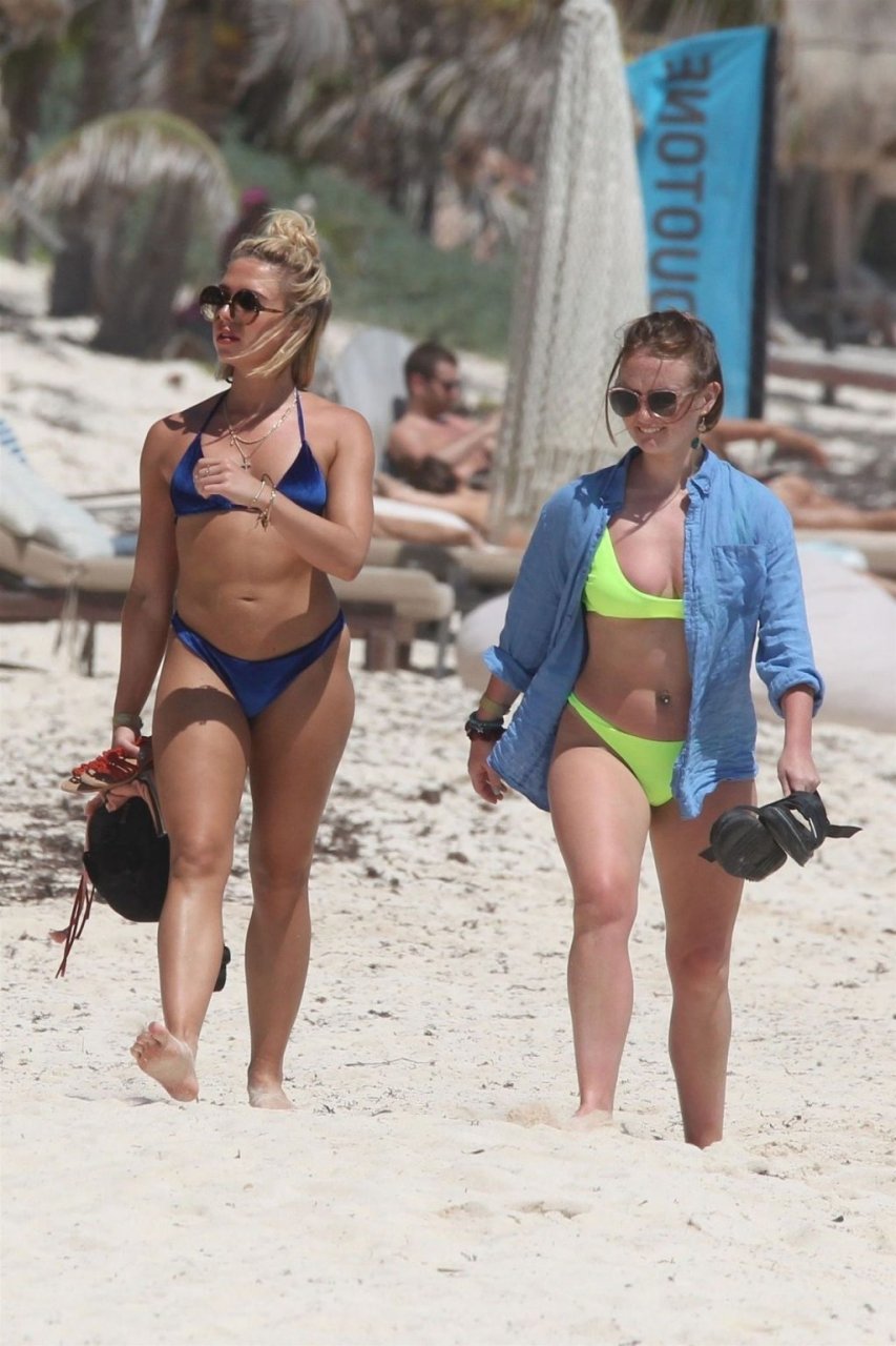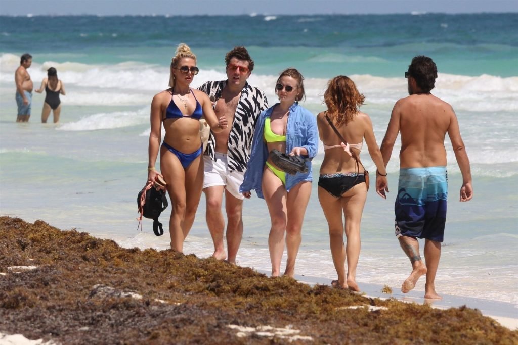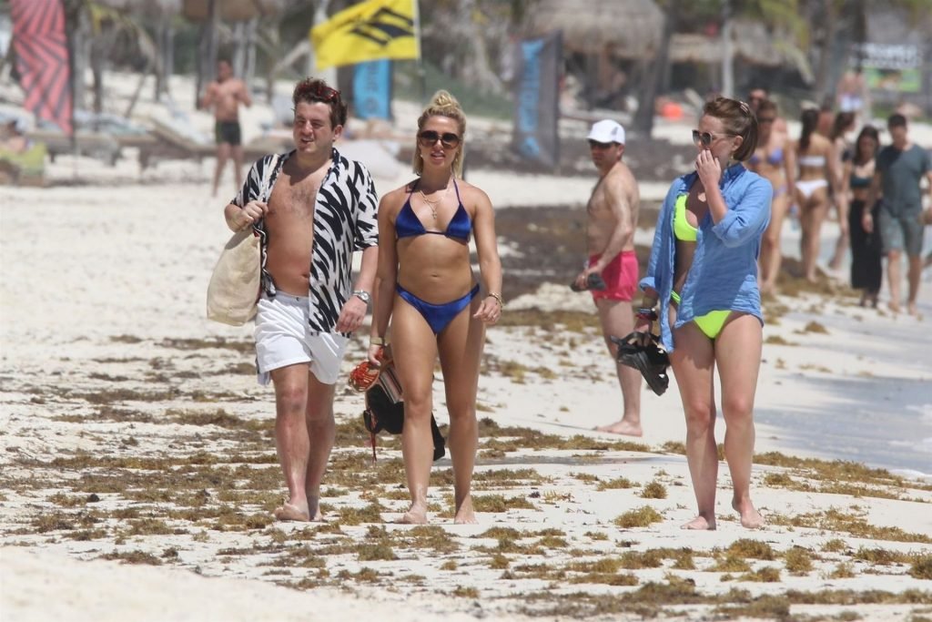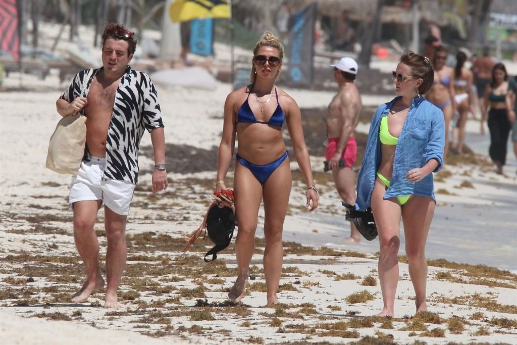 Gabby Allen de Love Island e alguns amigos aproveitam um dia na praia durante as férias em Tulum, México, 08/03/2019. Gabby exibiu seu corpo tonificado em um biquíni laranja antes de trocar para um biquíni azul.
