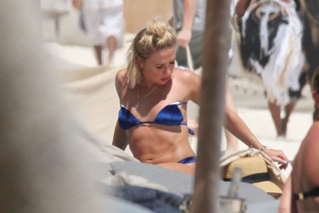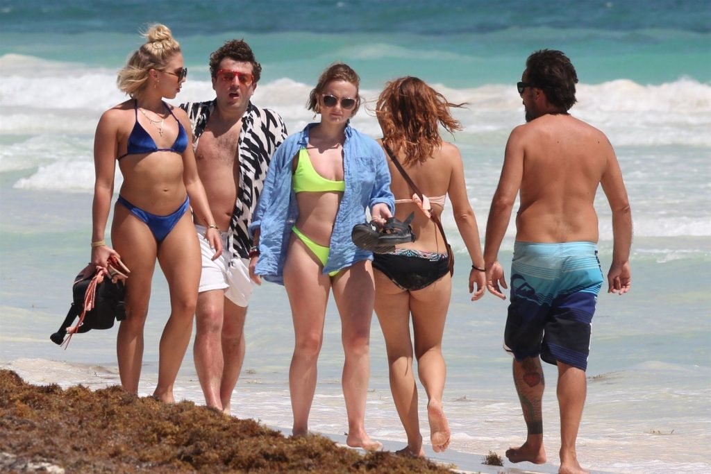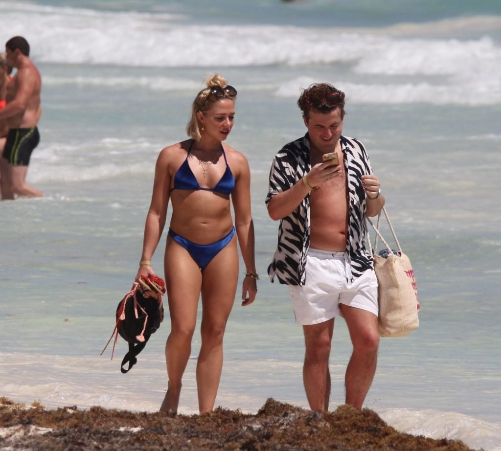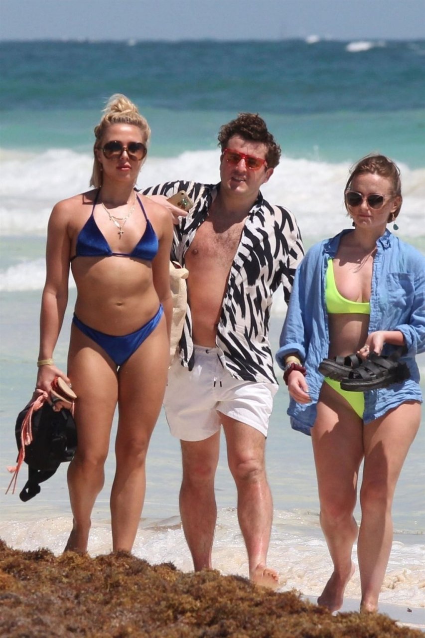 Gabby Allen de Love Island e alguns amigos aproveitam um dia na praia durante as férias em Tulum, México, 08/03/2019. Gabby exibiu seu corpo tonificado em um biquíni laranja antes de trocar para um biquíni azul.