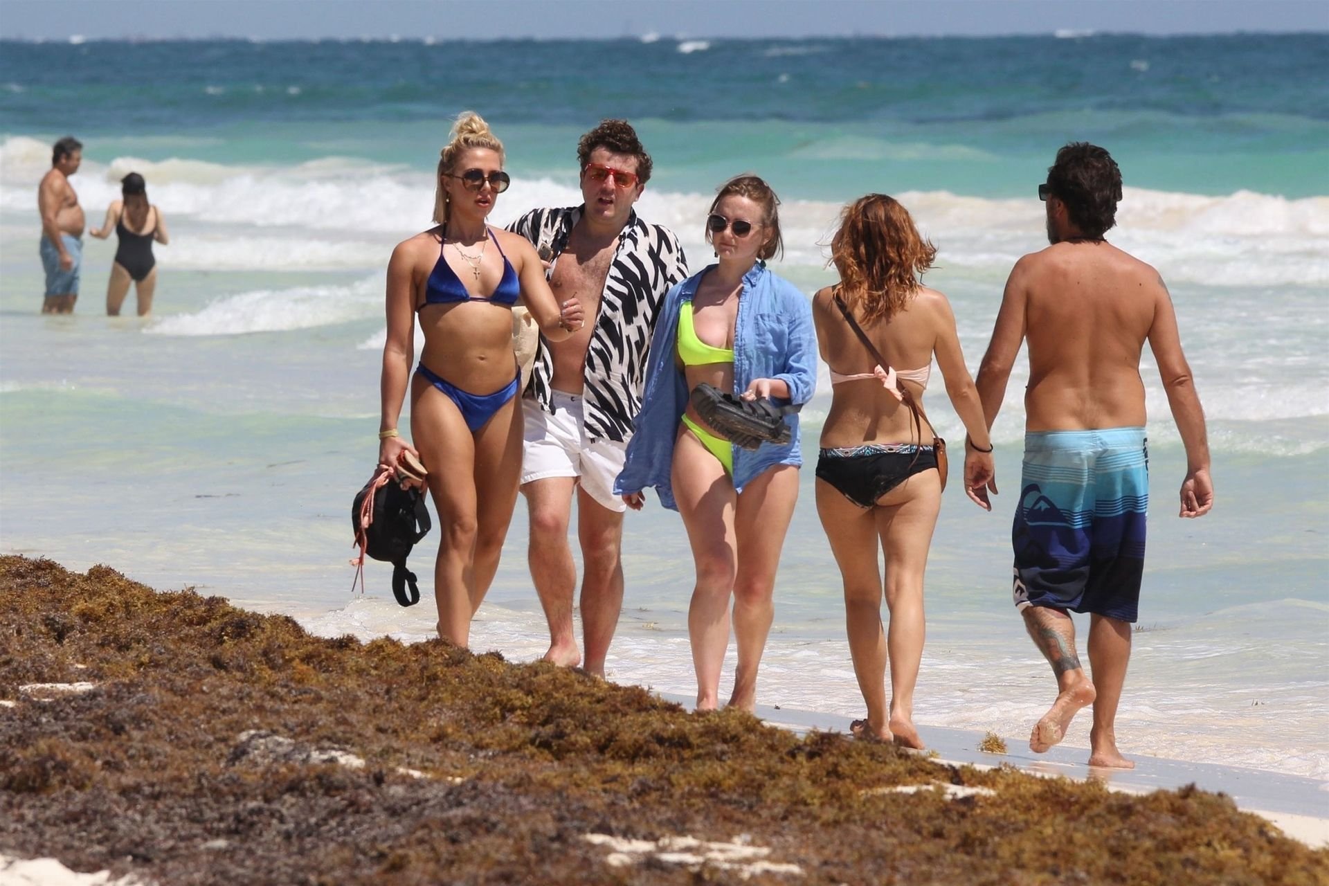 Gabby Allen de Love Island e alguns amigos aproveitam um dia na praia durante as férias em Tulum, México, 08/03/2019. Gabby exibiu seu corpo tonificado em um biquíni laranja antes de trocar para um biquíni azul.