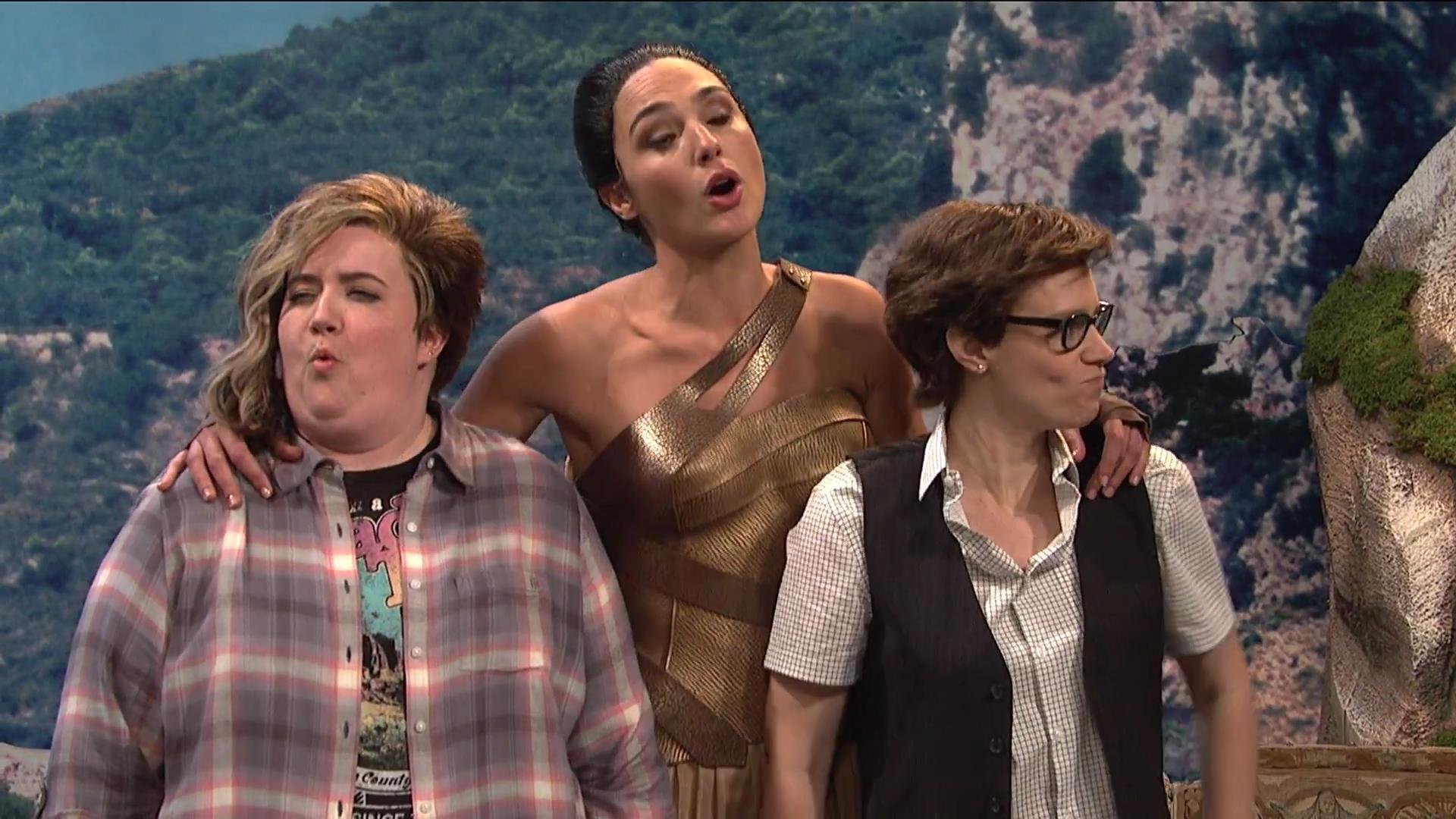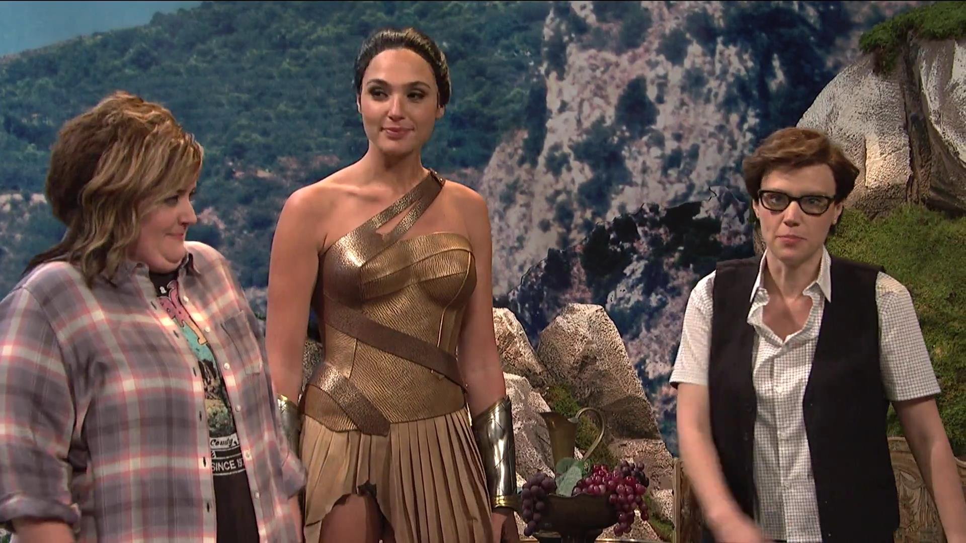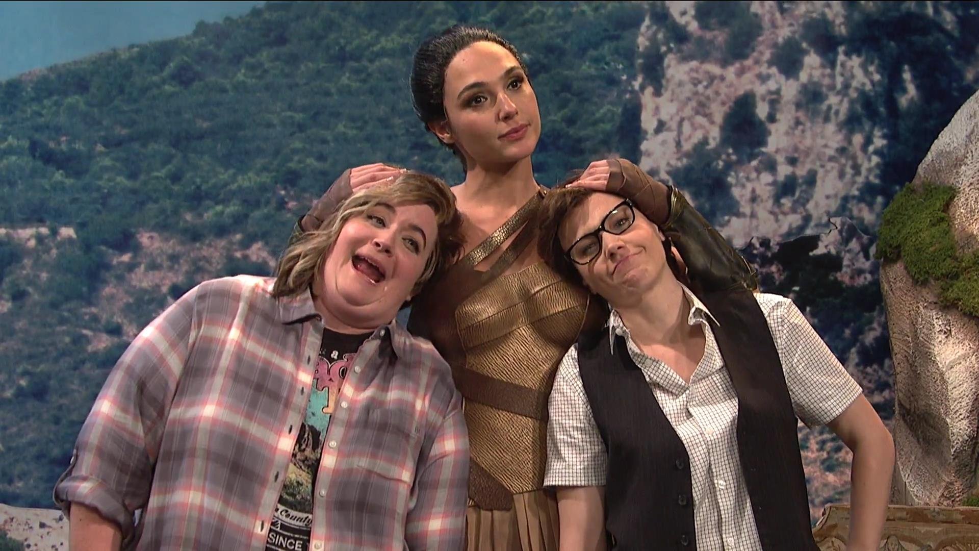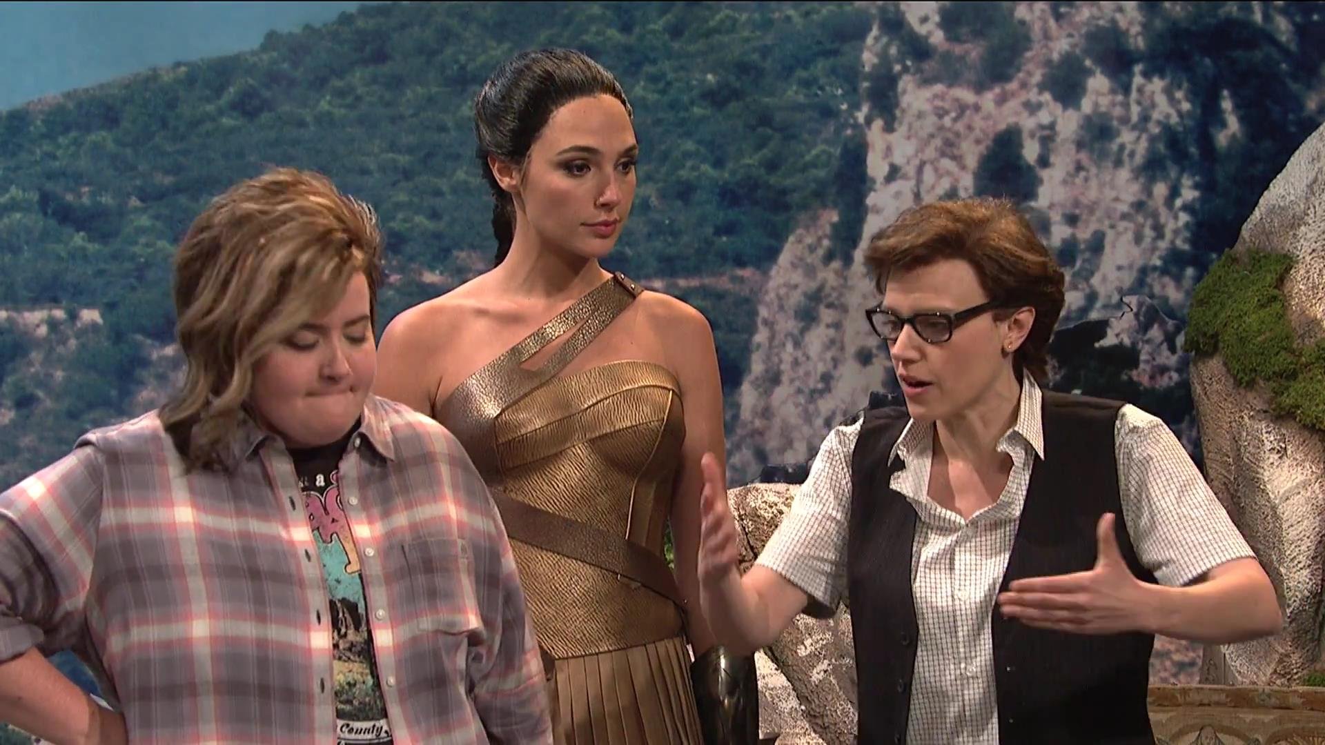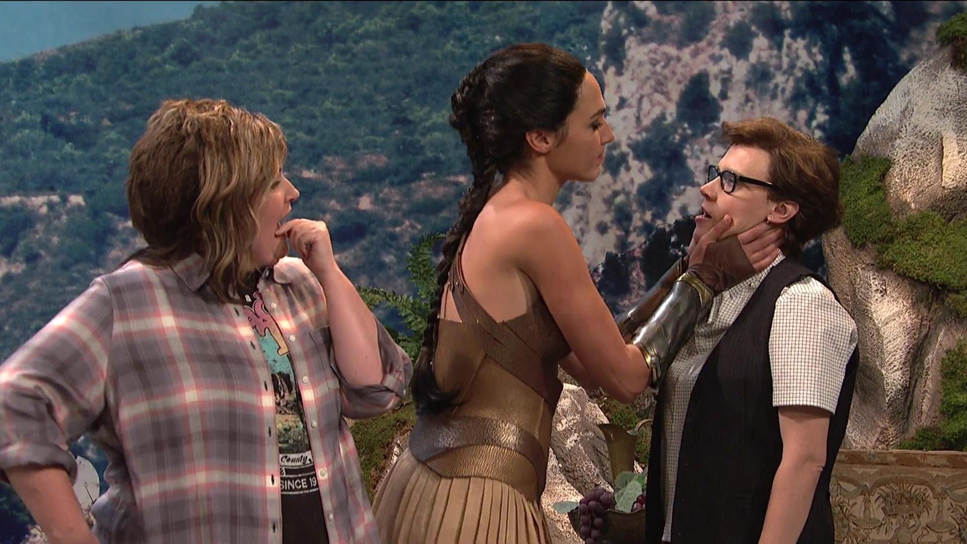 Quando duas mulheres (Aidy Bryant, Kate McKinnon) tropeçam em Themyscira, ficam surpresas ao descobrir que seus habitantes (Gal Gadot, Leslie Jones, Melissa Villaseñor, Heidi Gardner) não são o que esperavam. Saturday Night Live (Temporada 43 / Episódio 2, 08/10/2017). Gal Gadot é uma atriz israelense (Mulher-Maravilha) & modelo. Idade – 32 (30 de abril de 1985).