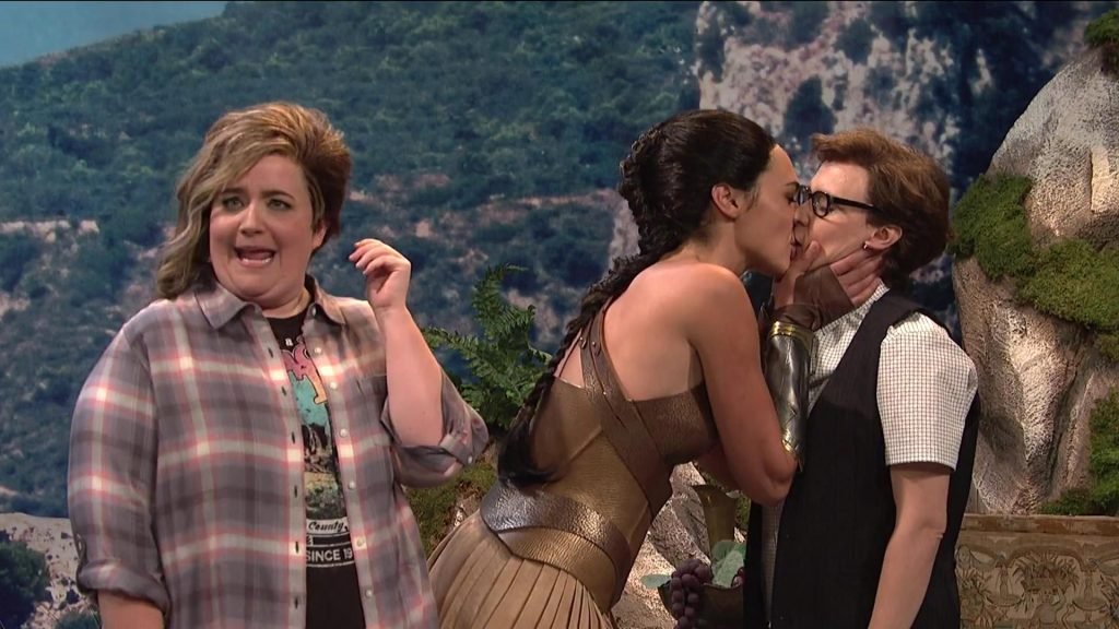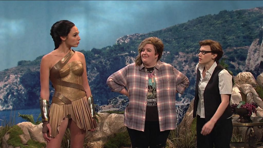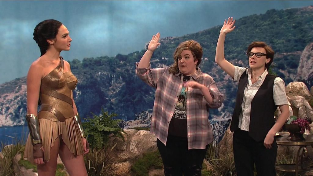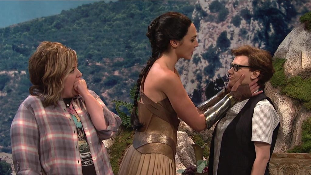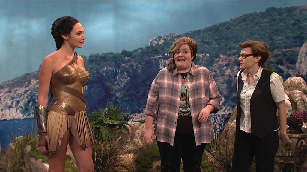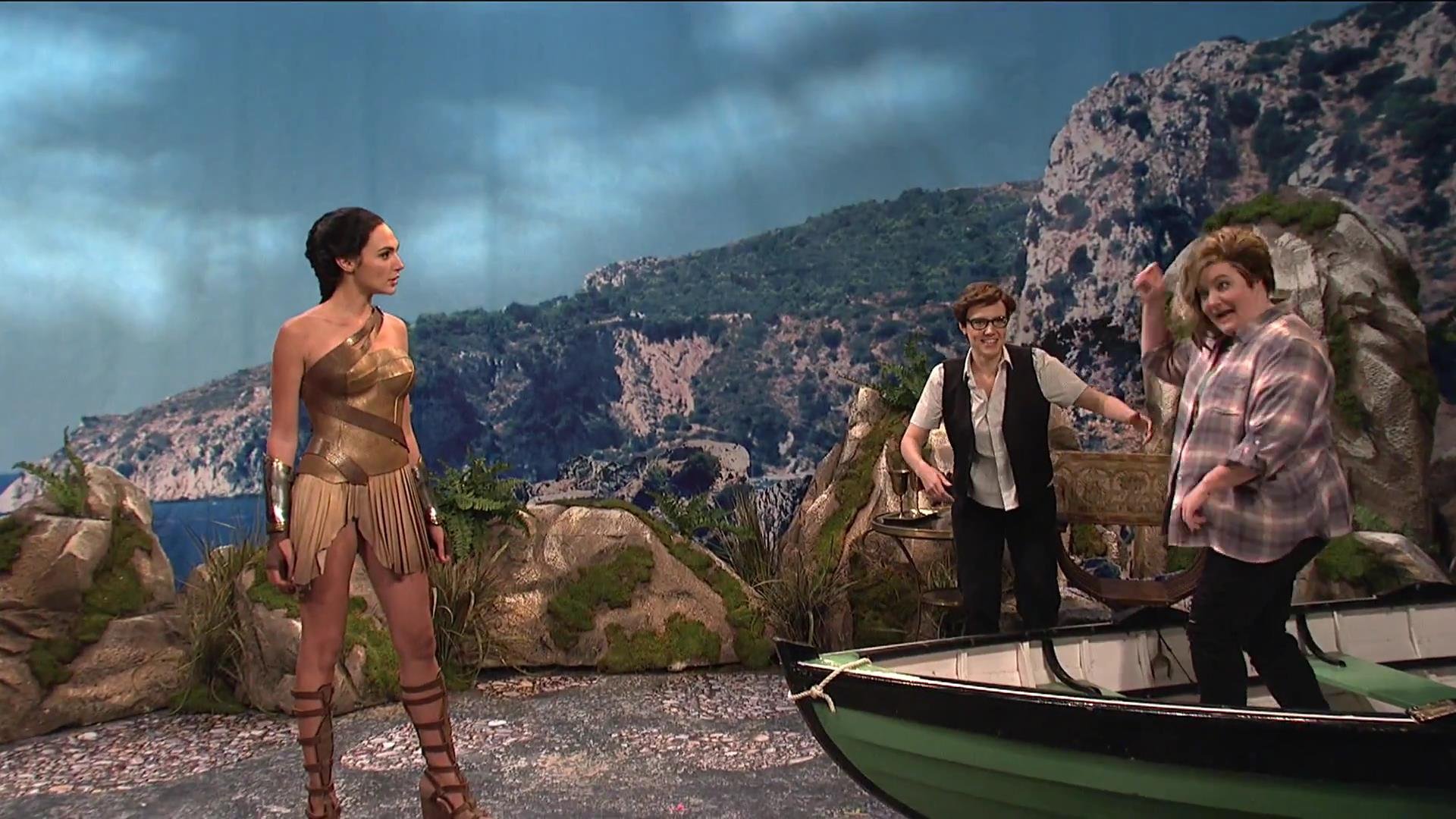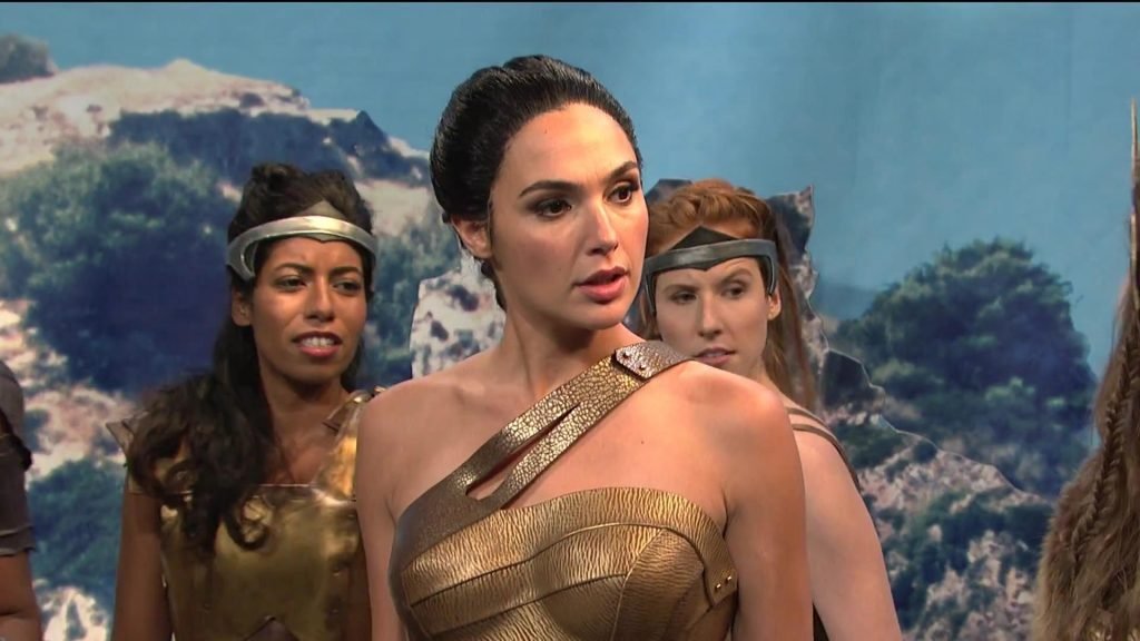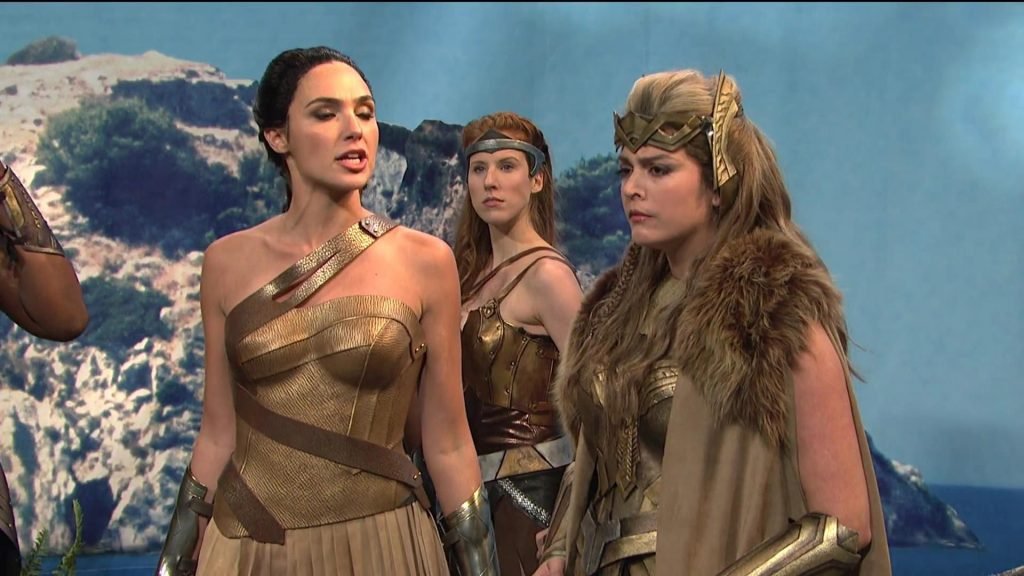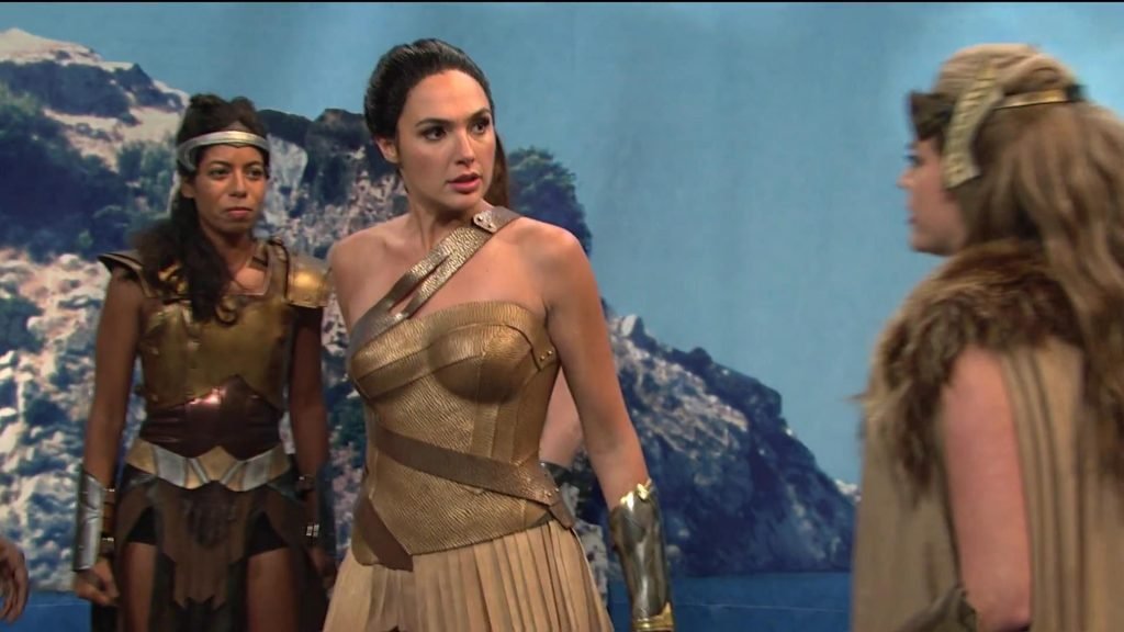 Quando duas mulheres (Aidy Bryant, Kate McKinnon) tropeçam em Themyscira, ficam surpresas ao descobrir que seus habitantes (Gal Gadot, Leslie Jones, Melissa Villaseñor, Heidi Gardner) não são o que esperavam. Saturday Night Live (Temporada 43 / Episódio 2, 08/10/2017). Gal Gadot é uma atriz israelense (Mulher-Maravilha) & modelo. Idade – 32 (30 de abril de 1985).