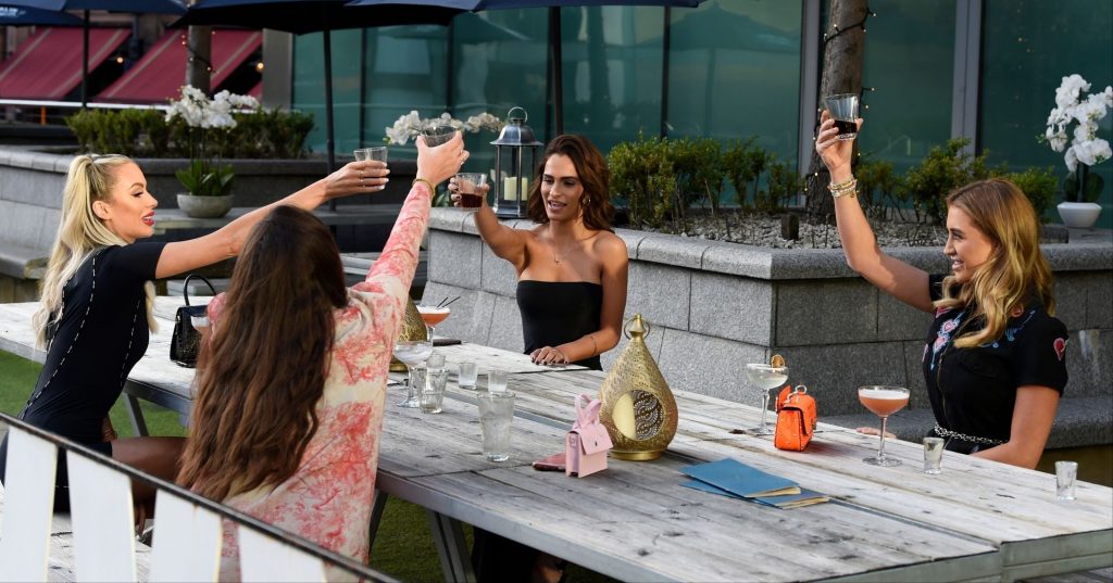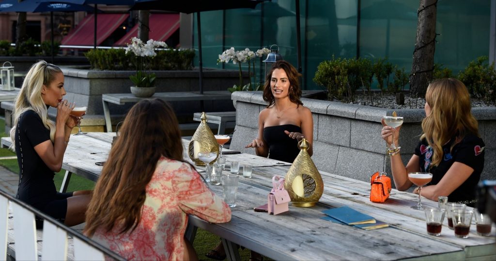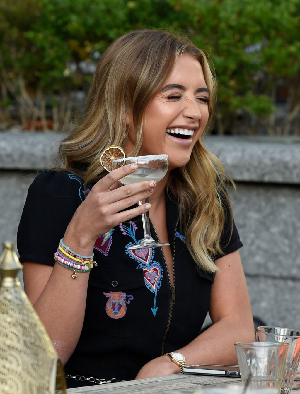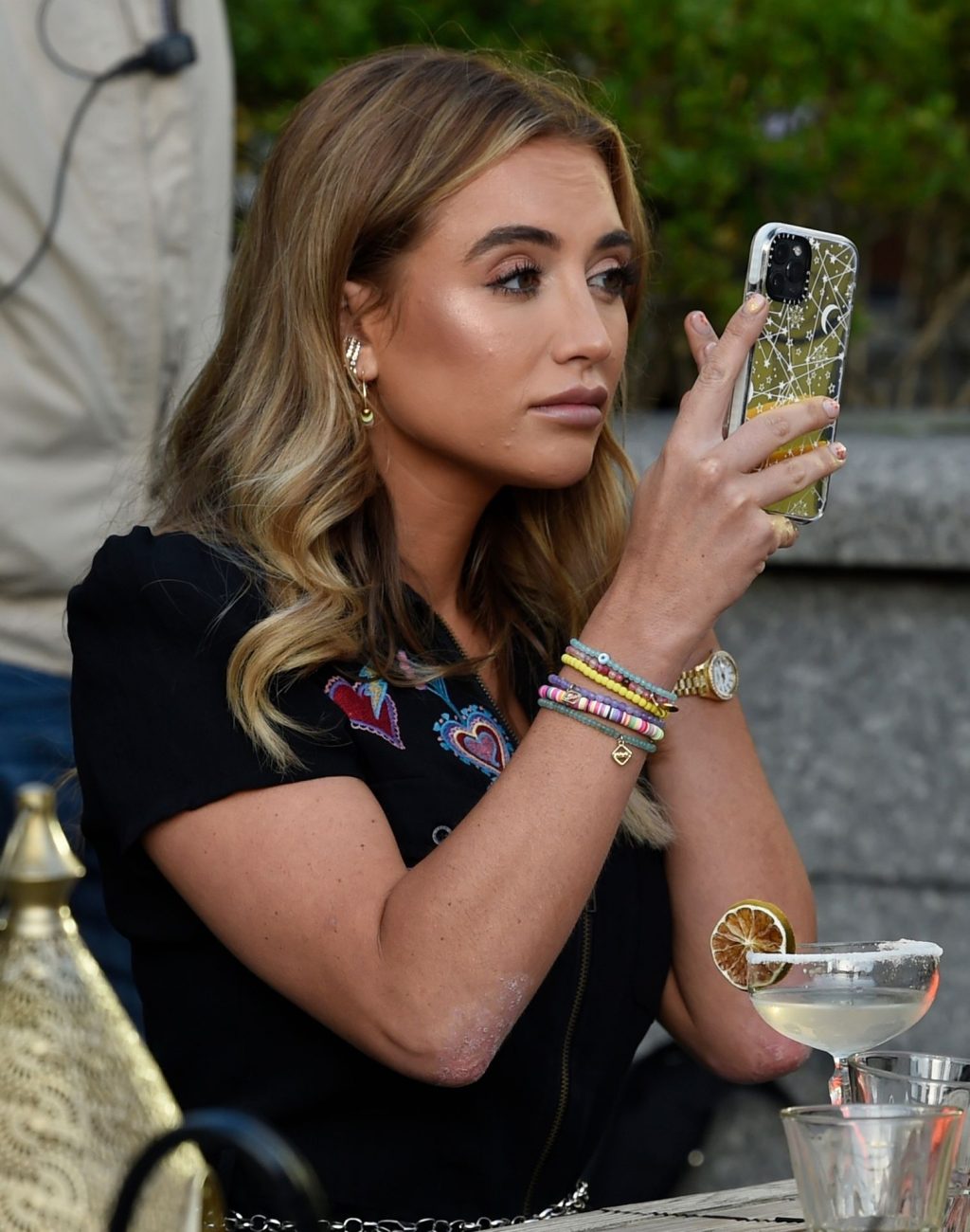 Love Island e a estrela de TOWIE Georgia Harrison exibe seus novos seios 32C de $8K enquanto grava Olivia Meets her Match com Nicole Bass e Fran Parman em Manchester no Impossible Bar, 09/02/2020.