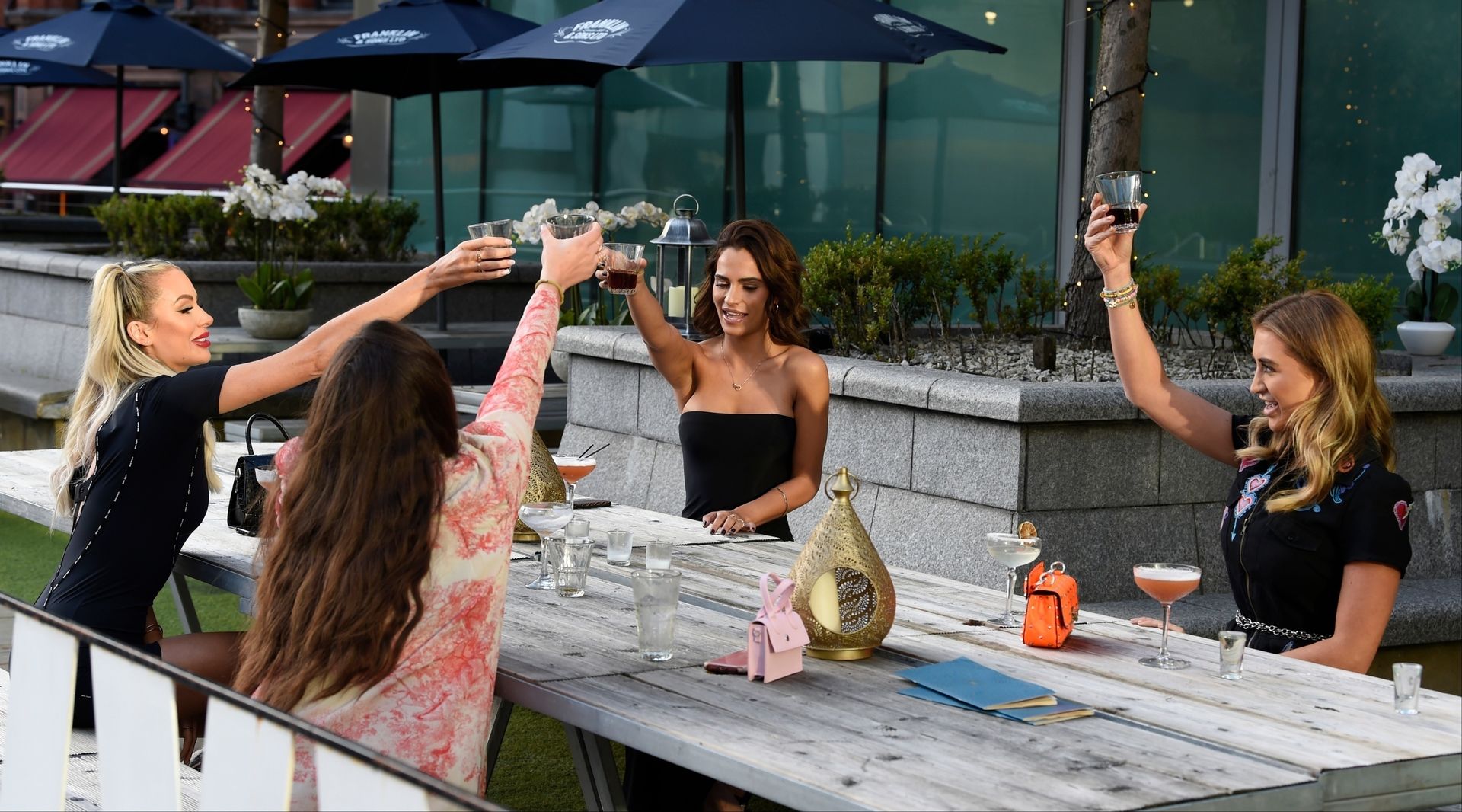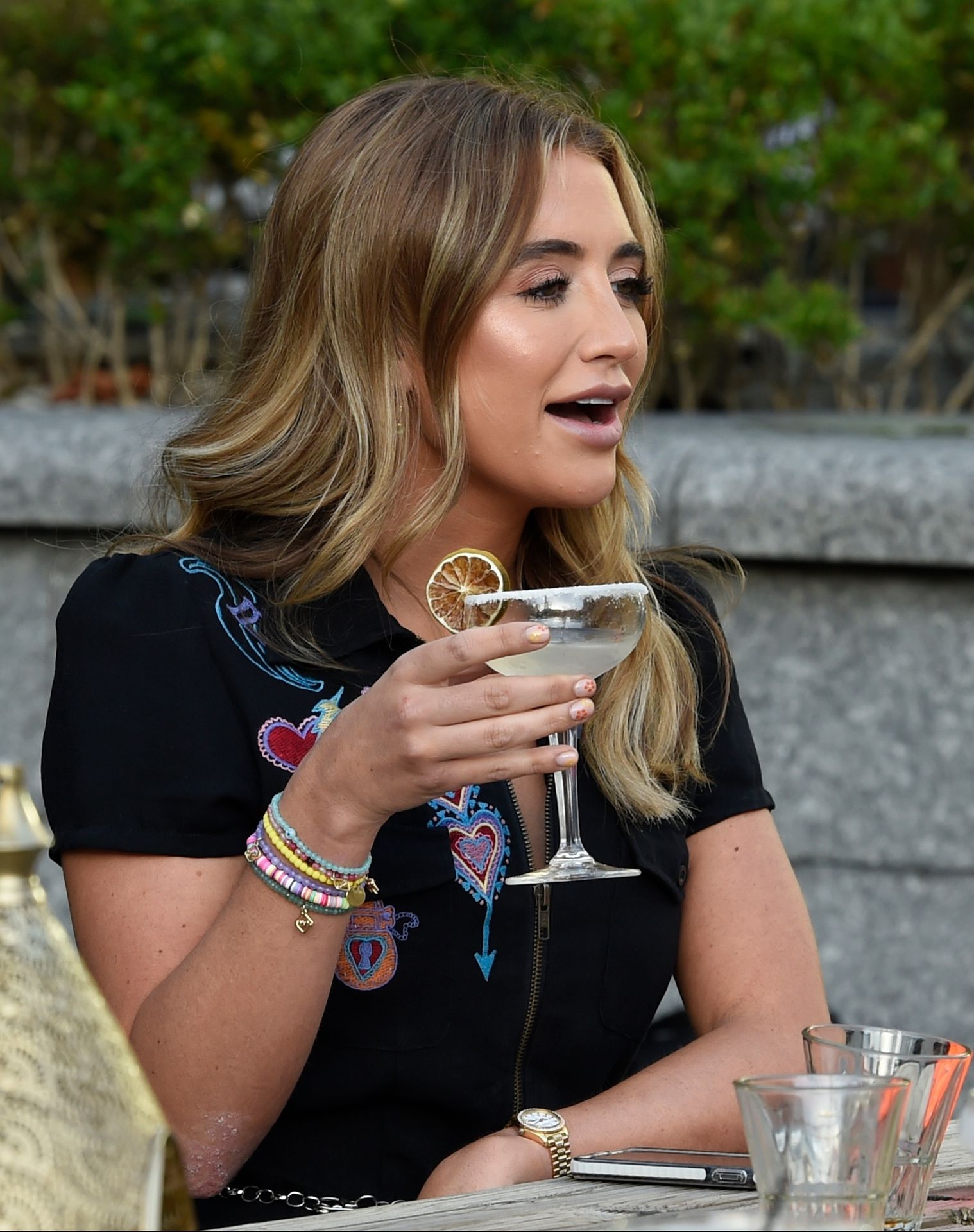 Love Island e a estrela de TOWIE Georgia Harrison exibe seus novos seios 32C de $8K enquanto grava Olivia Meets her Match com Nicole Bass e Fran Parman em Manchester no Impossible Bar, 09/02/2020.