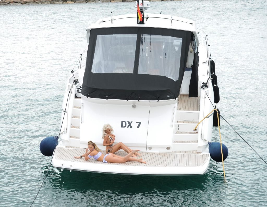 Modelos glamour inglesas e ex-estrelas do reality show ‘Love Island’, Georgia Harrison e Hannah Elizabeth foram vistas usando biquínis sexy durante um ensaio fotográfico em um barco na Espanha, 23/08/2017.
