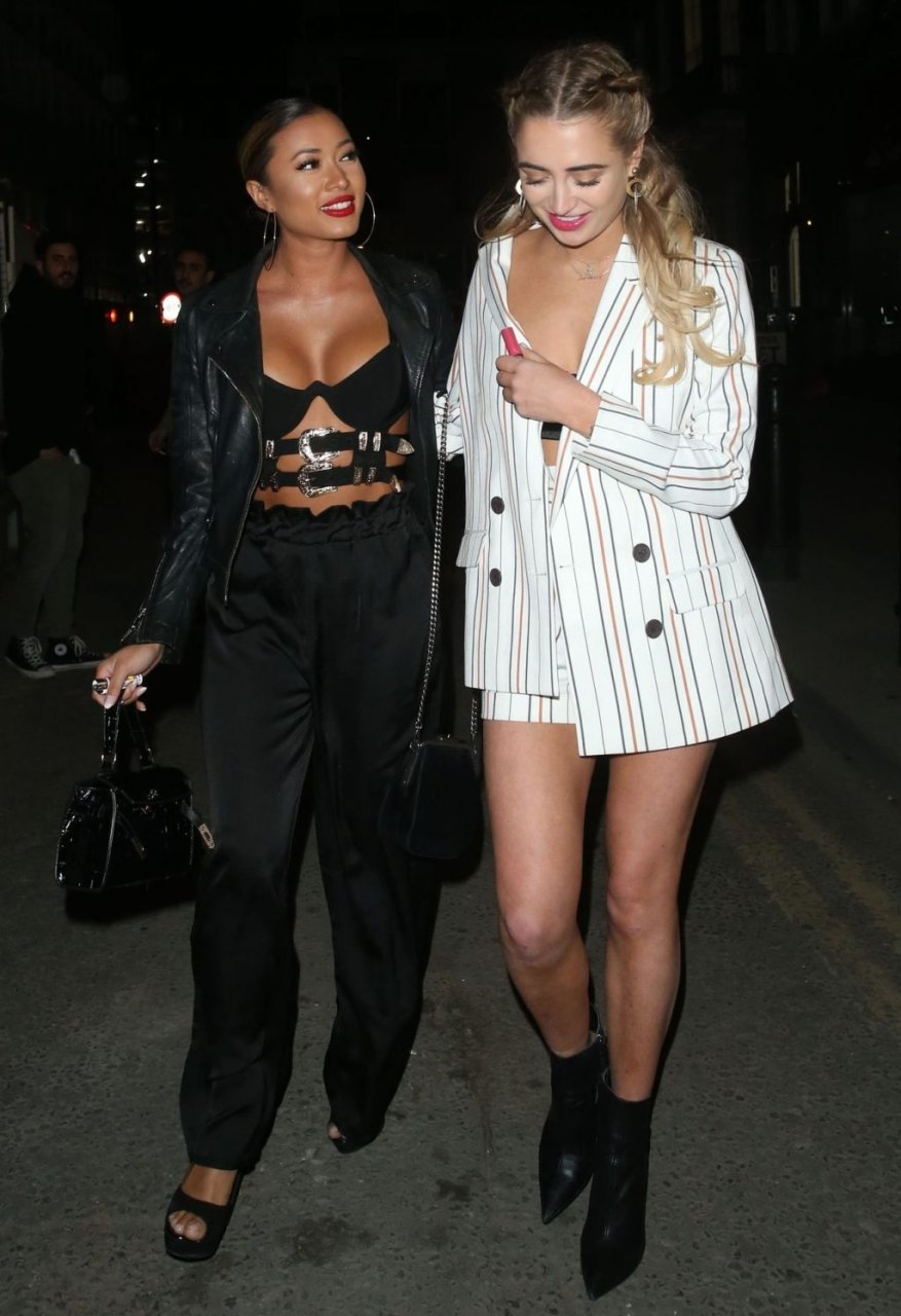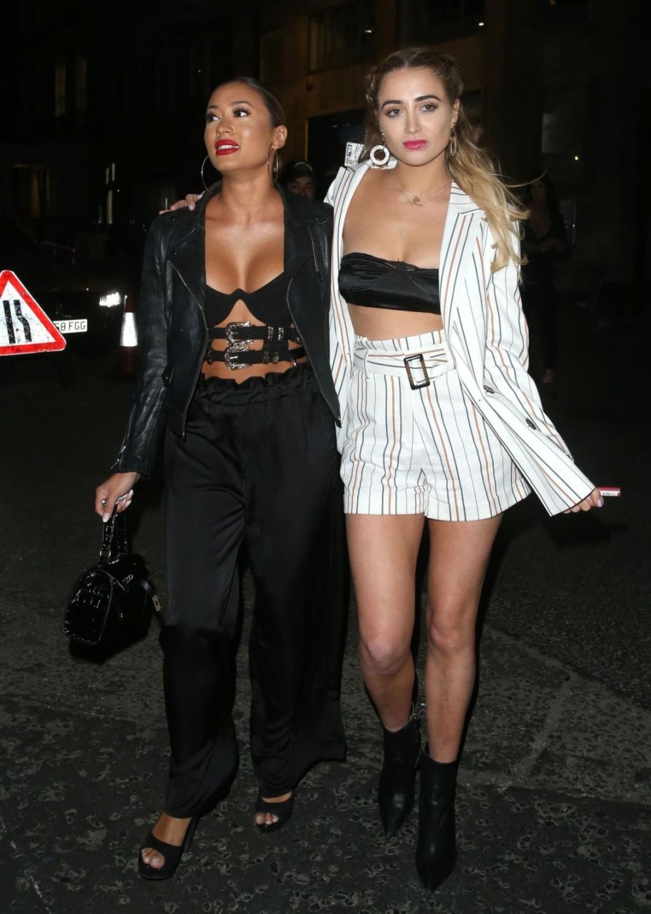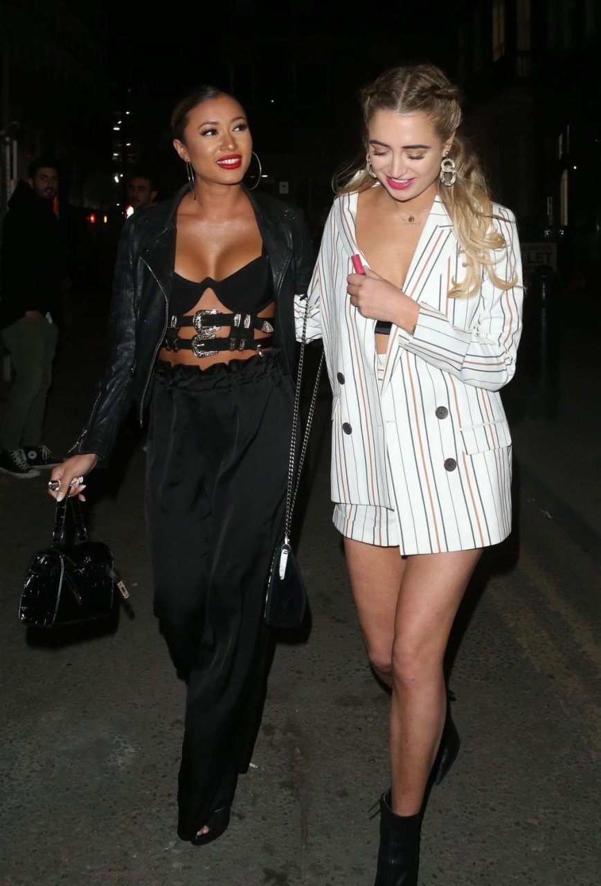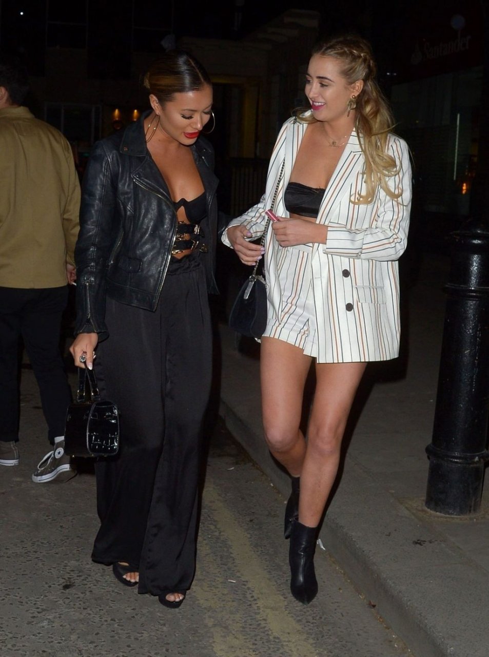 Estrelas de reality show Georgia Harrison e Kaz Crossley foram fotografadas saindo juntas do Tape Night Club em Mayfair, Londres, 12/04/2019.