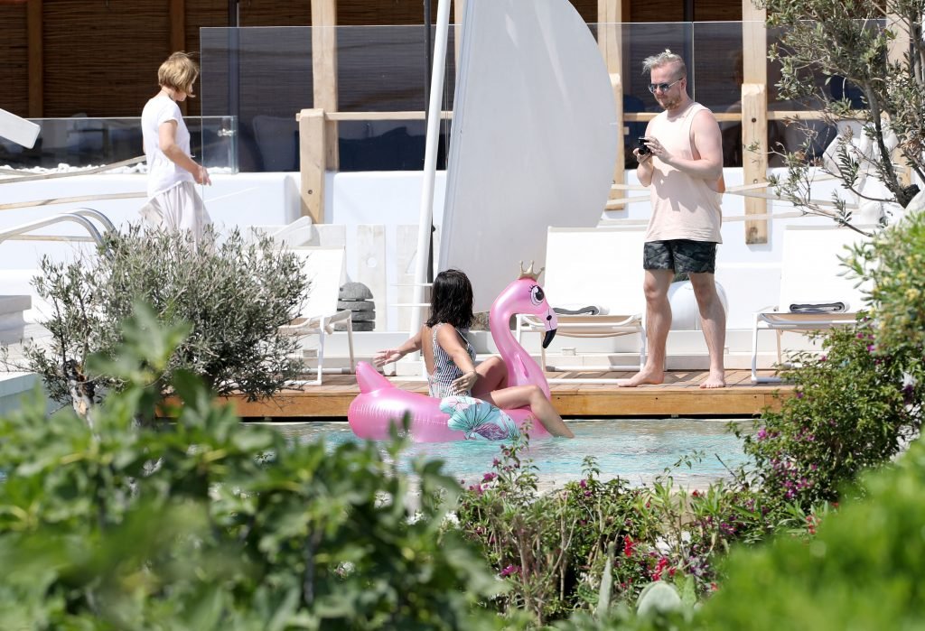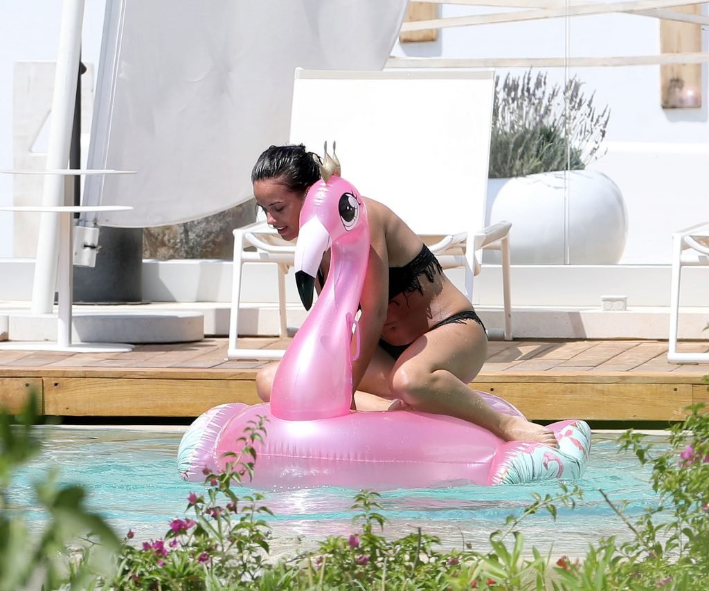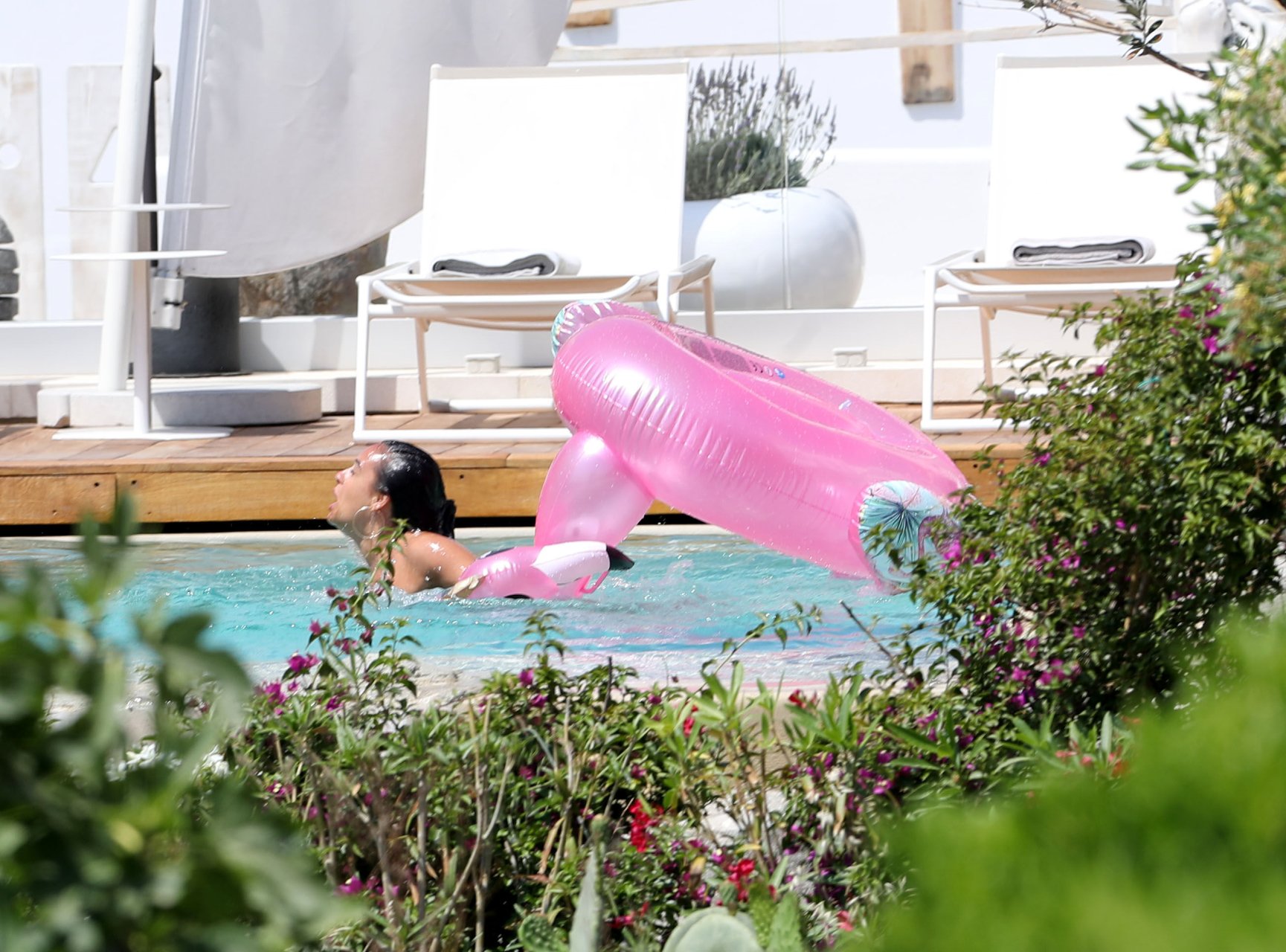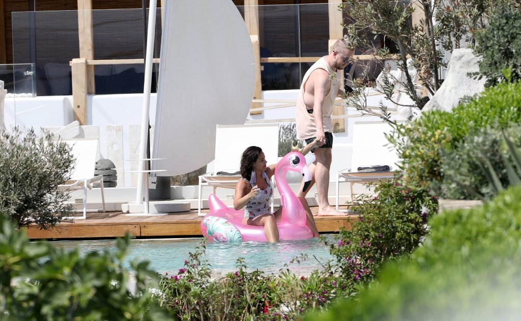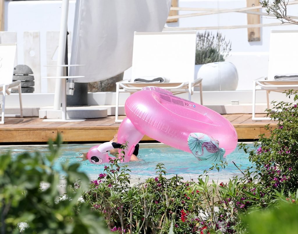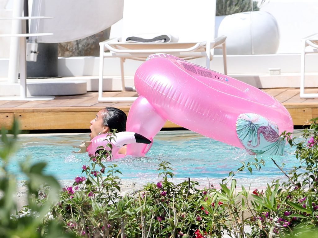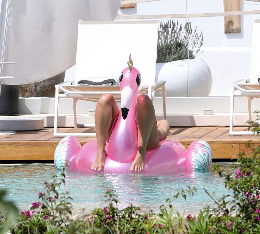 A atriz Georgia May Foote (27) foi fotografada brincando com um flamingo inflável ao redor de uma piscina enquanto relaxava em férias em Mykonos, 07/05/2018.