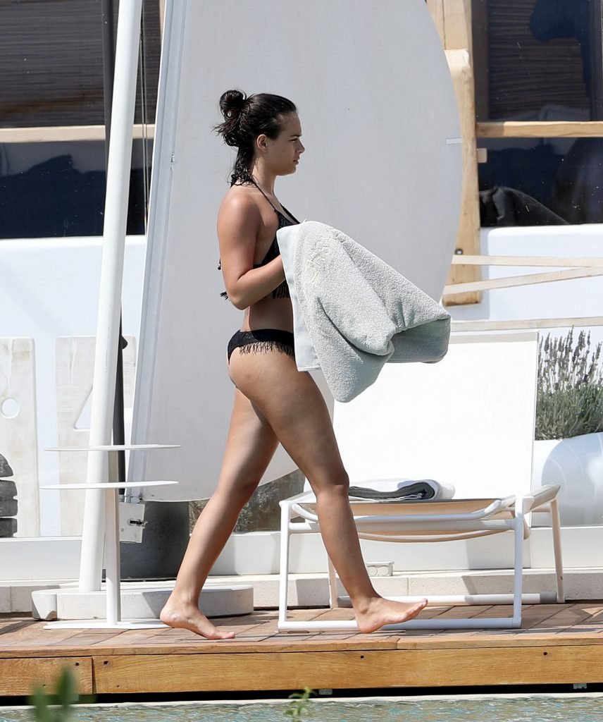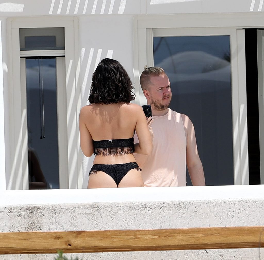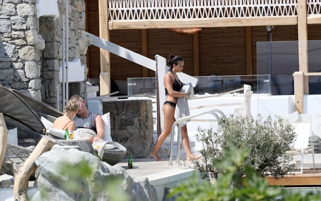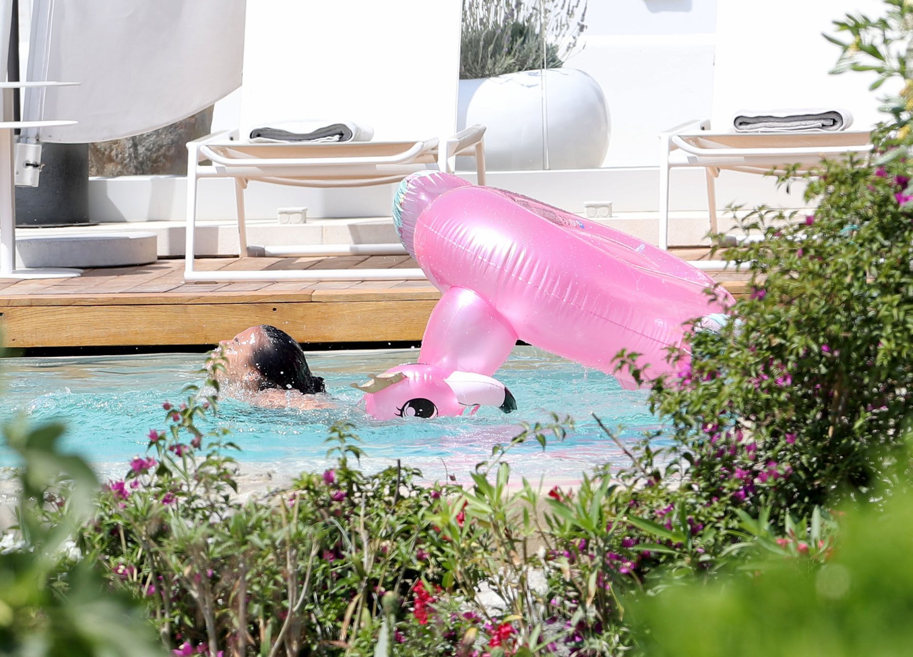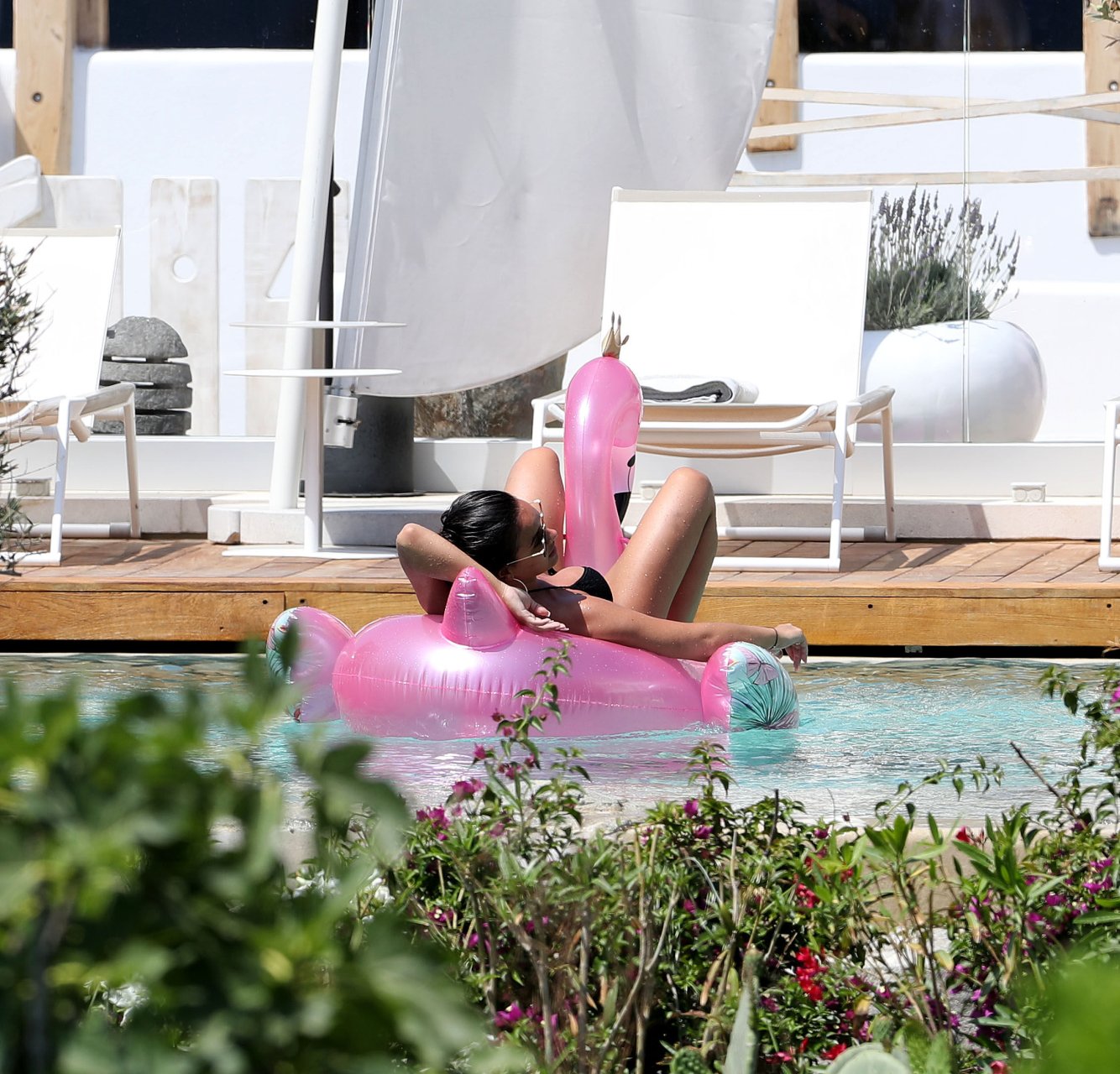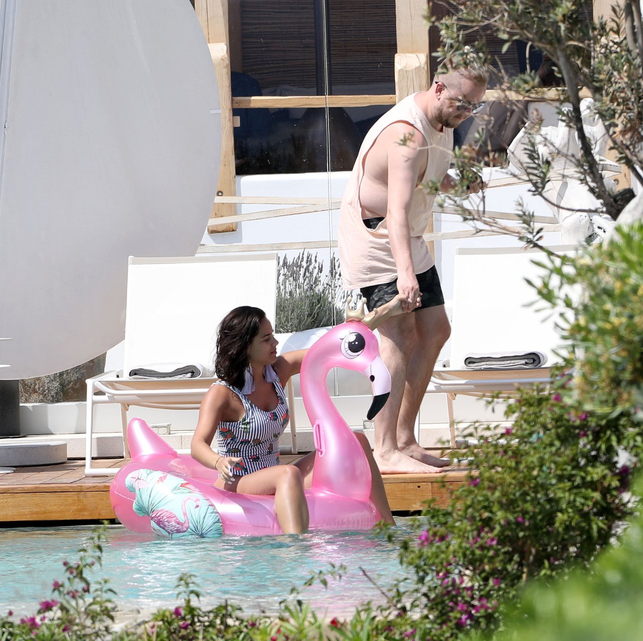 A atriz Georgia May Foote (27) foi fotografada brincando com um flamingo inflável ao redor de uma piscina enquanto relaxava em férias em Mykonos, 07/05/2018.