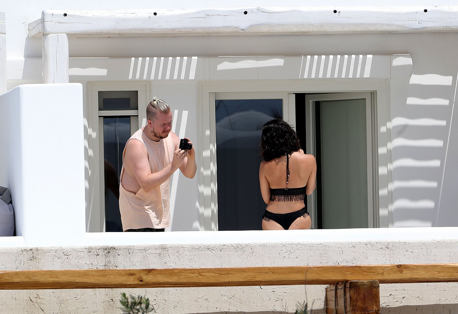 O cara na varanda está usando shorts até o joelho nas imagens da piscina. Ele não está usando calças na varanda. Acho que ela deve ter fotos atrevidas.