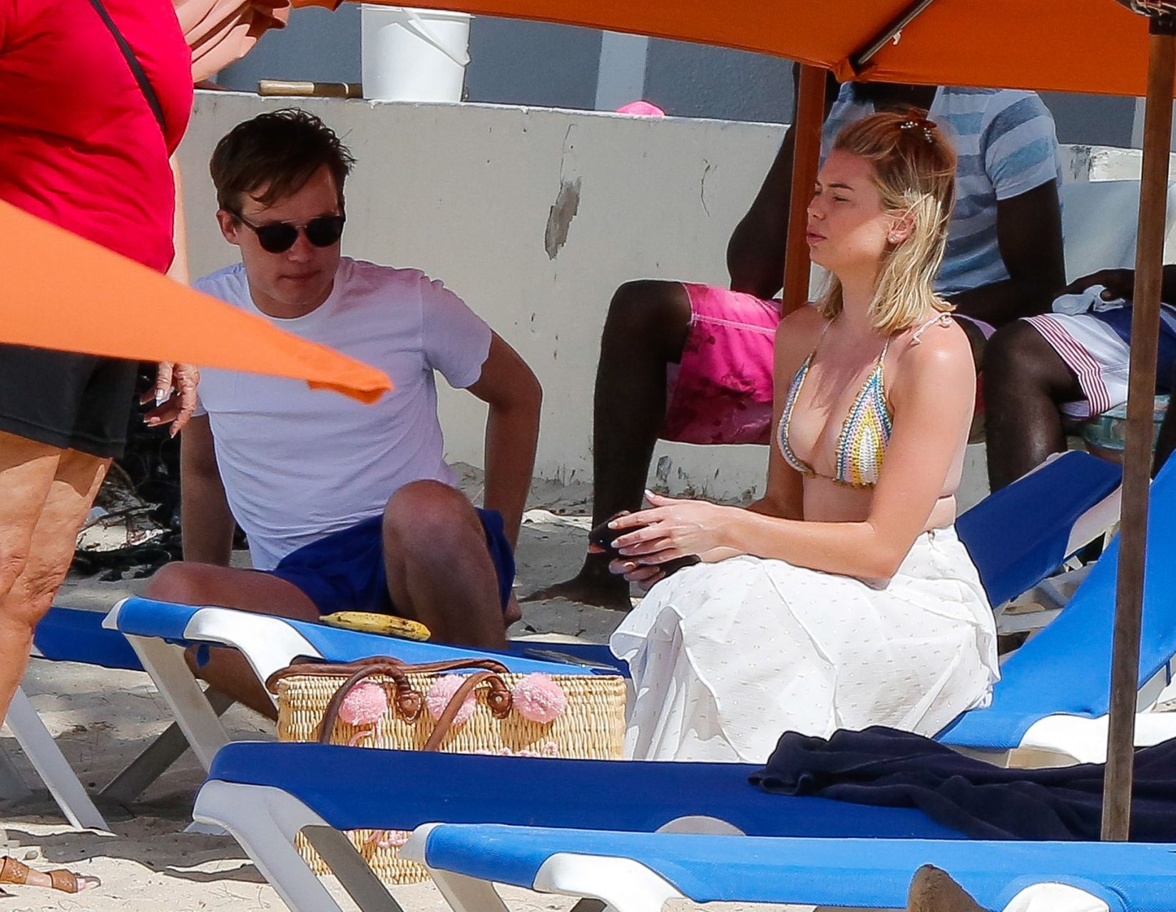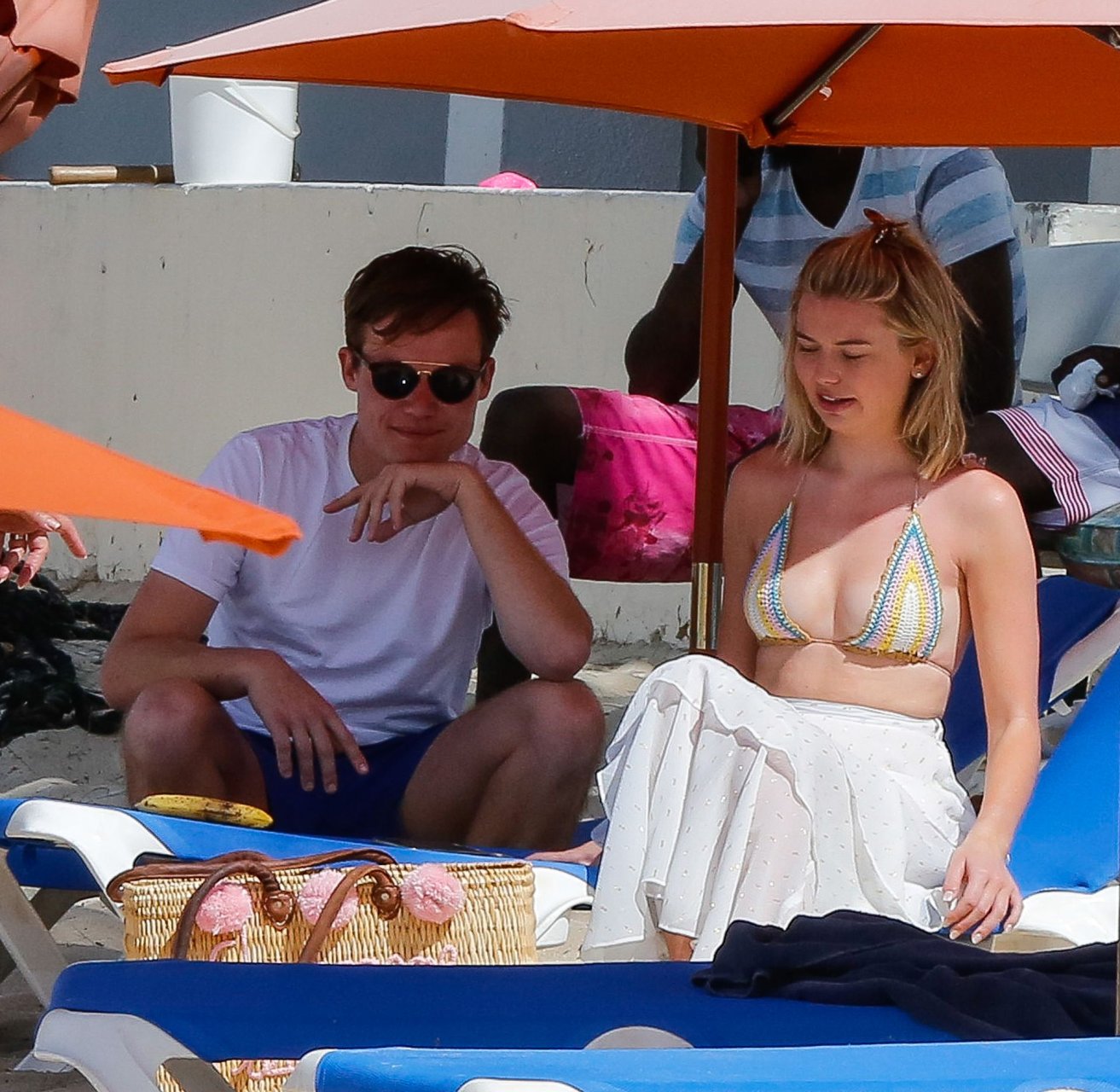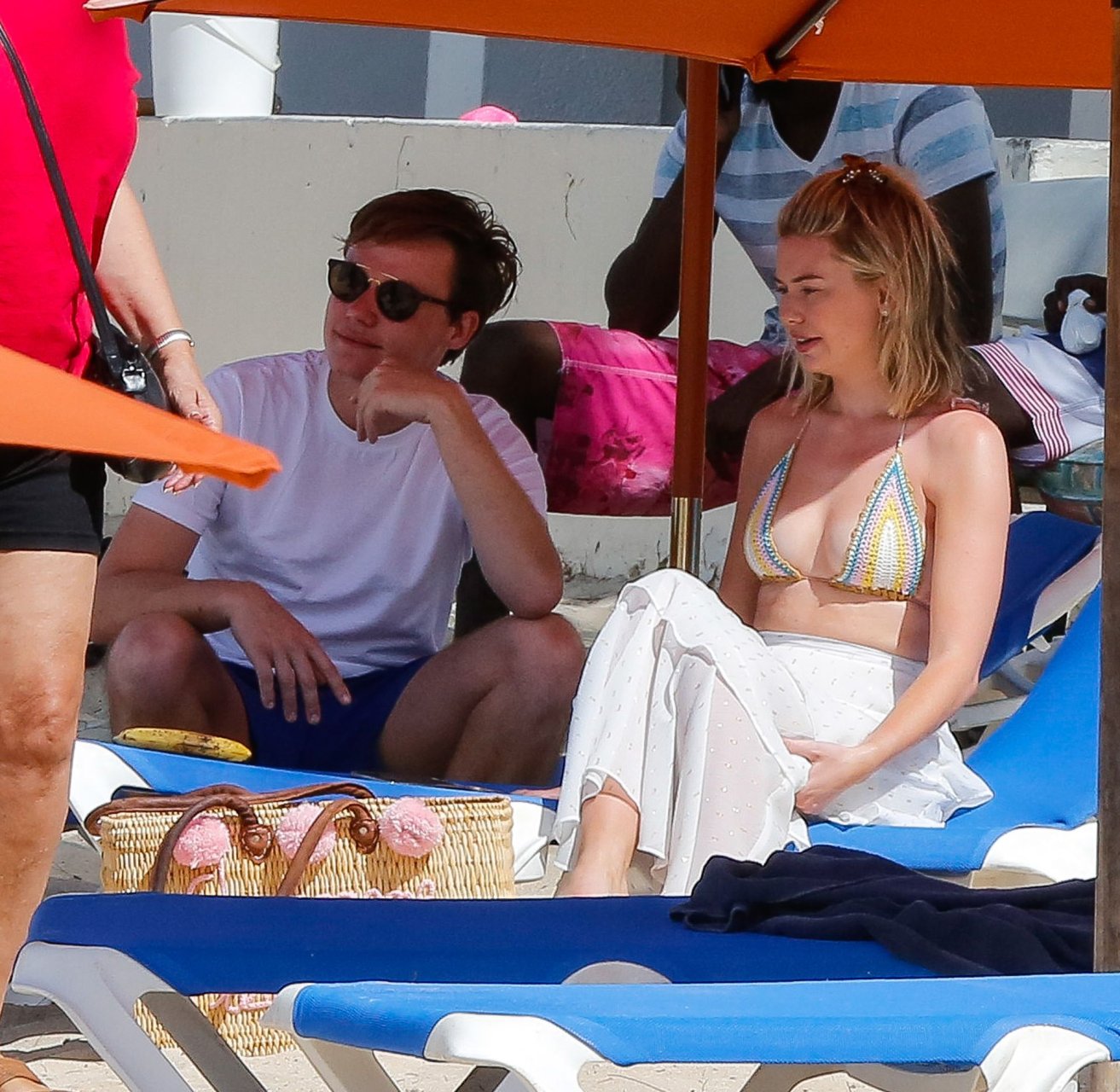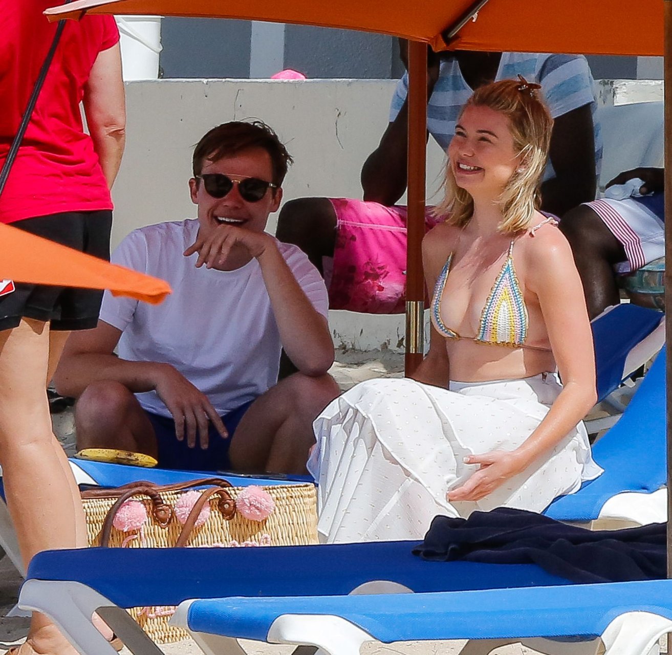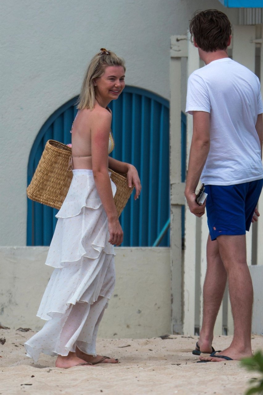 A sexy loira Georgia “Toff” Toffolo, Rainha da Selva, é vista na praia usando um top de biquíni e uma saia esvoaçante durante as férias em Barbados, 01/11/2019.