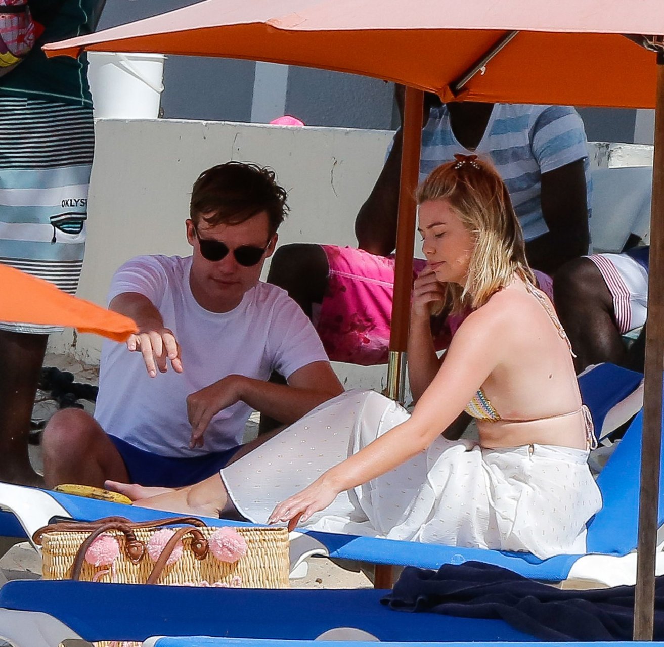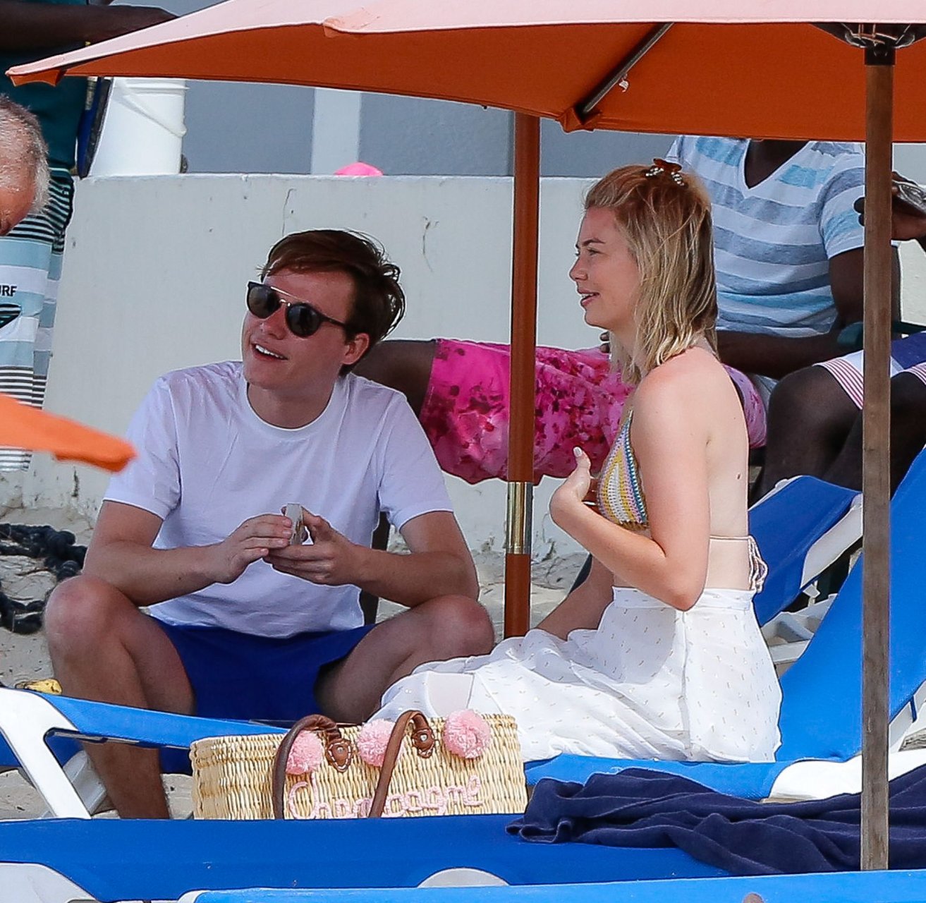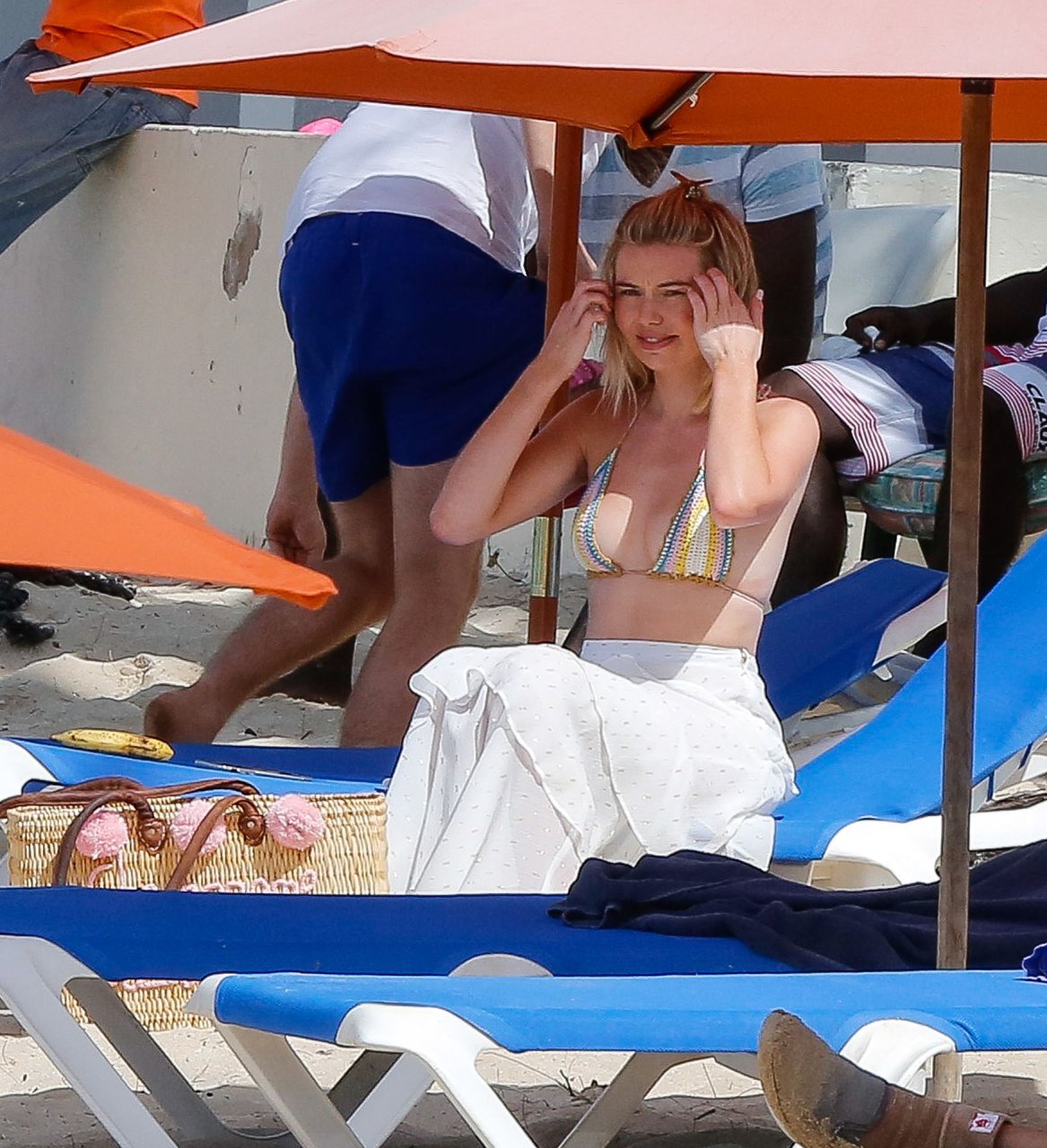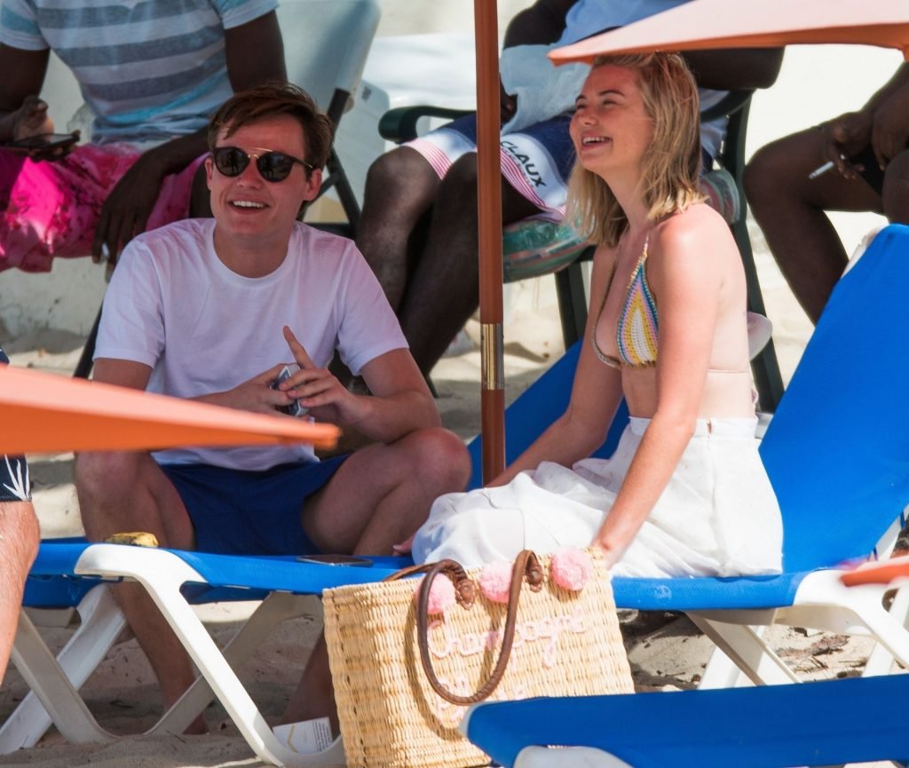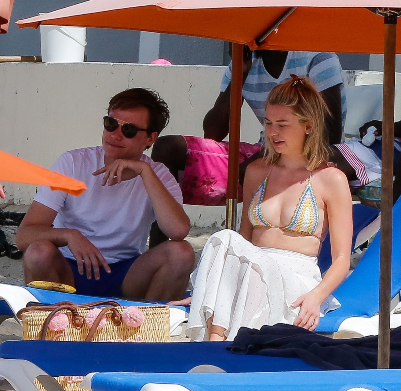 A sexy loira Georgia “Toff” Toffolo, Rainha da Selva, é vista na praia usando um top de biquíni e uma saia esvoaçante durante as férias em Barbados, 01/11/2019.