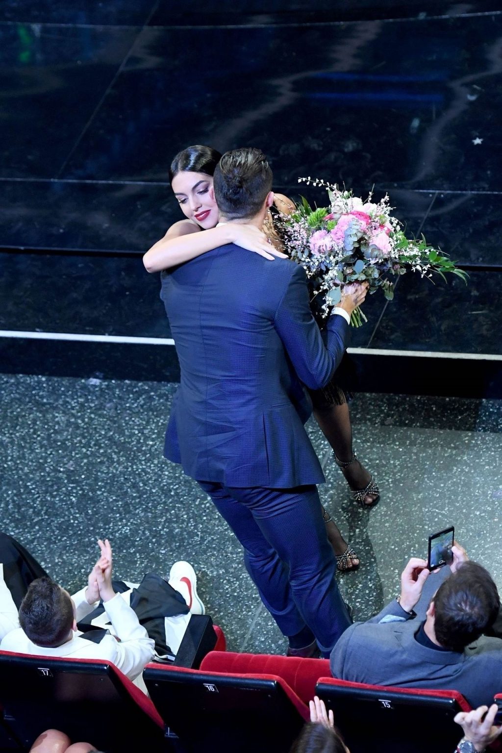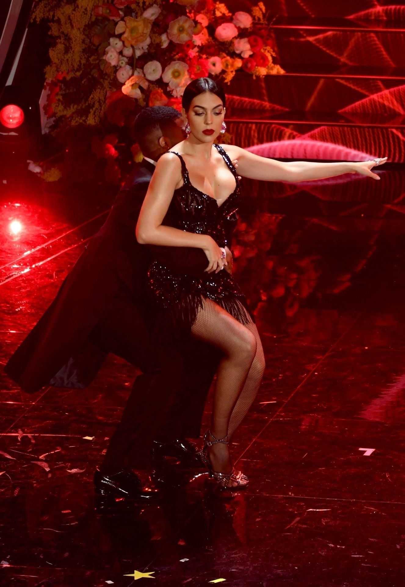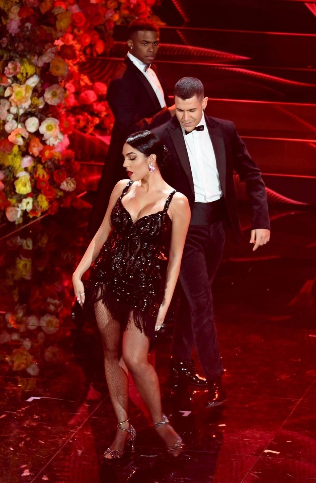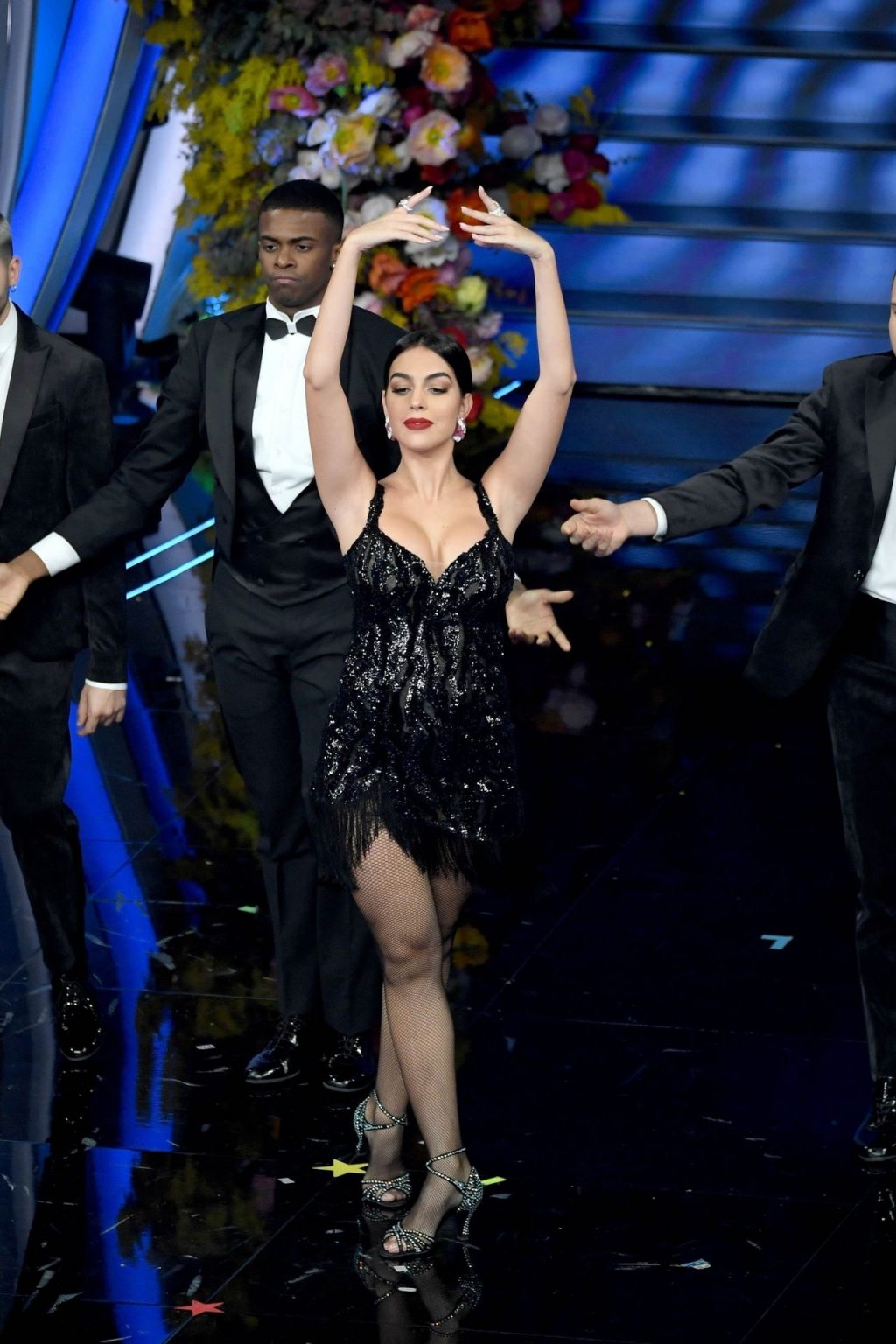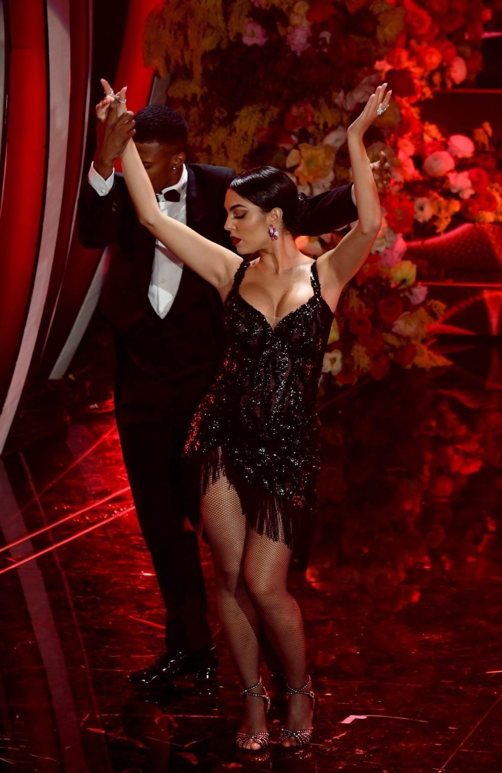 Georgina Rodríguez e Cristiano Ronaldo foram fotografados no 70º Festival de Música de Sanremo, 06/02/2020. Georgina aquece o festival dançando um tango argentino no palco do Ariston durante a terceira noite do evento.