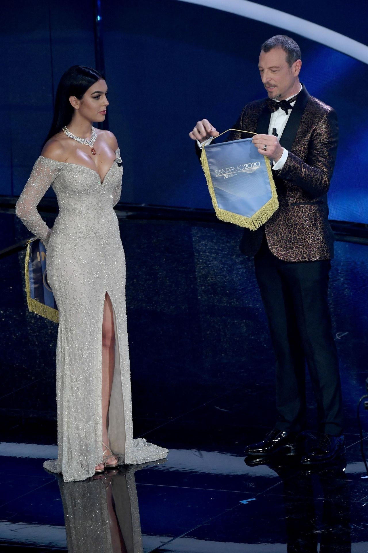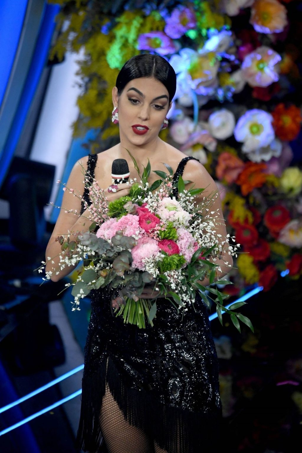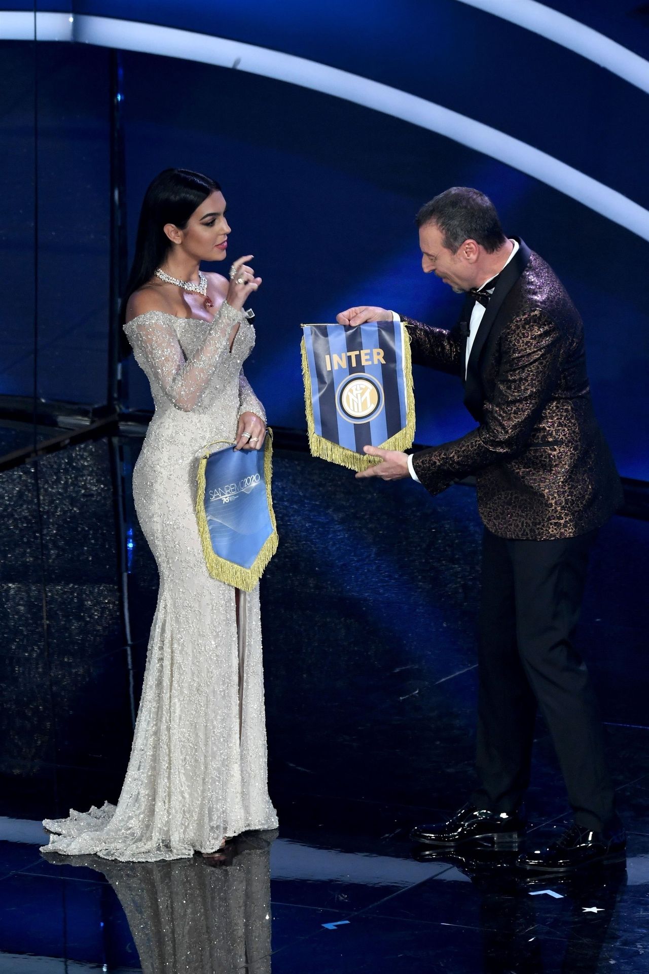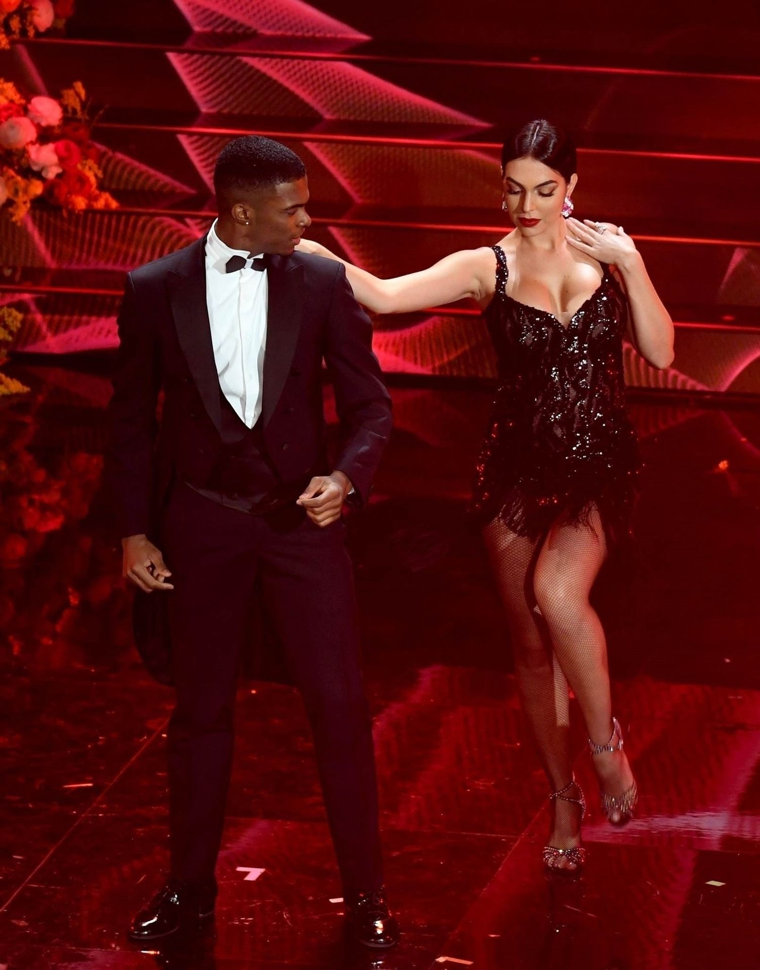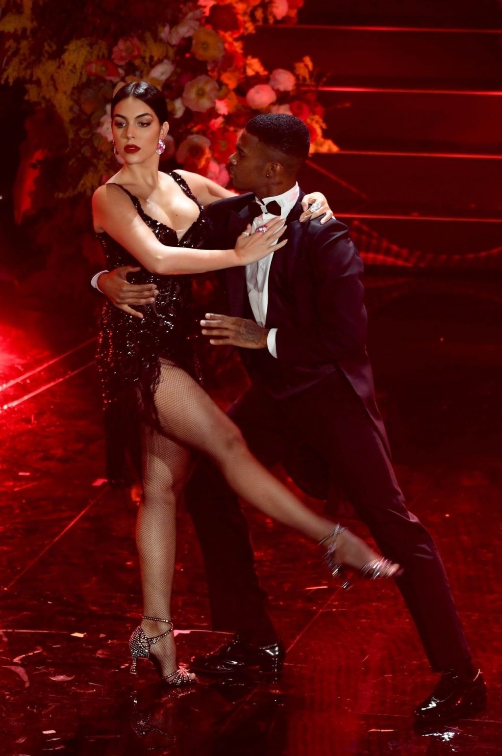 Georgina Rodríguez e Cristiano Ronaldo foram fotografados no 70º Festival de Música de Sanremo, 06/02/2020. Georgina aquece o festival dançando um tango argentino no palco do Ariston durante a terceira noite do evento.