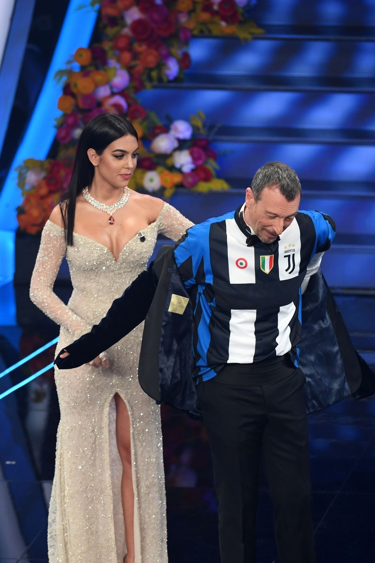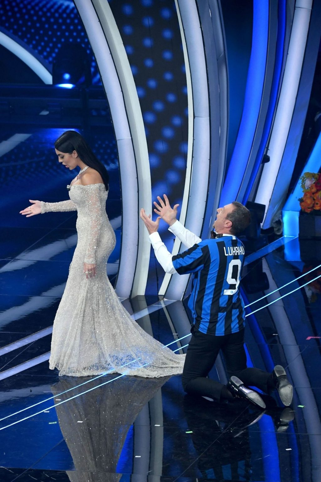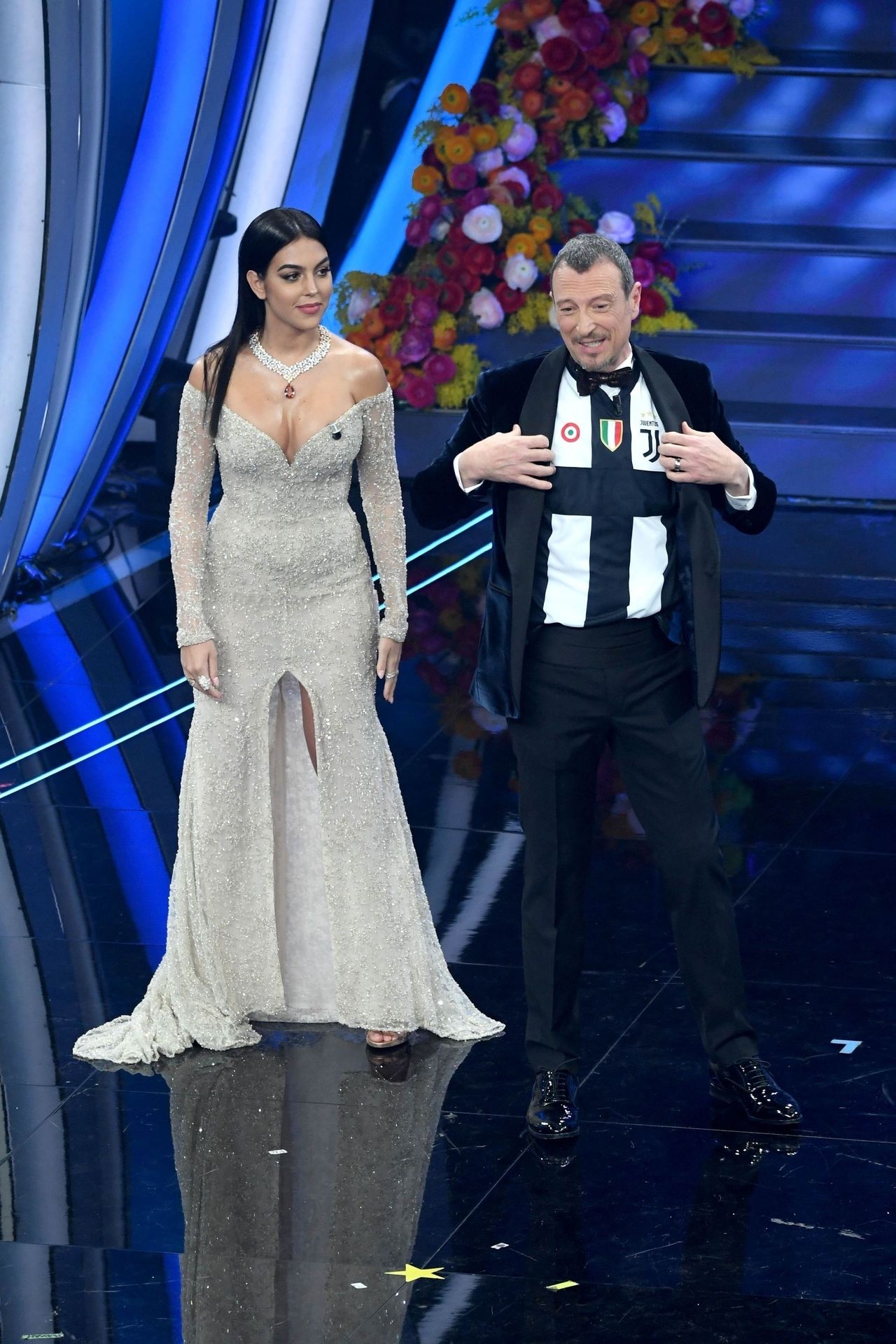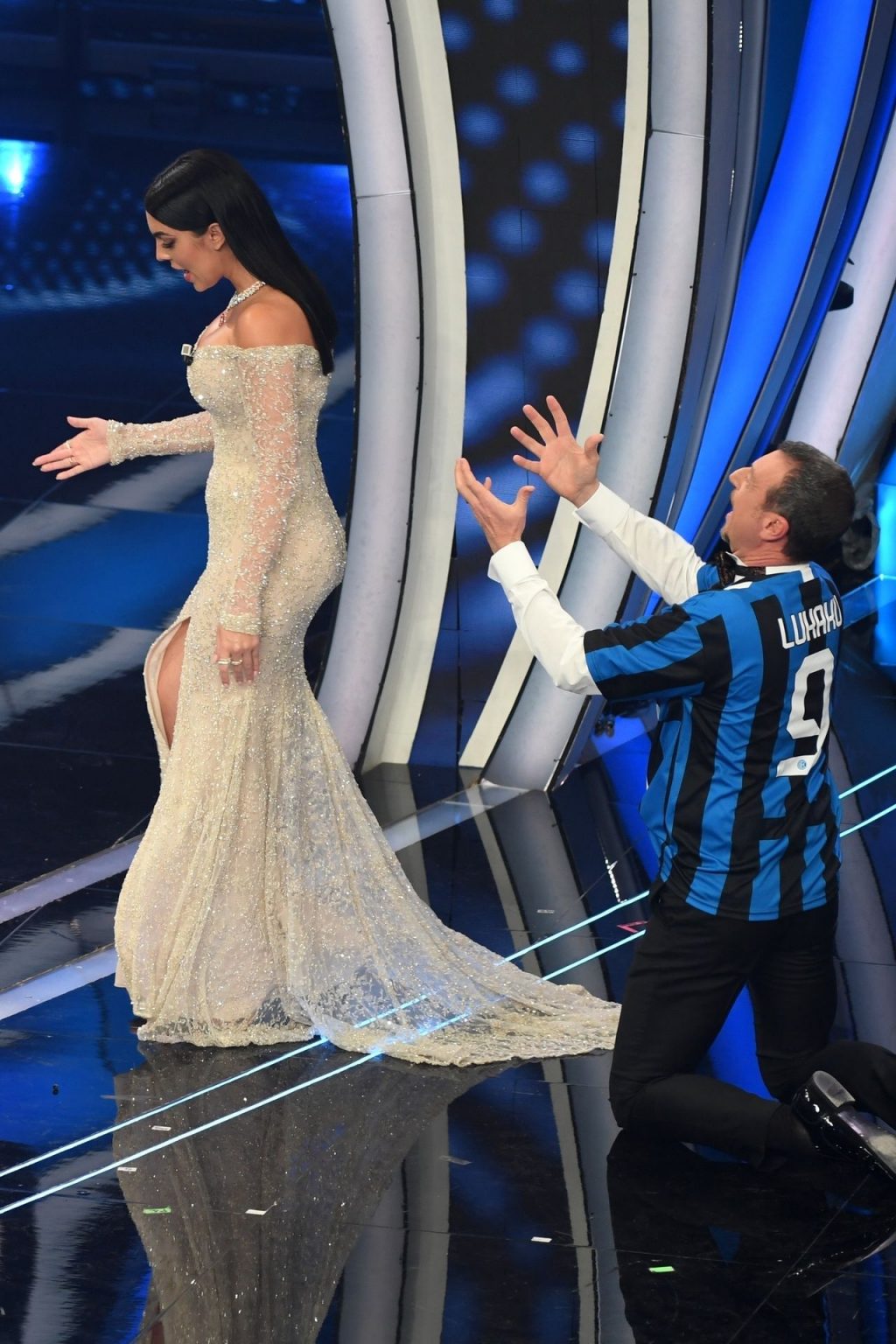 Georgina Rodríguez e Cristiano Ronaldo foram fotografados no 70º Festival de Música de Sanremo, 06/02/2020. Georgina aquece o festival dançando um tango argentino no palco do Ariston durante a terceira noite do evento.