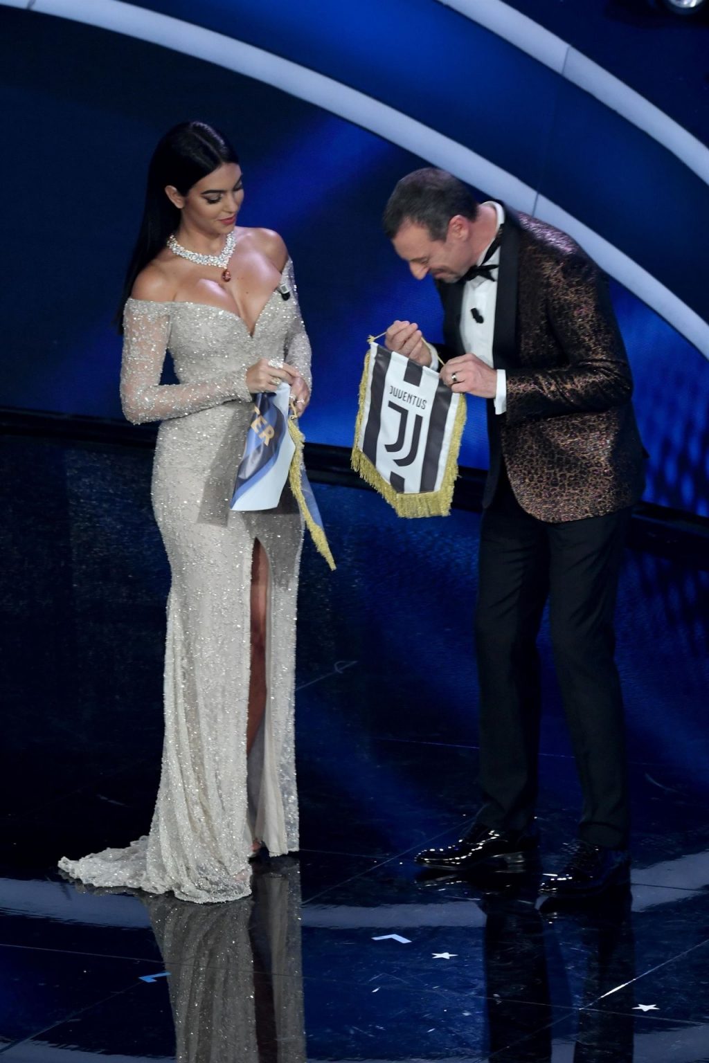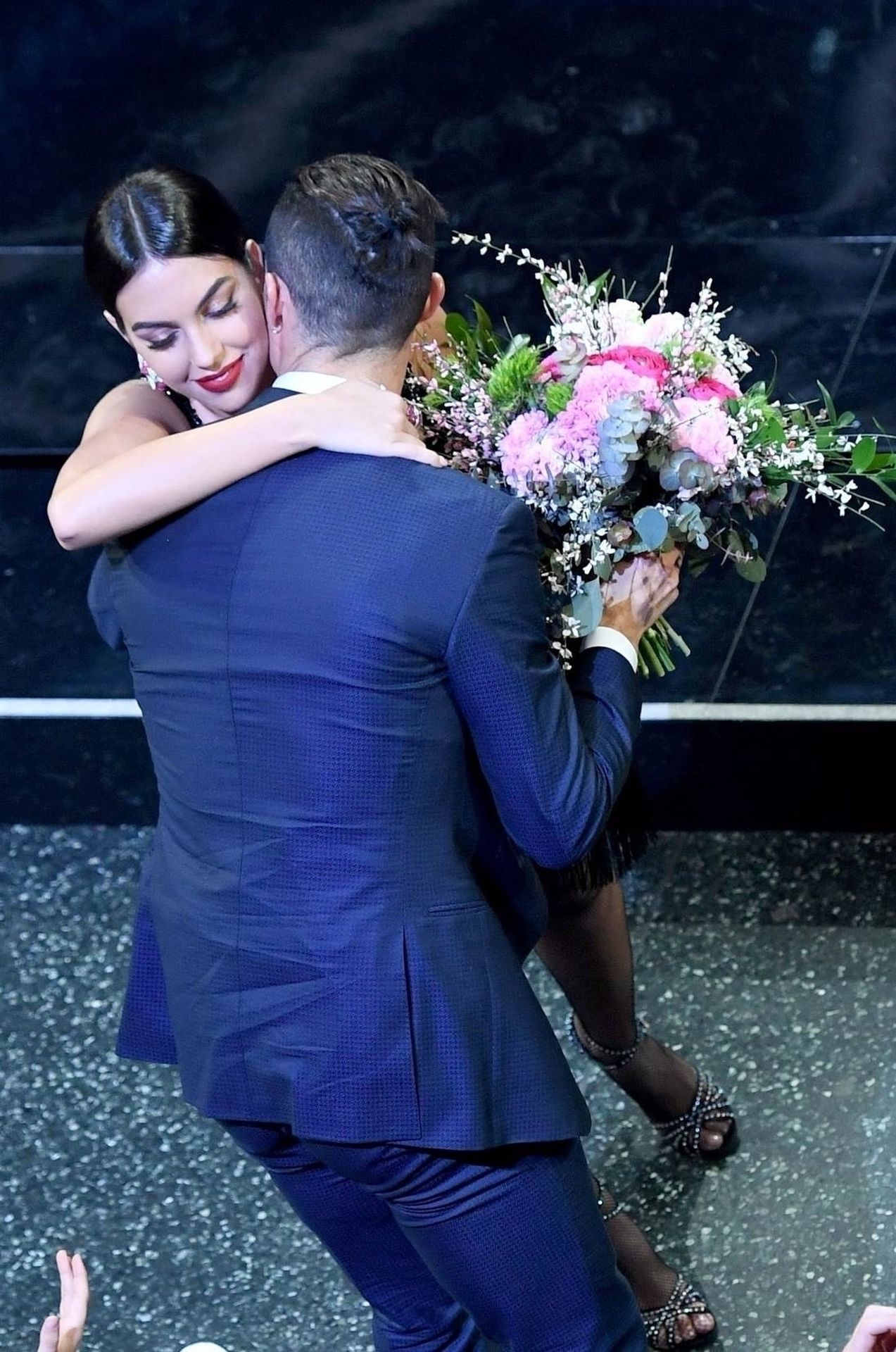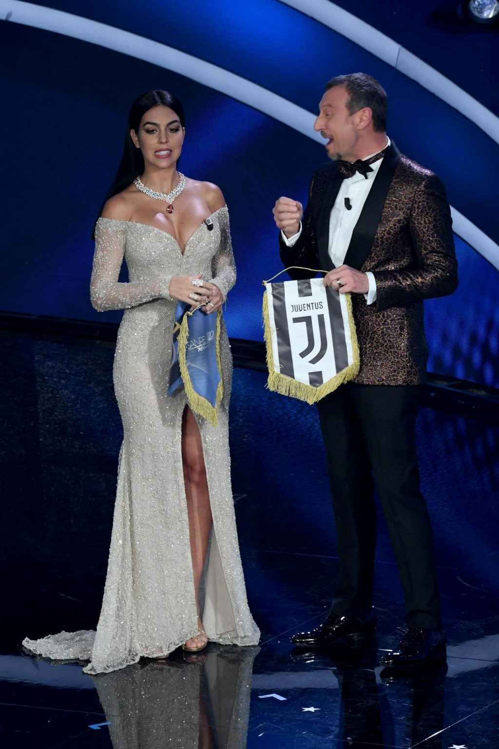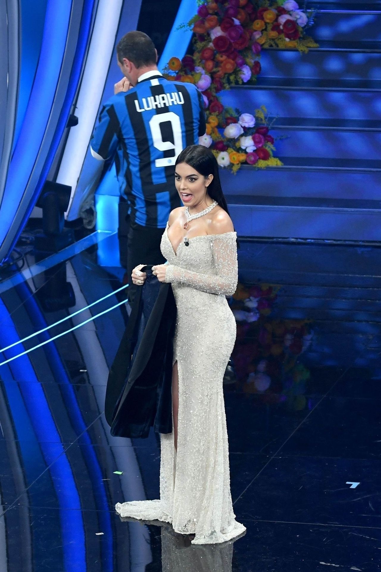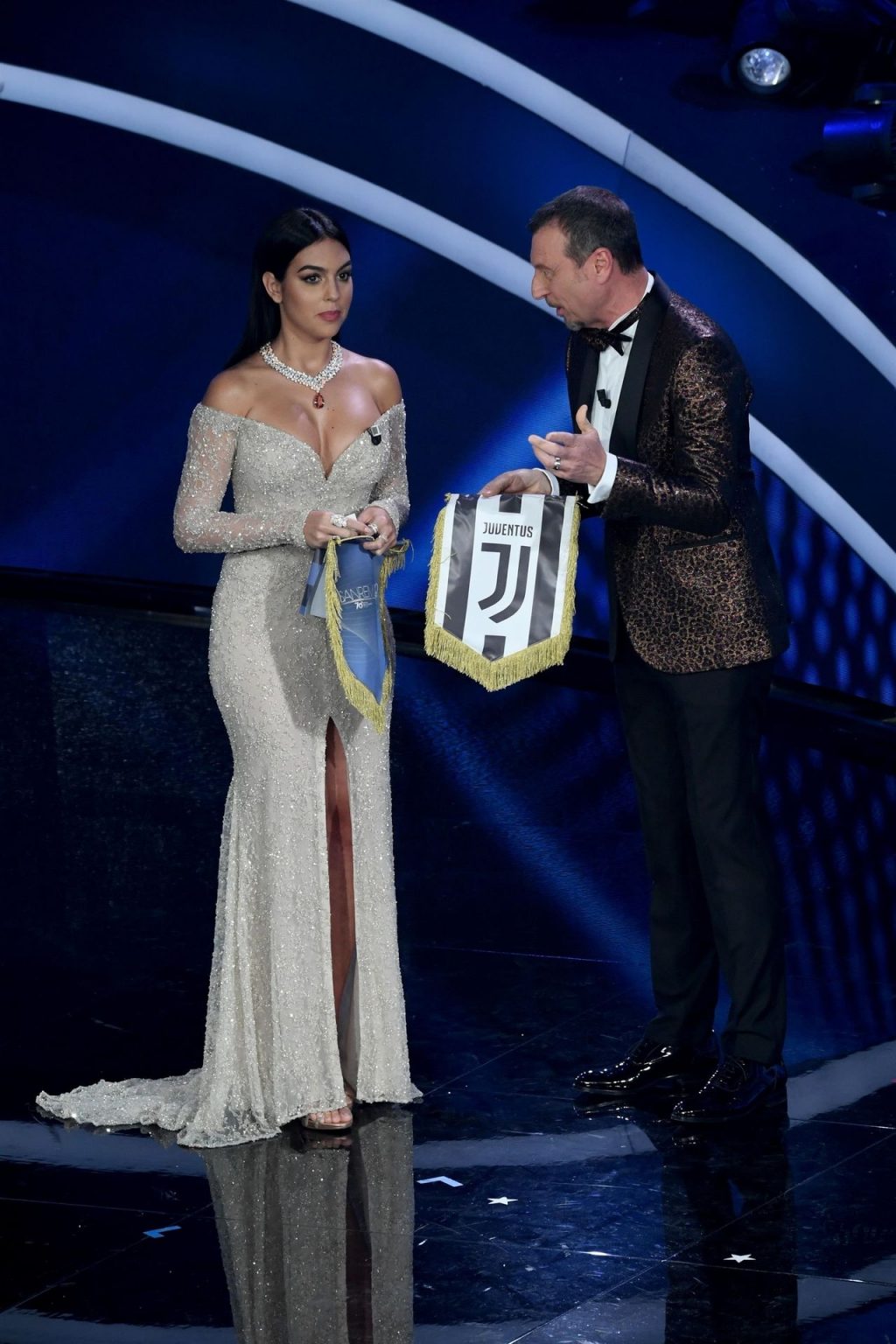 Georgina Rodríguez e Cristiano Ronaldo foram fotografados no 70º Festival de Música de Sanremo, 06/02/2020. Georgina aquece o festival dançando um tango argentino no palco do Ariston durante a terceira noite do evento.