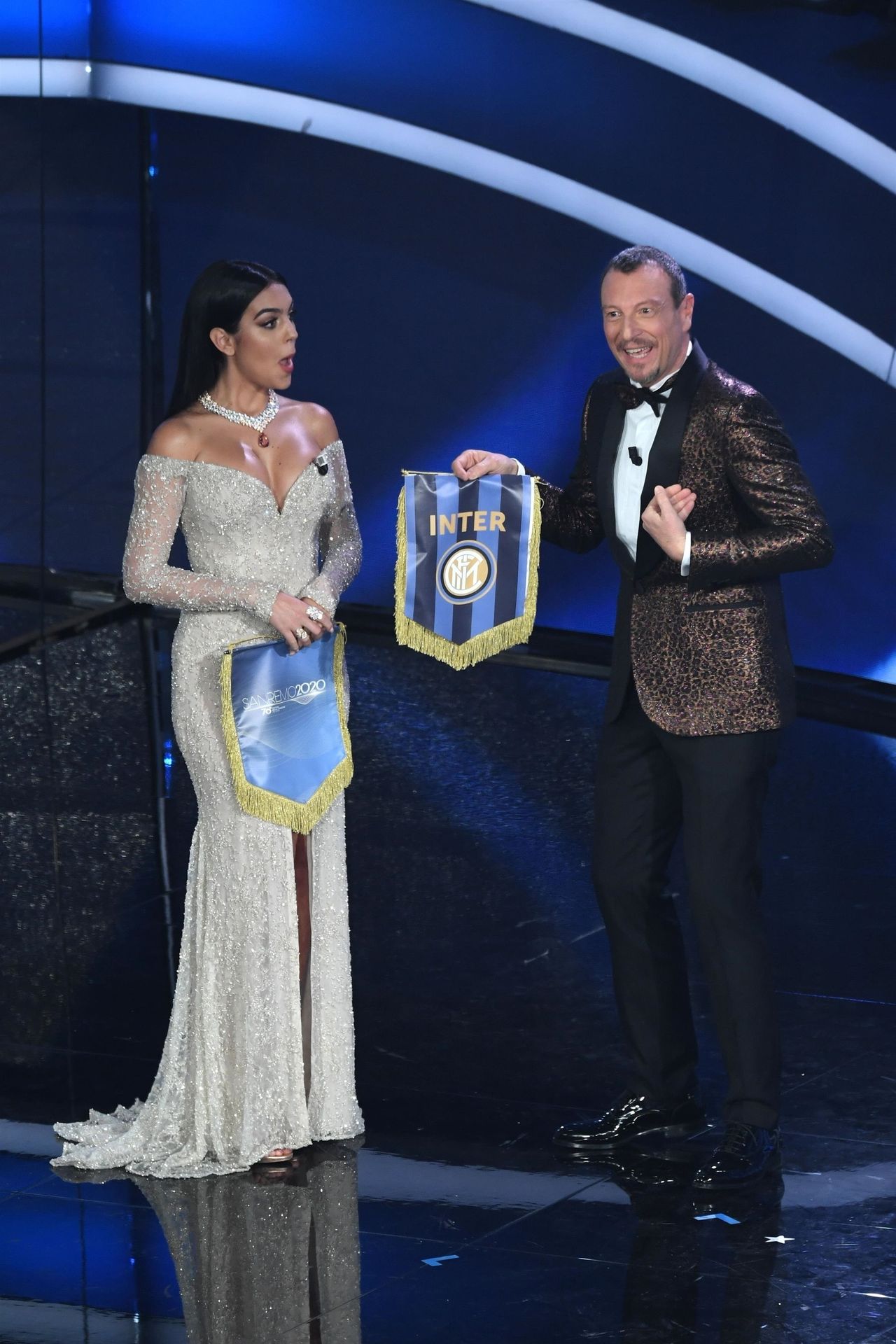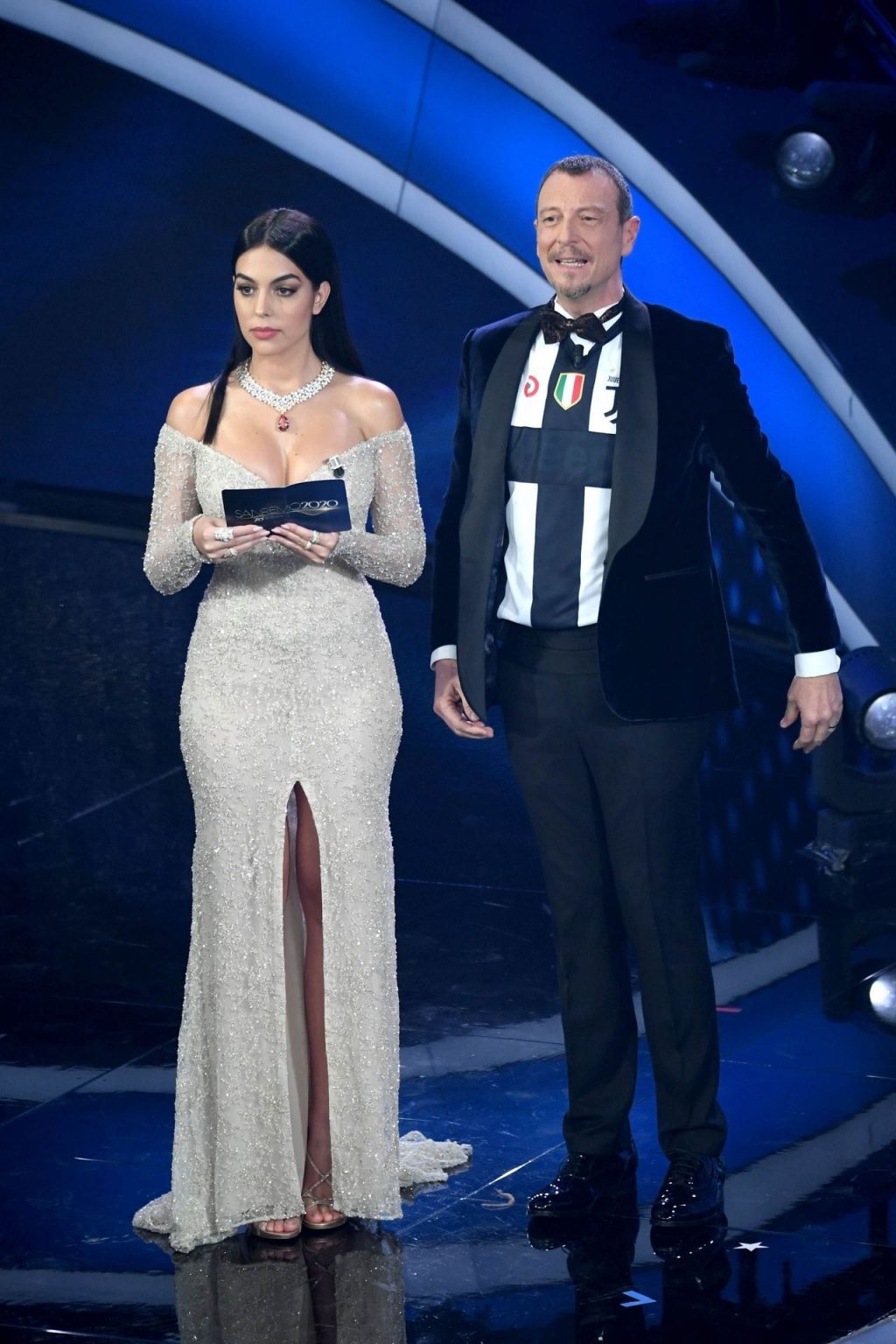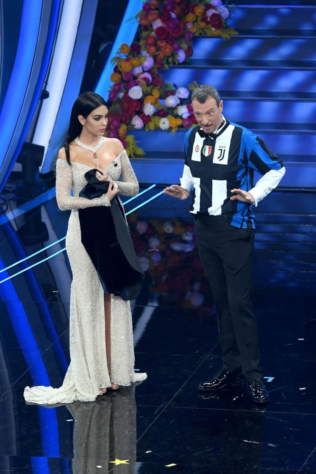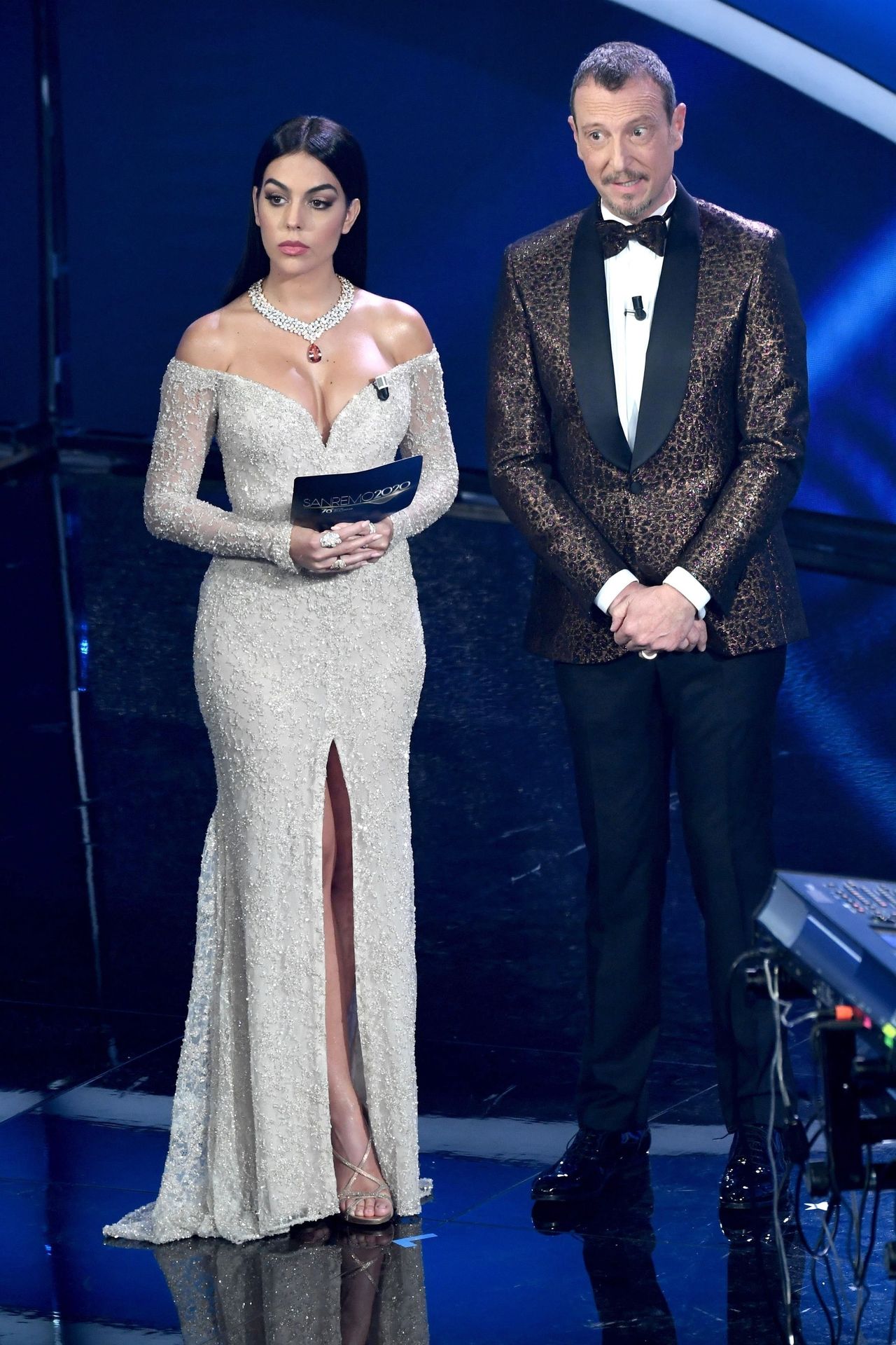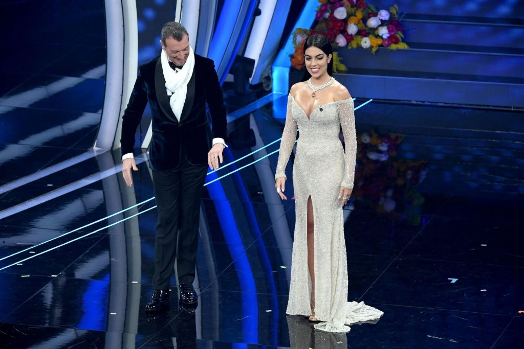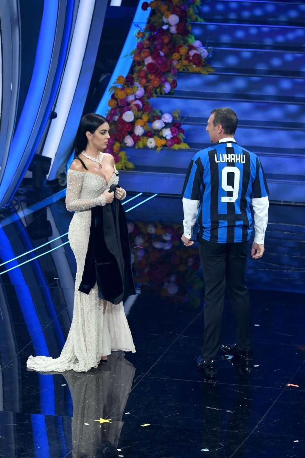 Georgina Rodríguez e Cristiano Ronaldo foram fotografados no 70º Festival de Música de Sanremo, 06/02/2020. Georgina aquece o festival dançando um tango argentino no palco do Ariston durante a terceira noite do evento.
