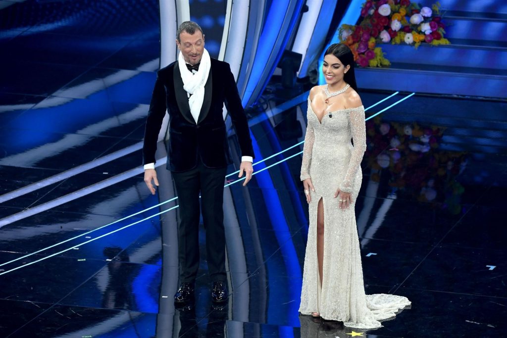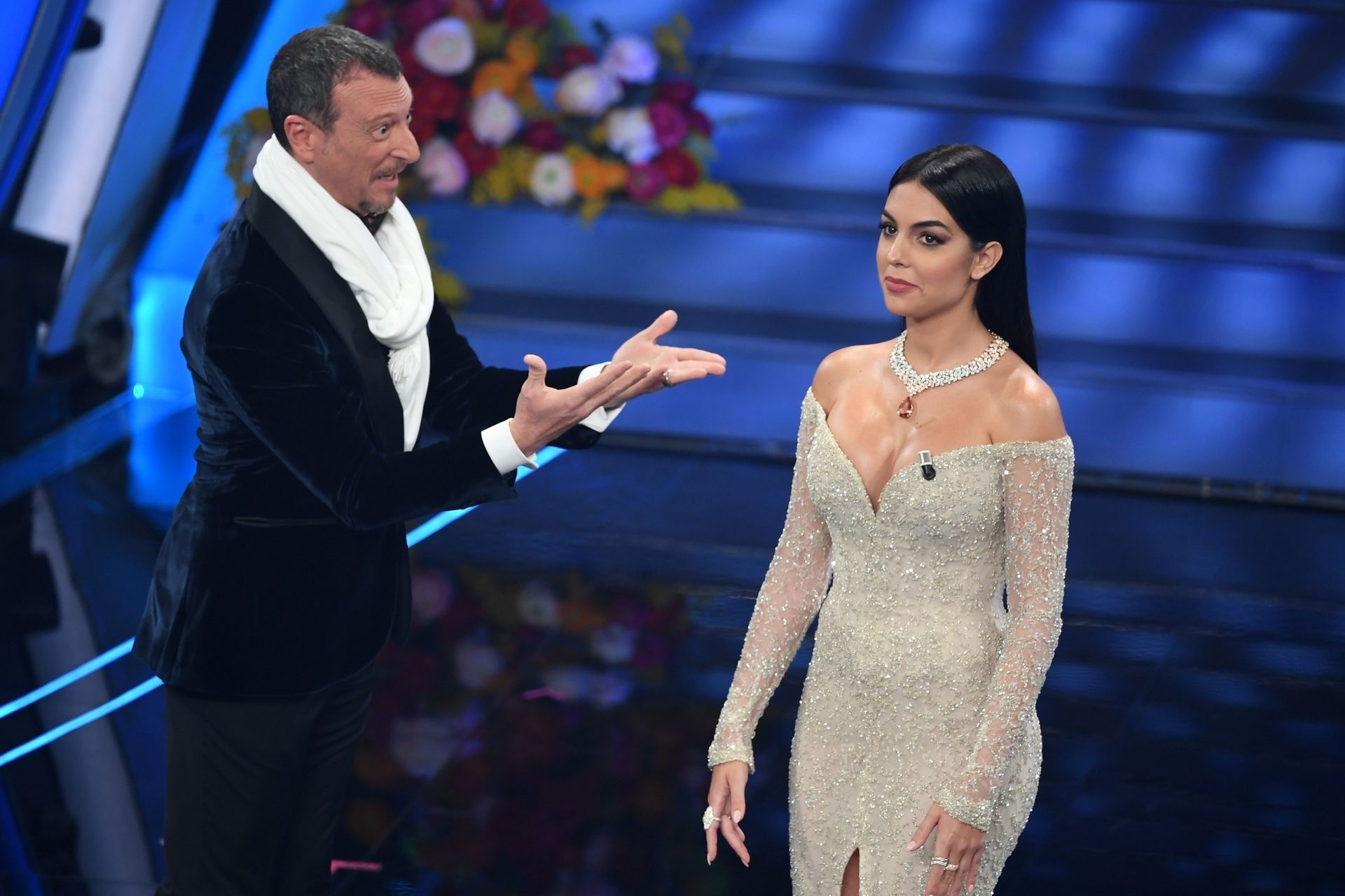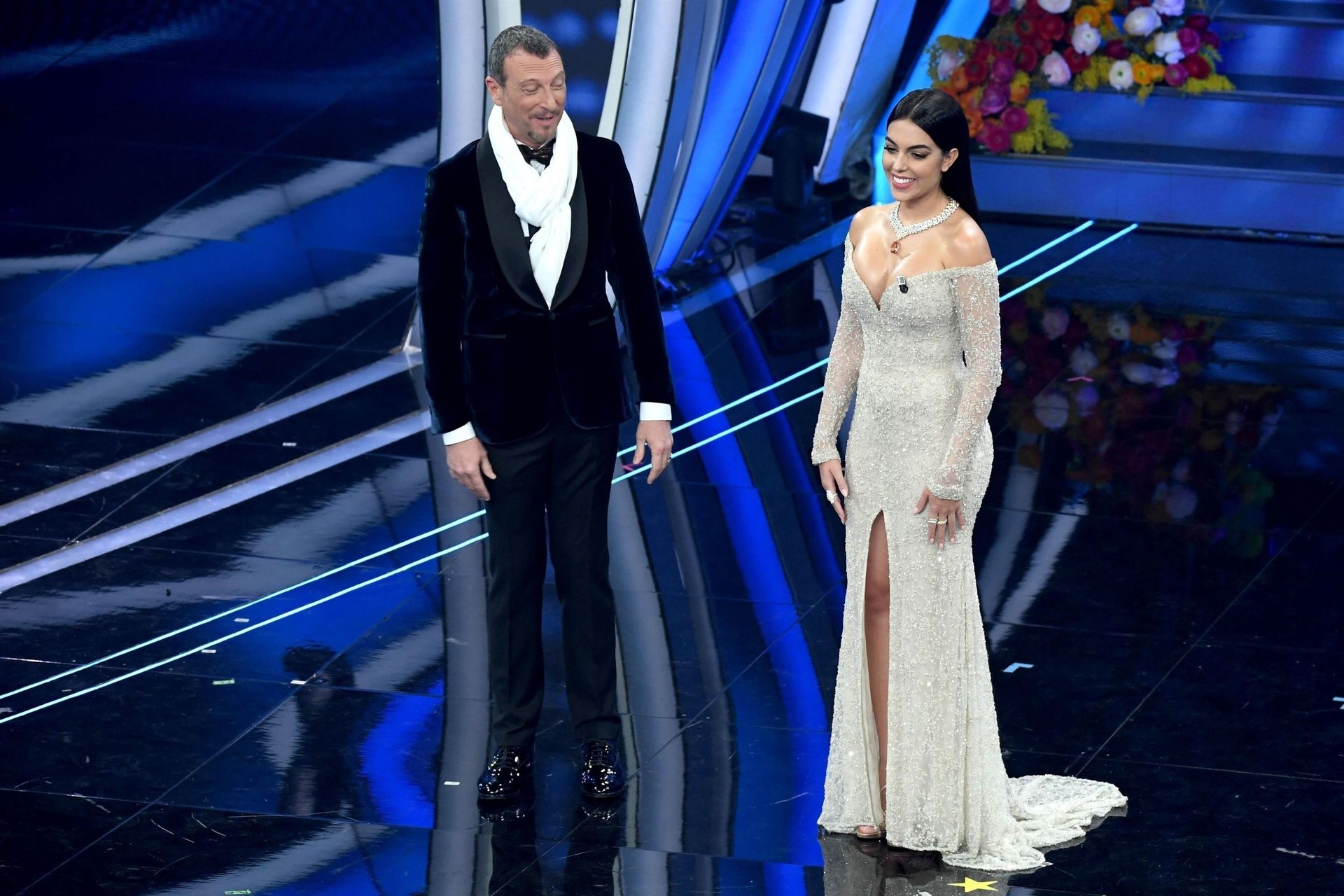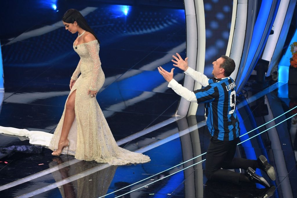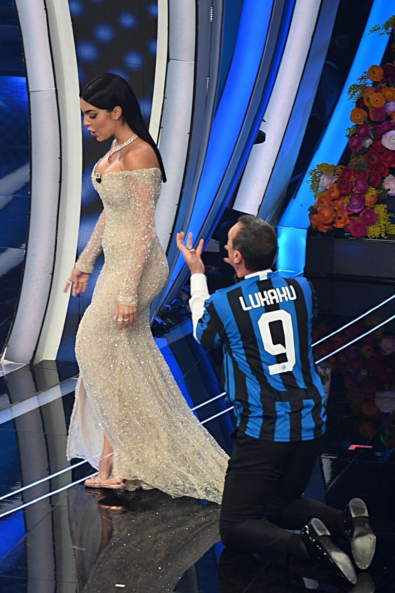 Georgina Rodríguez e Cristiano Ronaldo foram fotografados no 70º Festival de Música de Sanremo, 06/02/2020. Georgina aquece o festival dançando um tango argentino no palco do Ariston durante a terceira noite do evento.