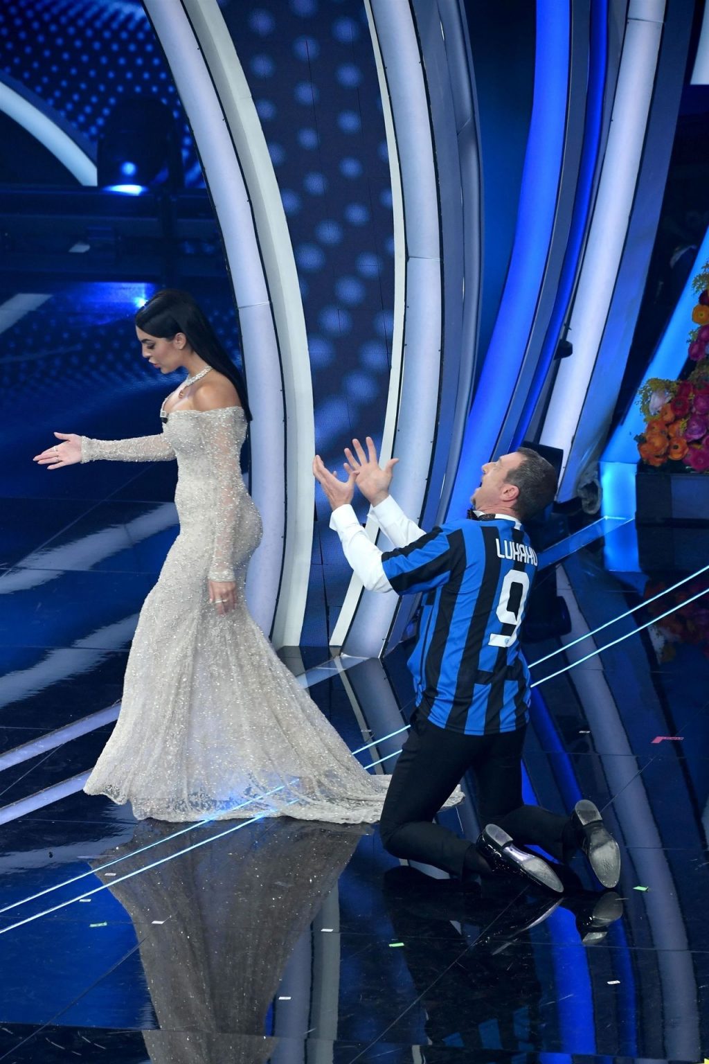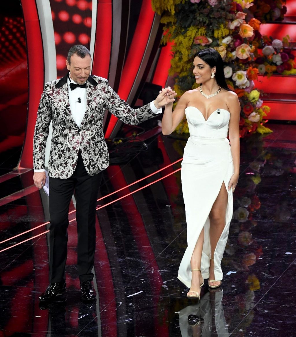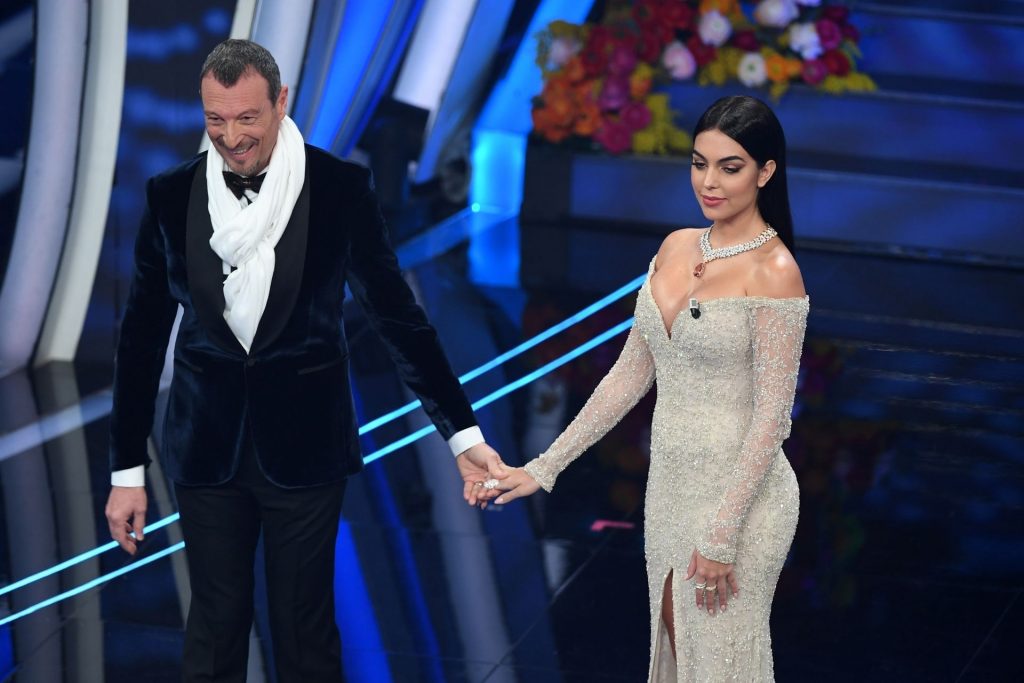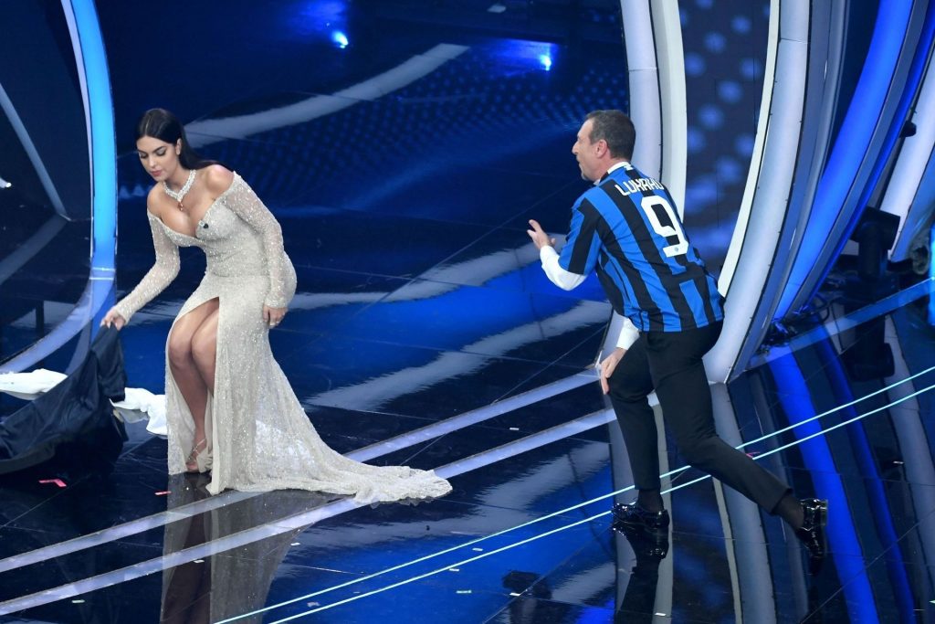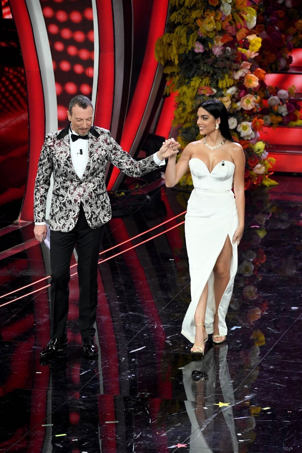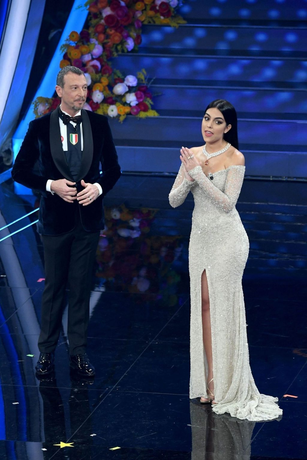 Georgina Rodríguez e Cristiano Ronaldo foram fotografados no 70º Festival de Música de Sanremo, 06/02/2020. Georgina aquece o festival dançando um tango argentino no palco do Ariston durante a terceira noite do evento.