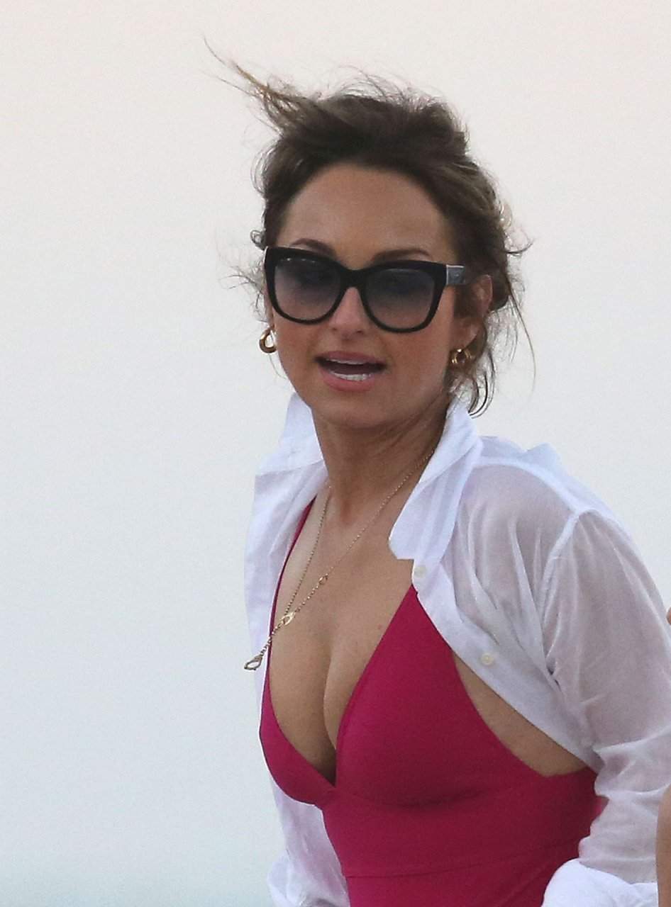 Chef Giada De Laurentiis usa um maiô rosa enquanto relaxa na praia em Miami, 20/02/2019.