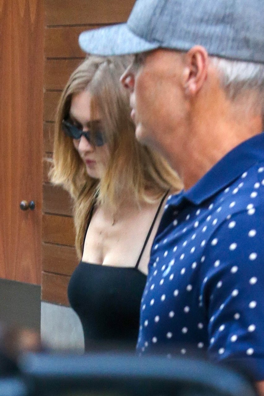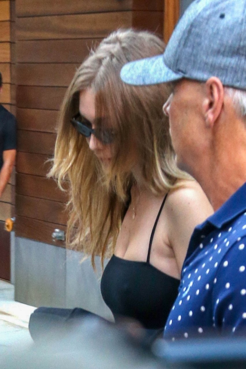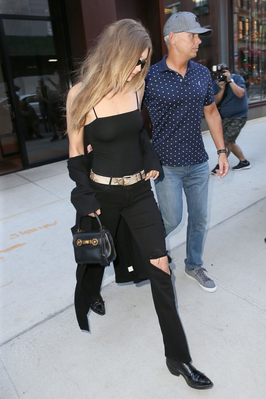 Gigi Hadid vai sem sutiã com uma blusa sem mangas e calças pretas rasgadas a caminho do show de Taylor Swift em New Jersey, 20/07/2018.