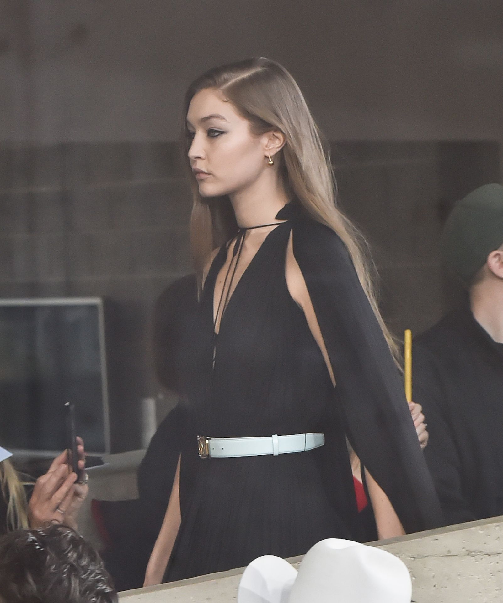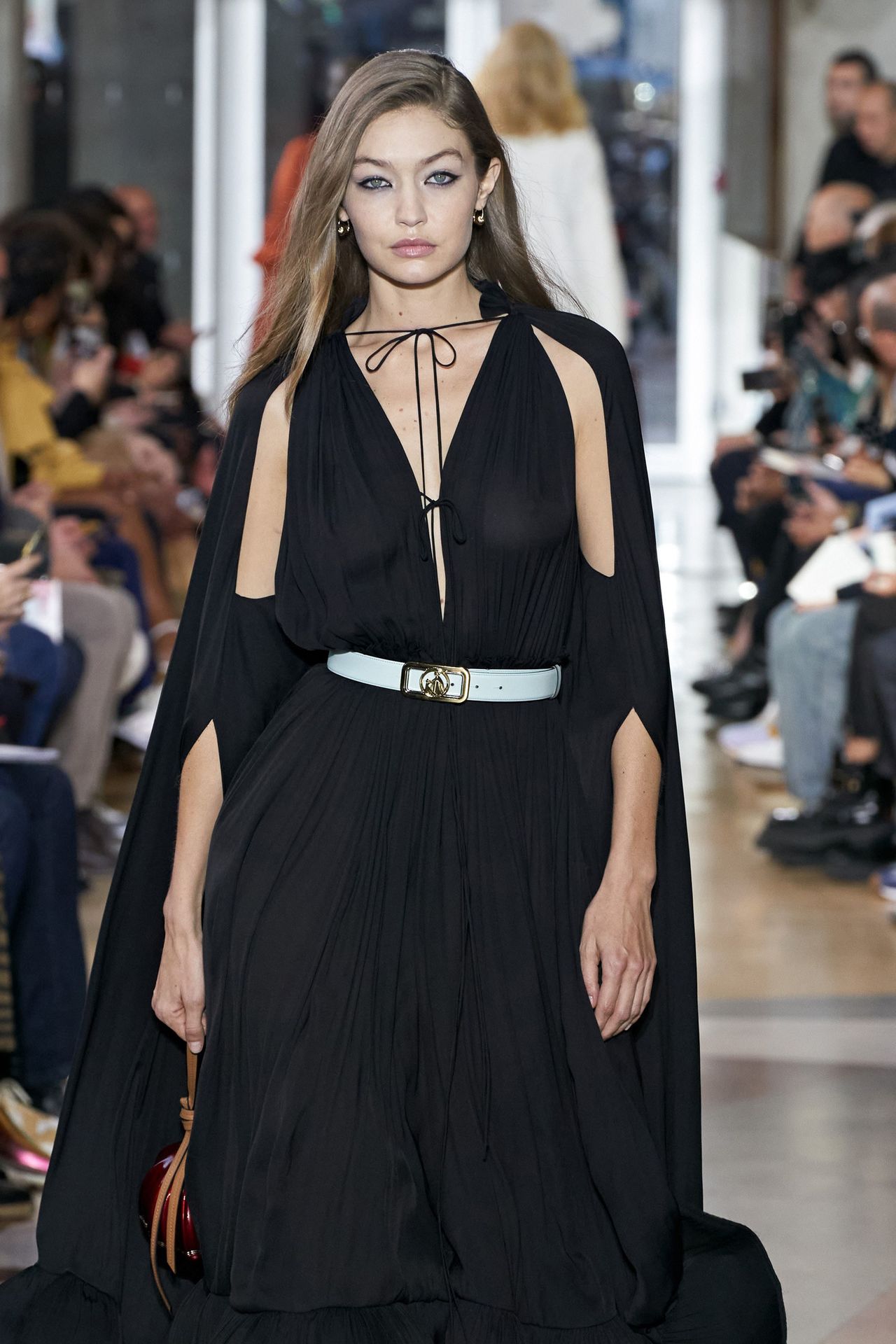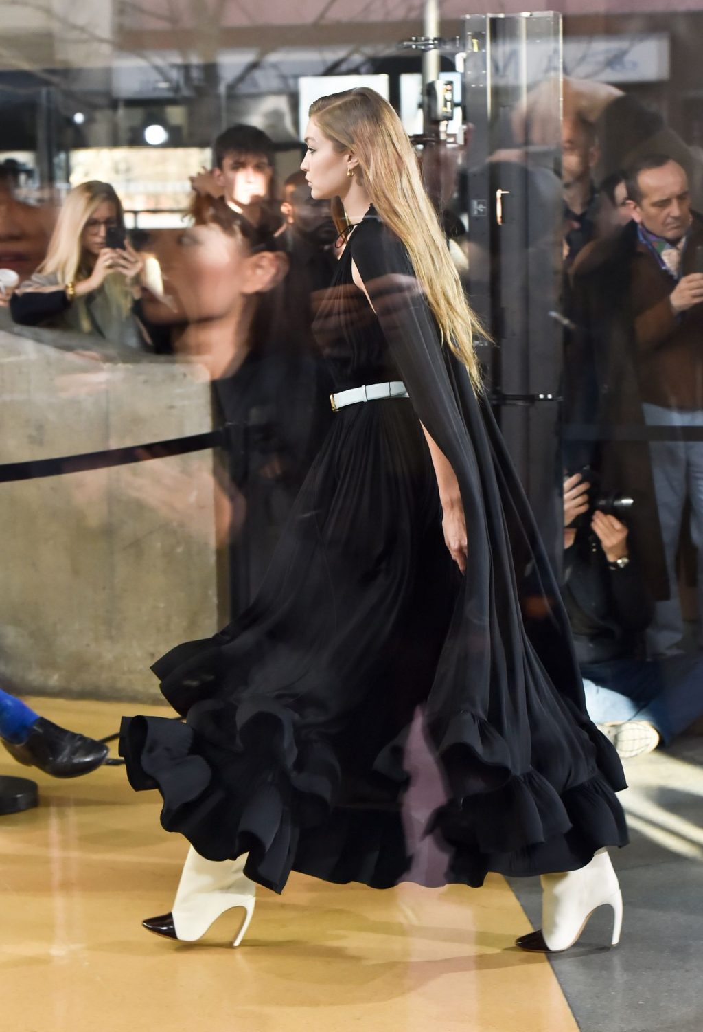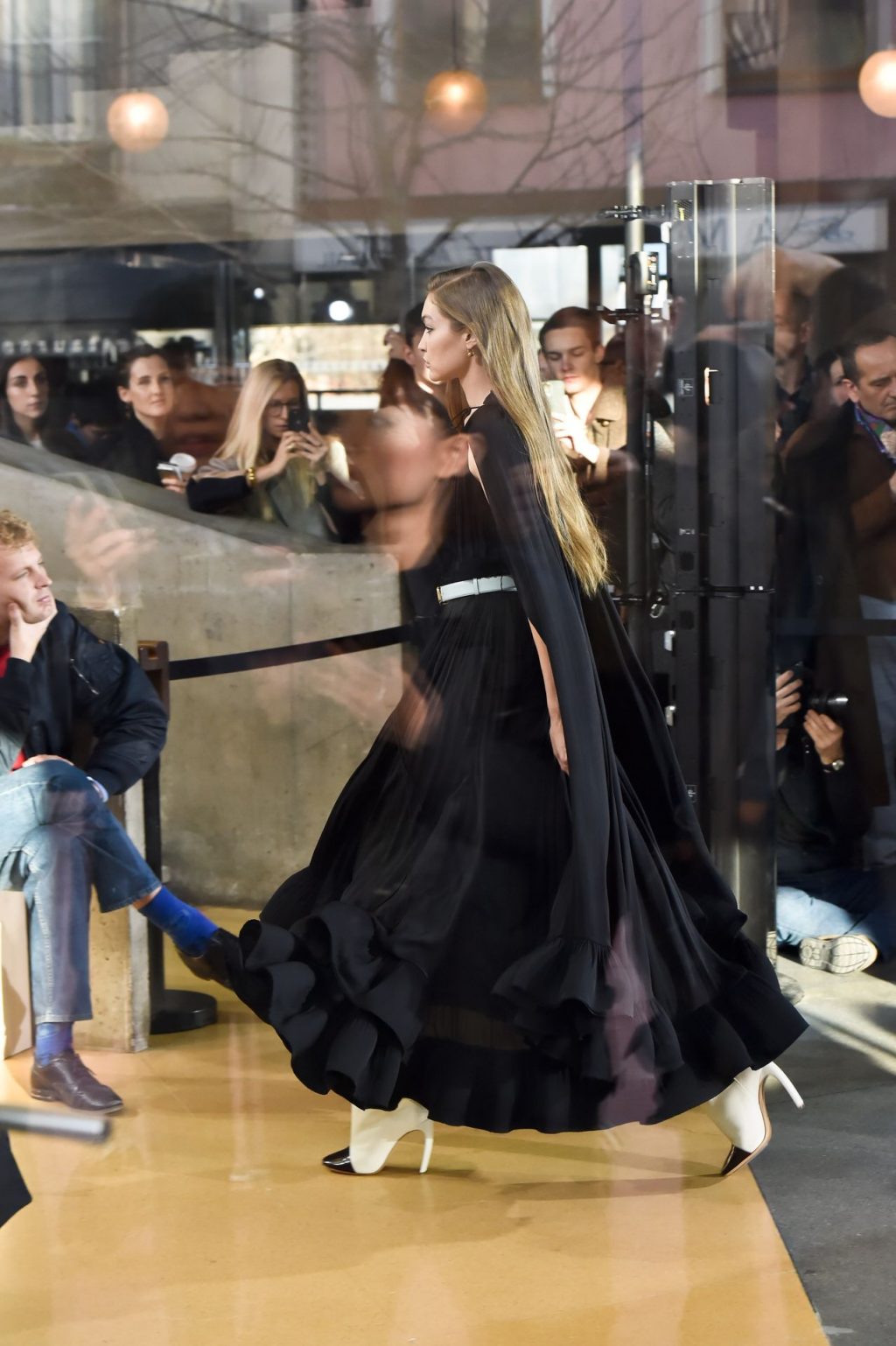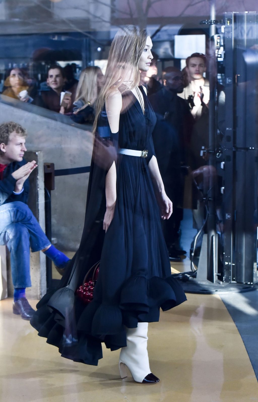 Model Gigi Hadid foi vista caminhando sem sutiã na passarela da Lanvin, durante o desfile de moda em Paris, 19/01/2020.