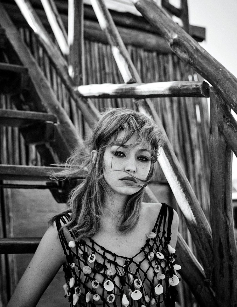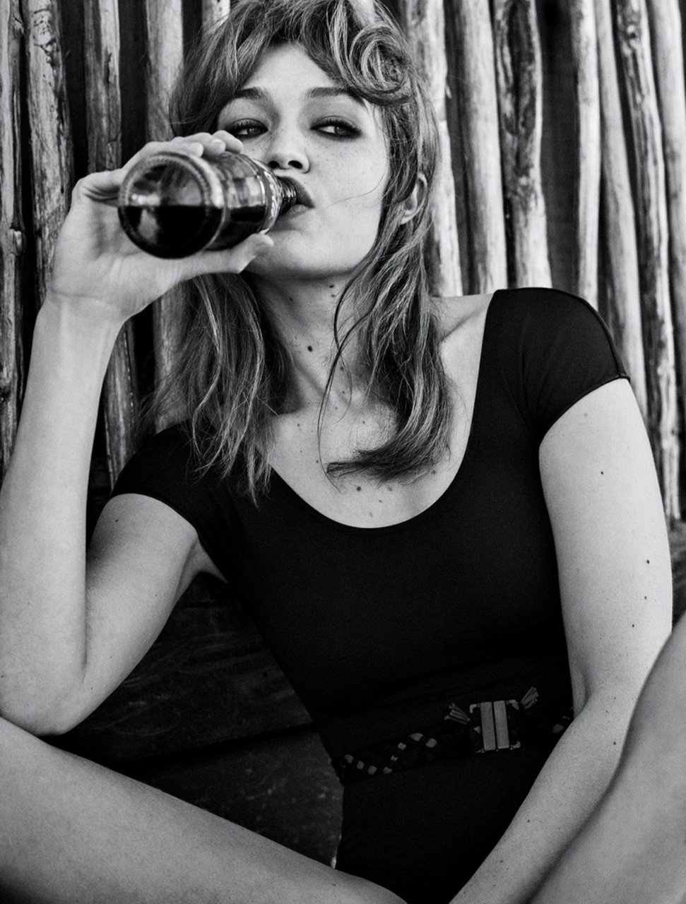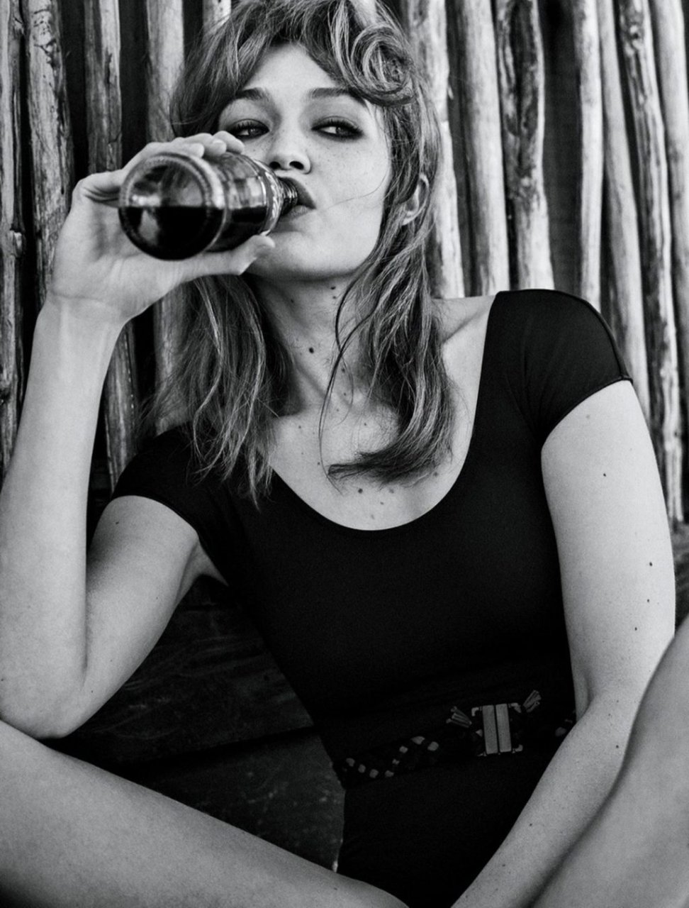 Para o ensaio acompanhante, Gigi transmite vibrações retrô com franja e looks de maiô estilizados por Paul Cavaco.