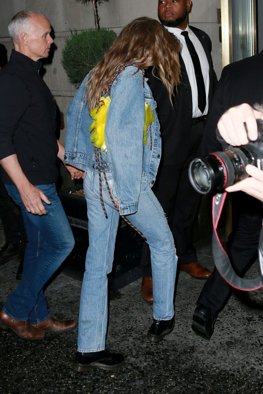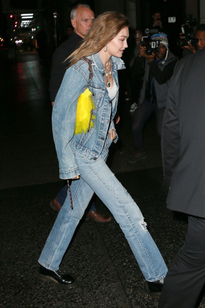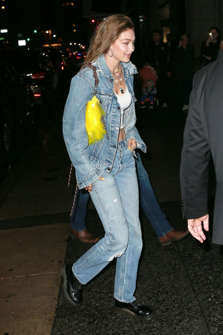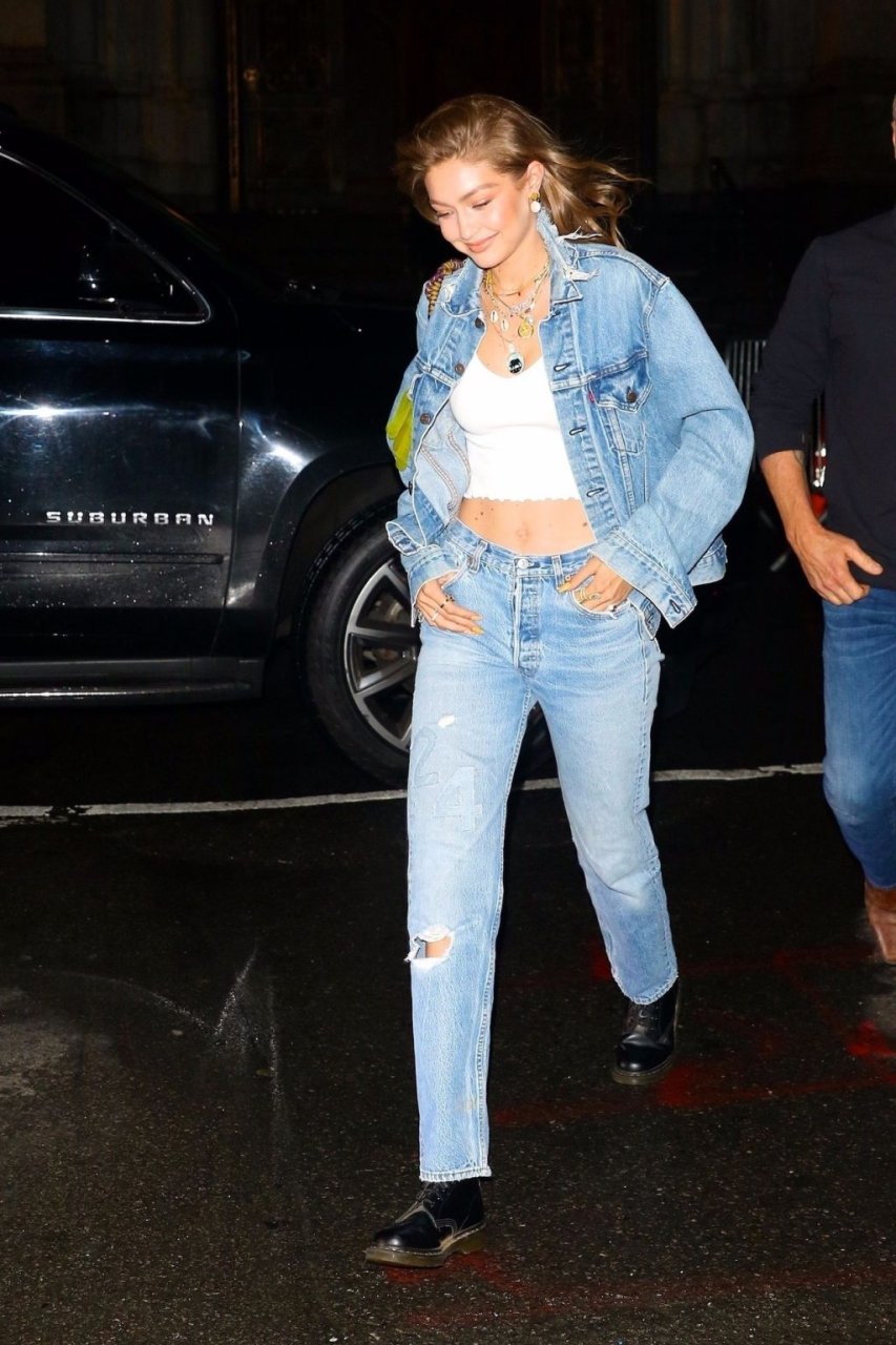 As celebrações estão a todo vapor para a supermodelo internacional, Gigi Hadid. Gigi está em Nova York comemorando seu próximo 24º aniversário e a modelo opta por um conjunto de aniversário em jeans duplo, 22/04/2019.
