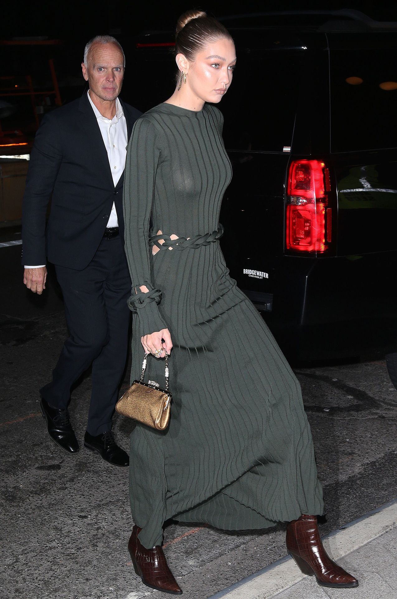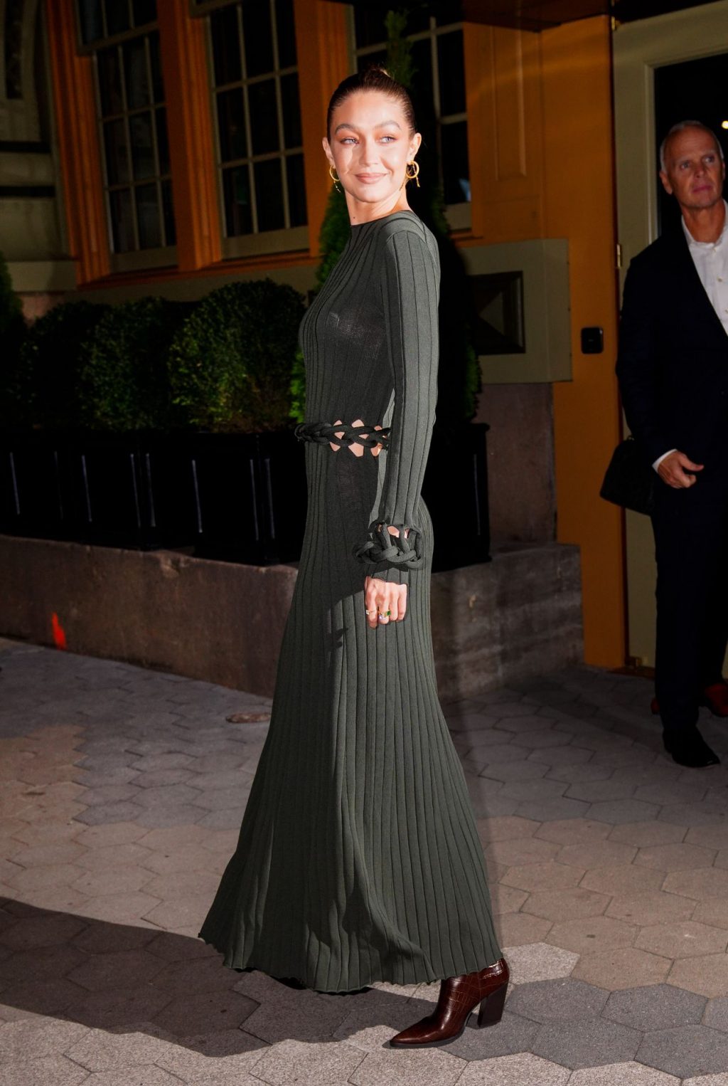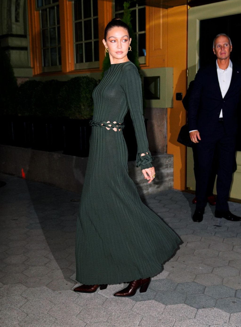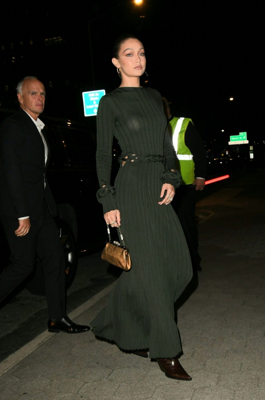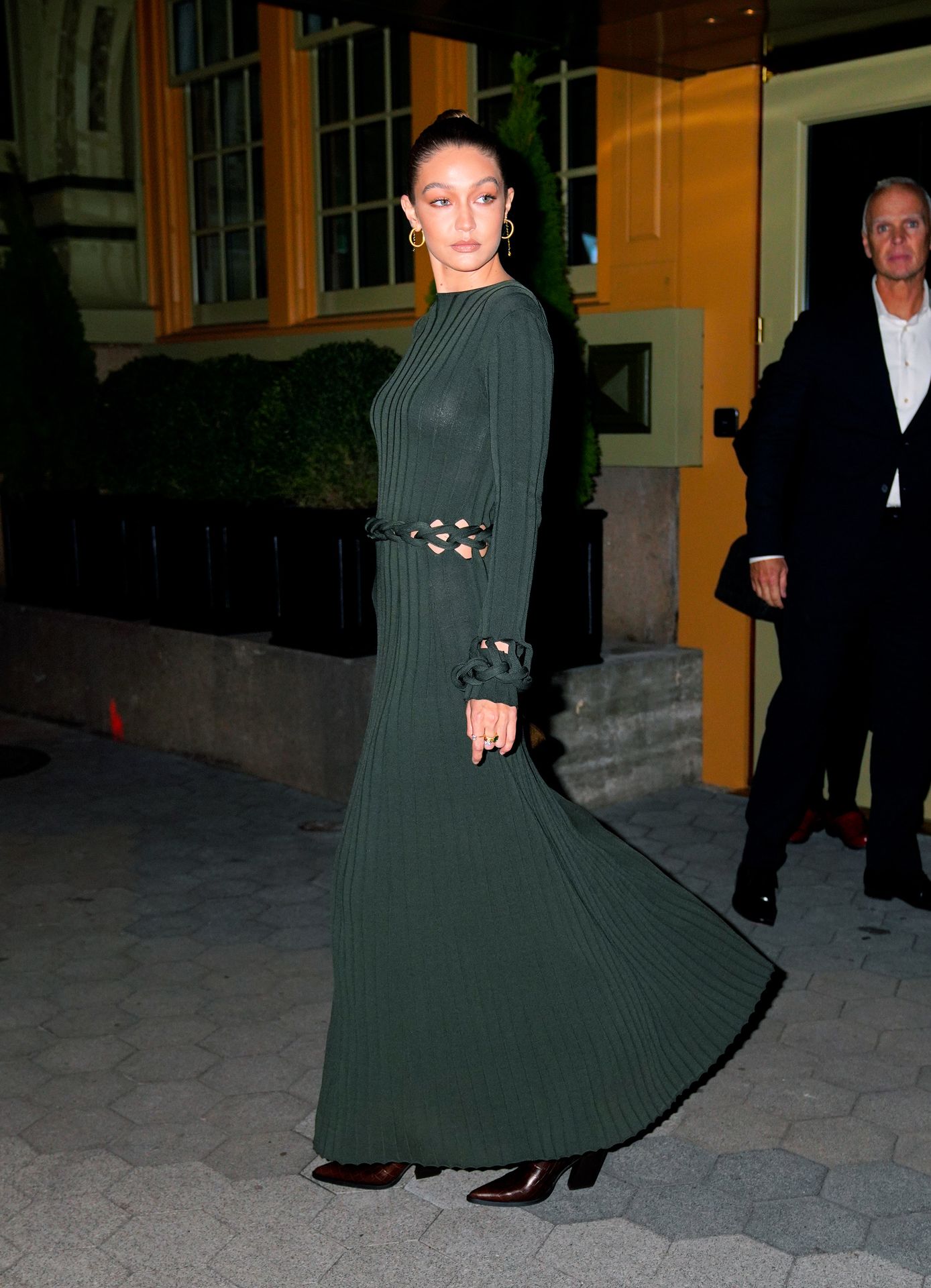 Modelo elegante Gigi Hadid chega com um longo vestido verde transparente no prêmio CFDA em Nova York, 11/04/2019.