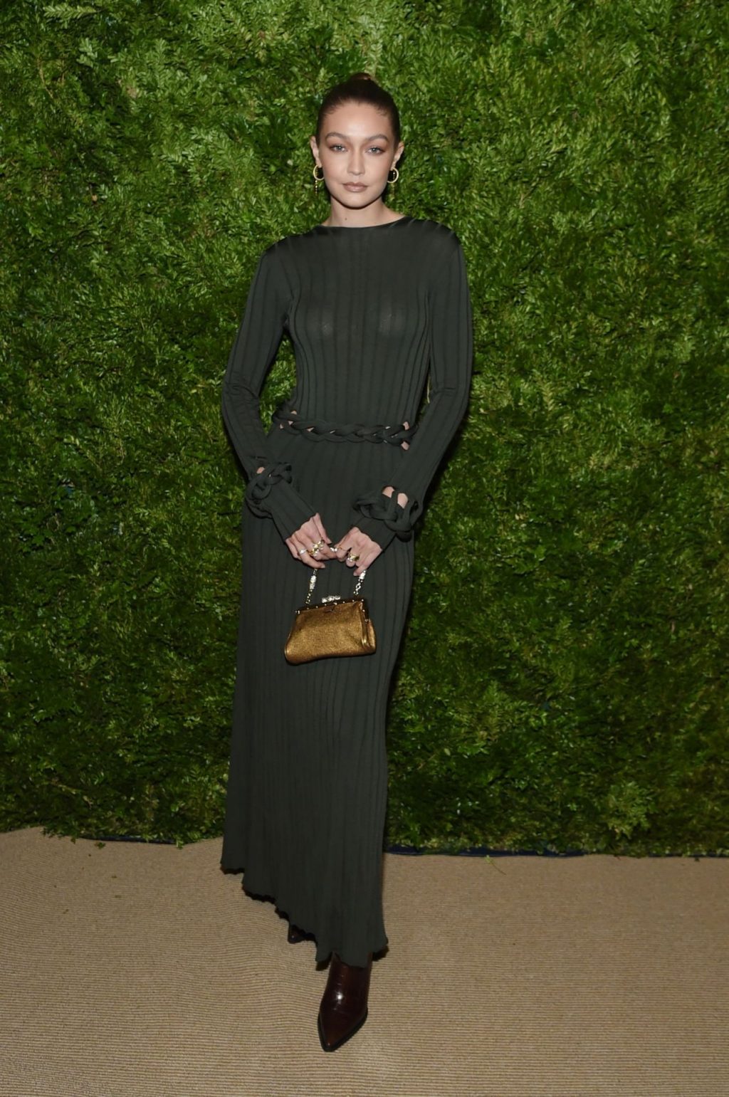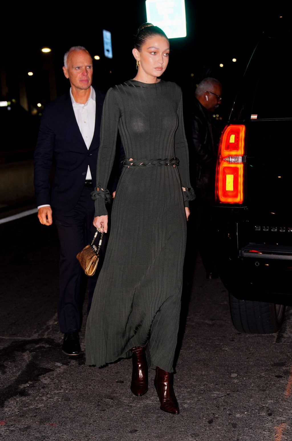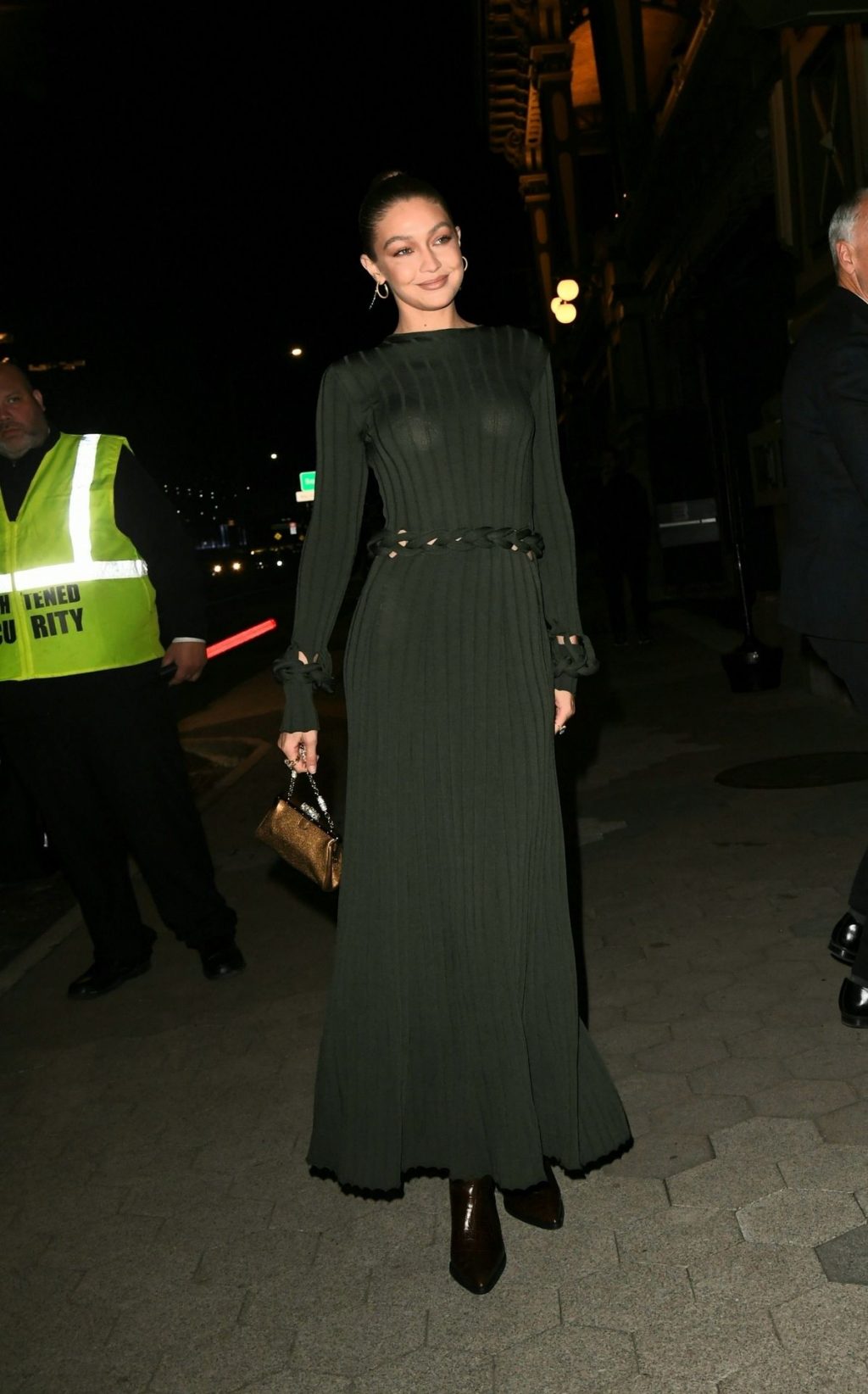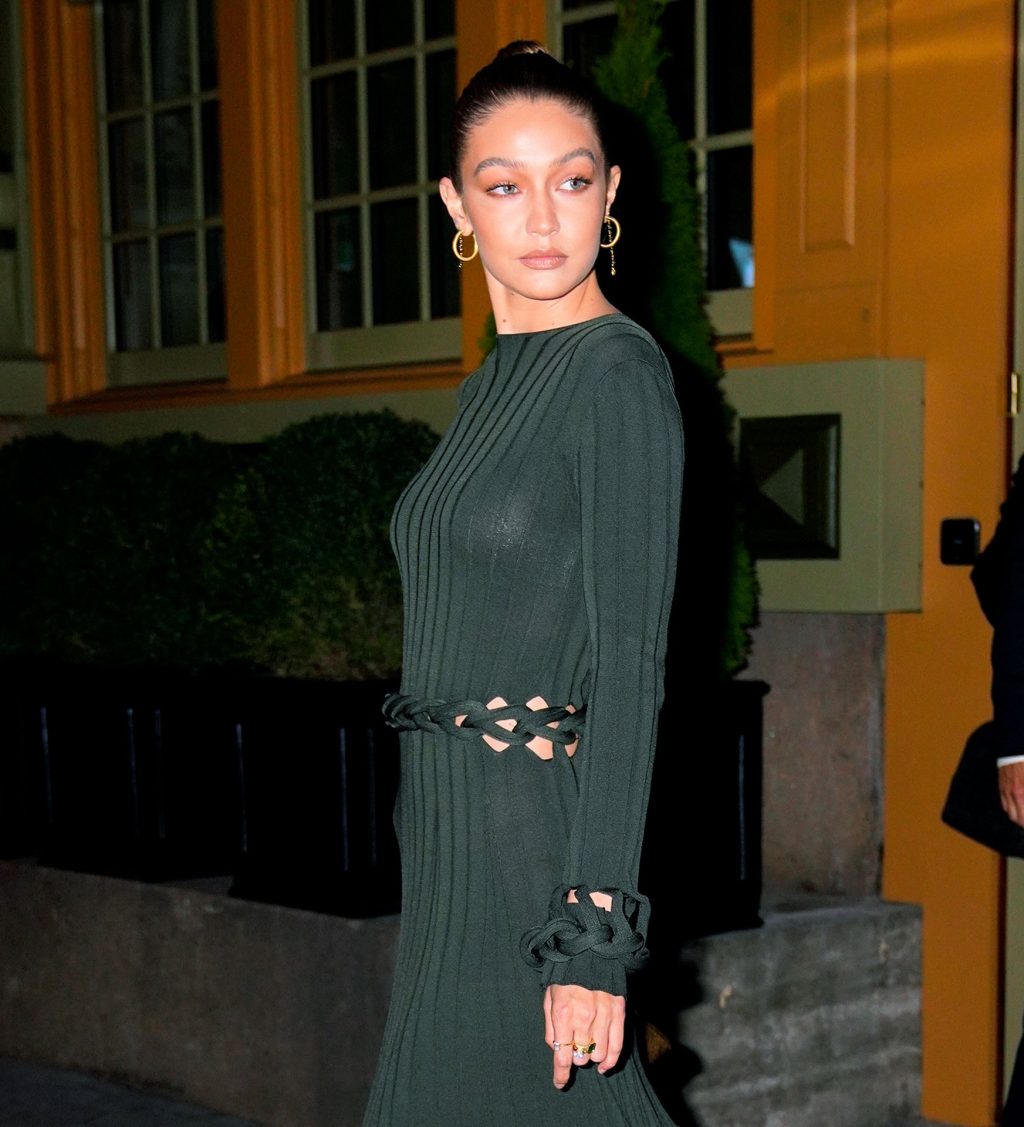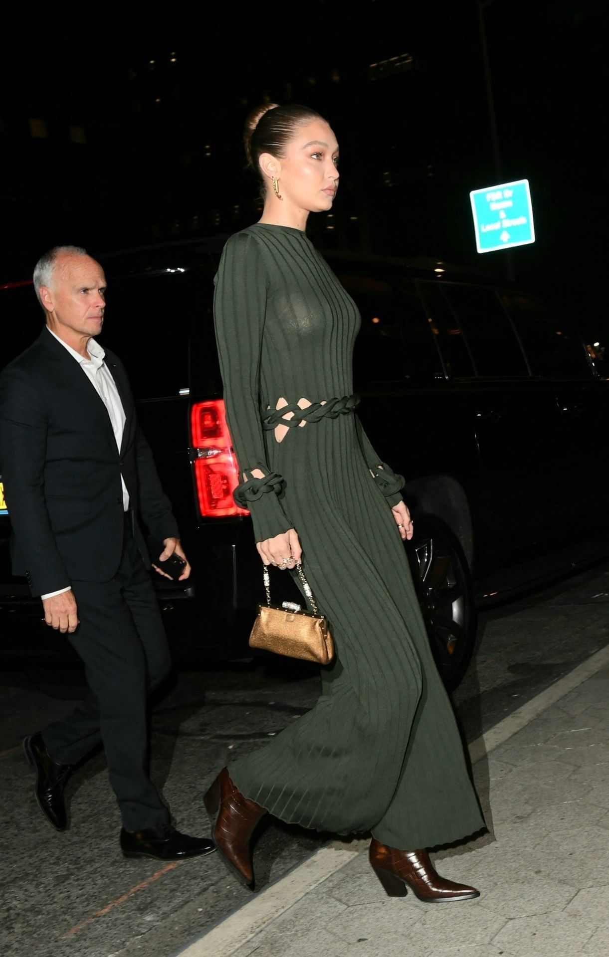 Modelo elegante Gigi Hadid chega com um longo vestido verde transparente no prêmio CFDA em Nova York, 11/04/2019.