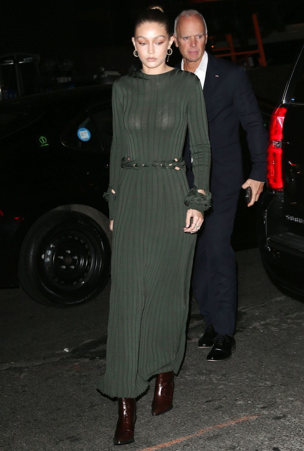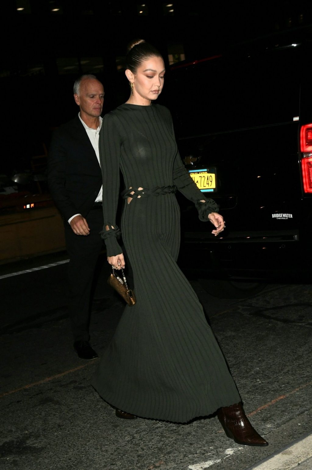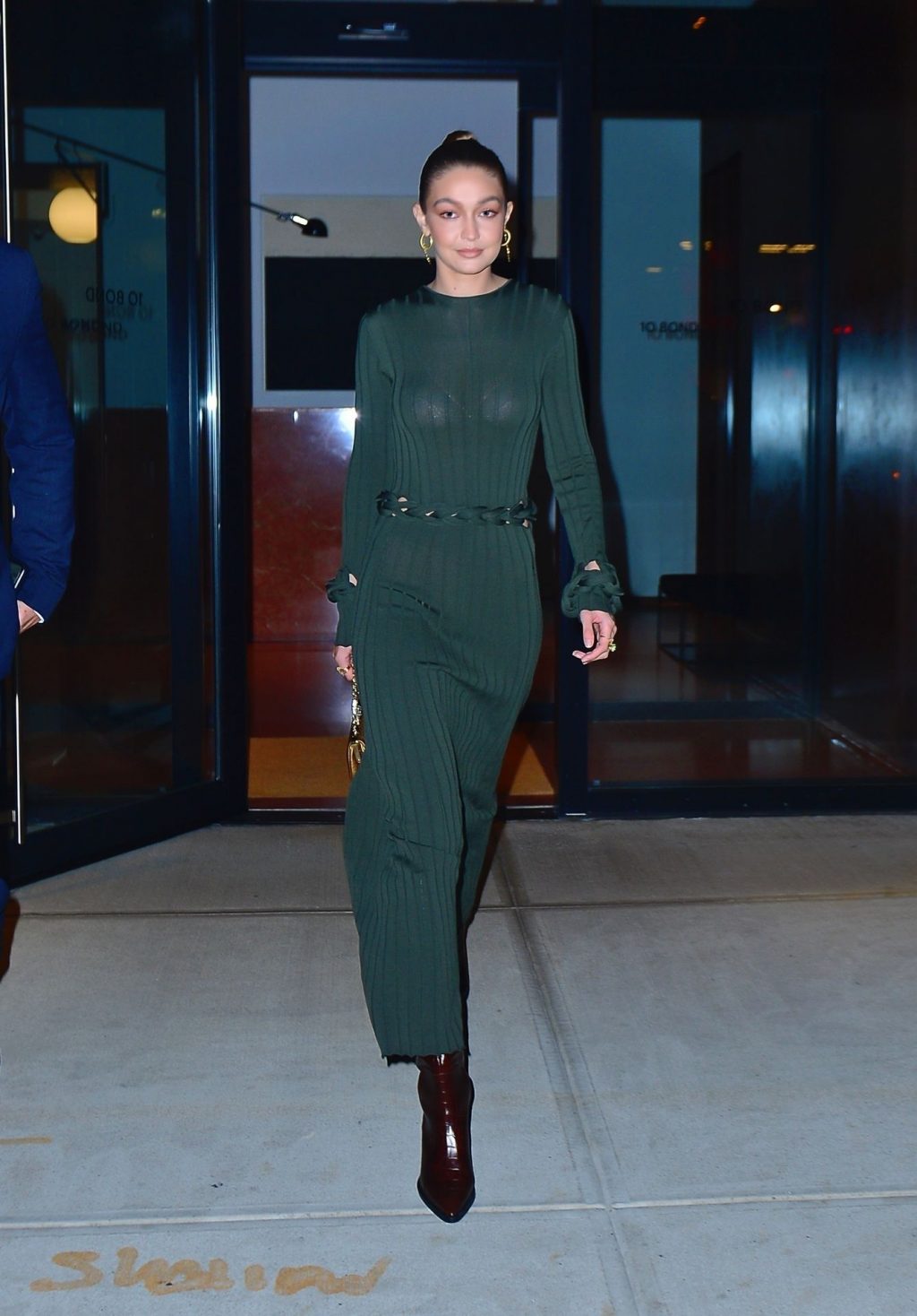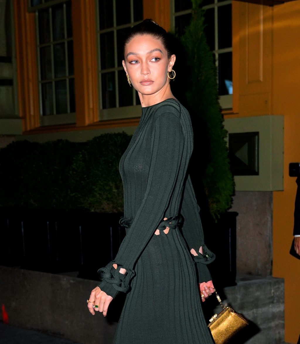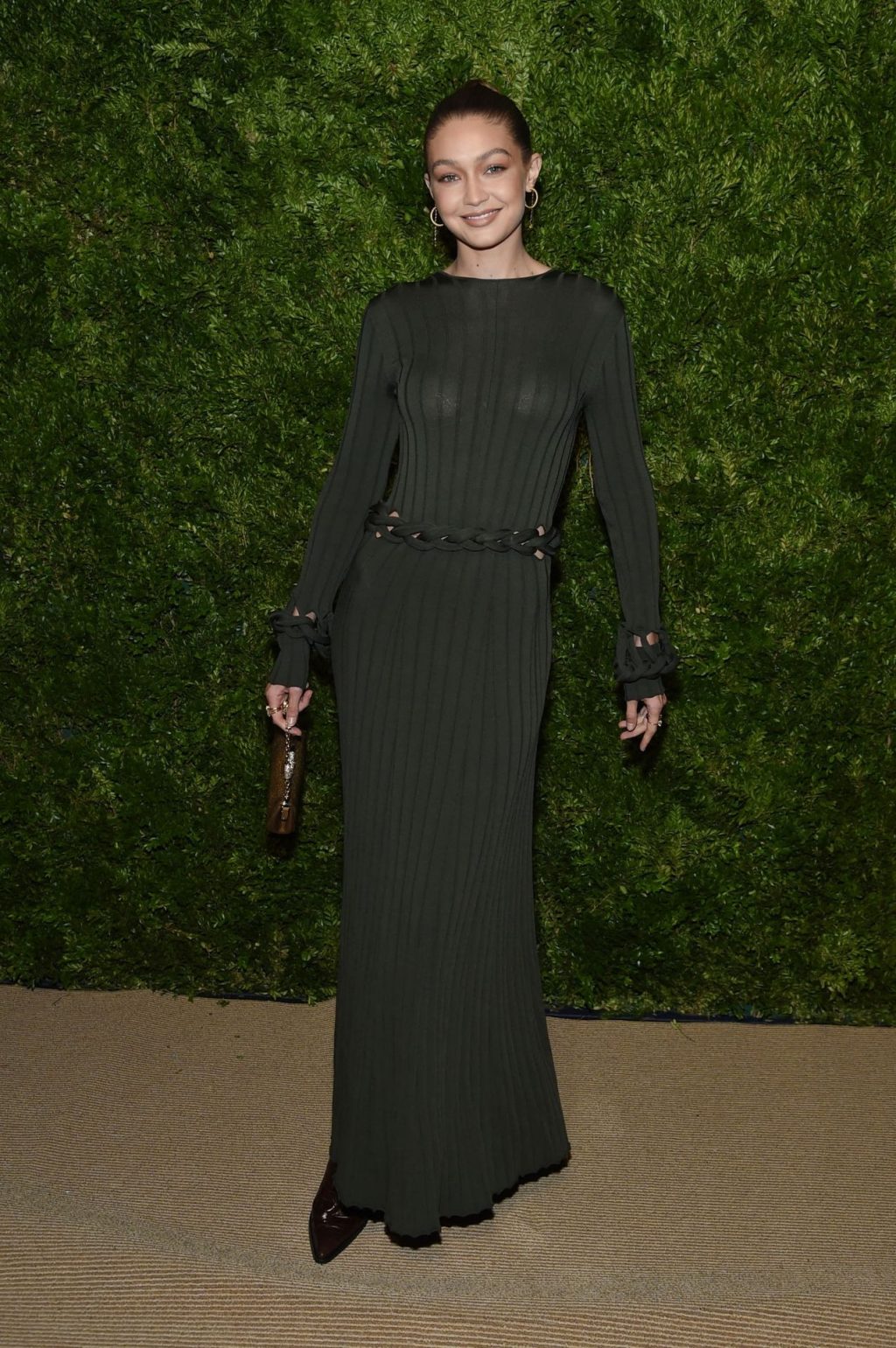 Modelo elegante Gigi Hadid chega com um longo vestido verde transparente no prêmio CFDA em Nova York, 11/04/2019.
