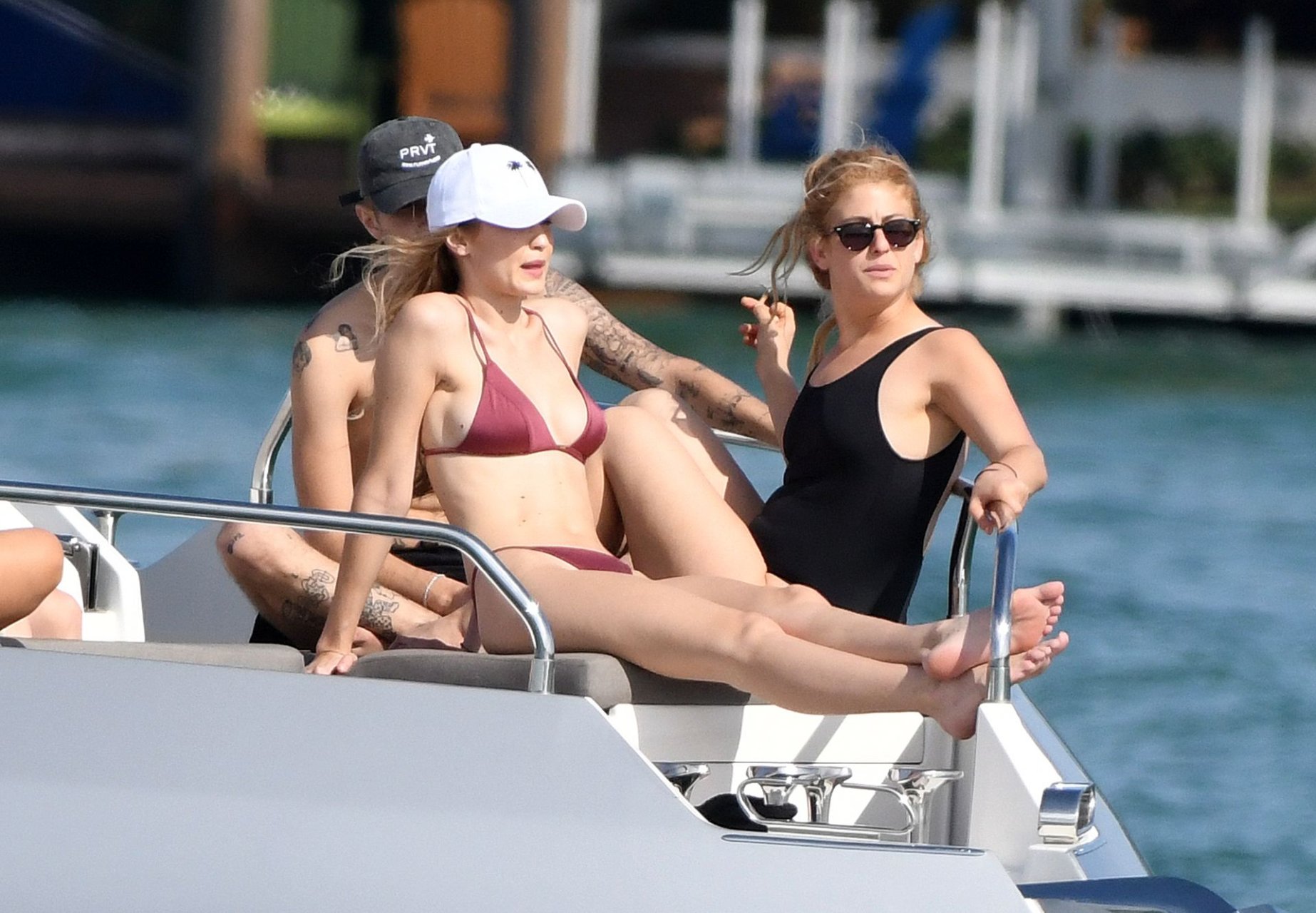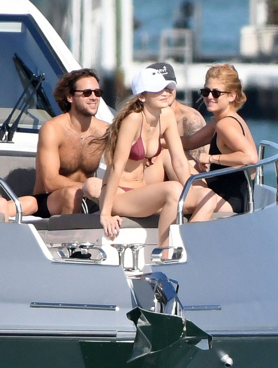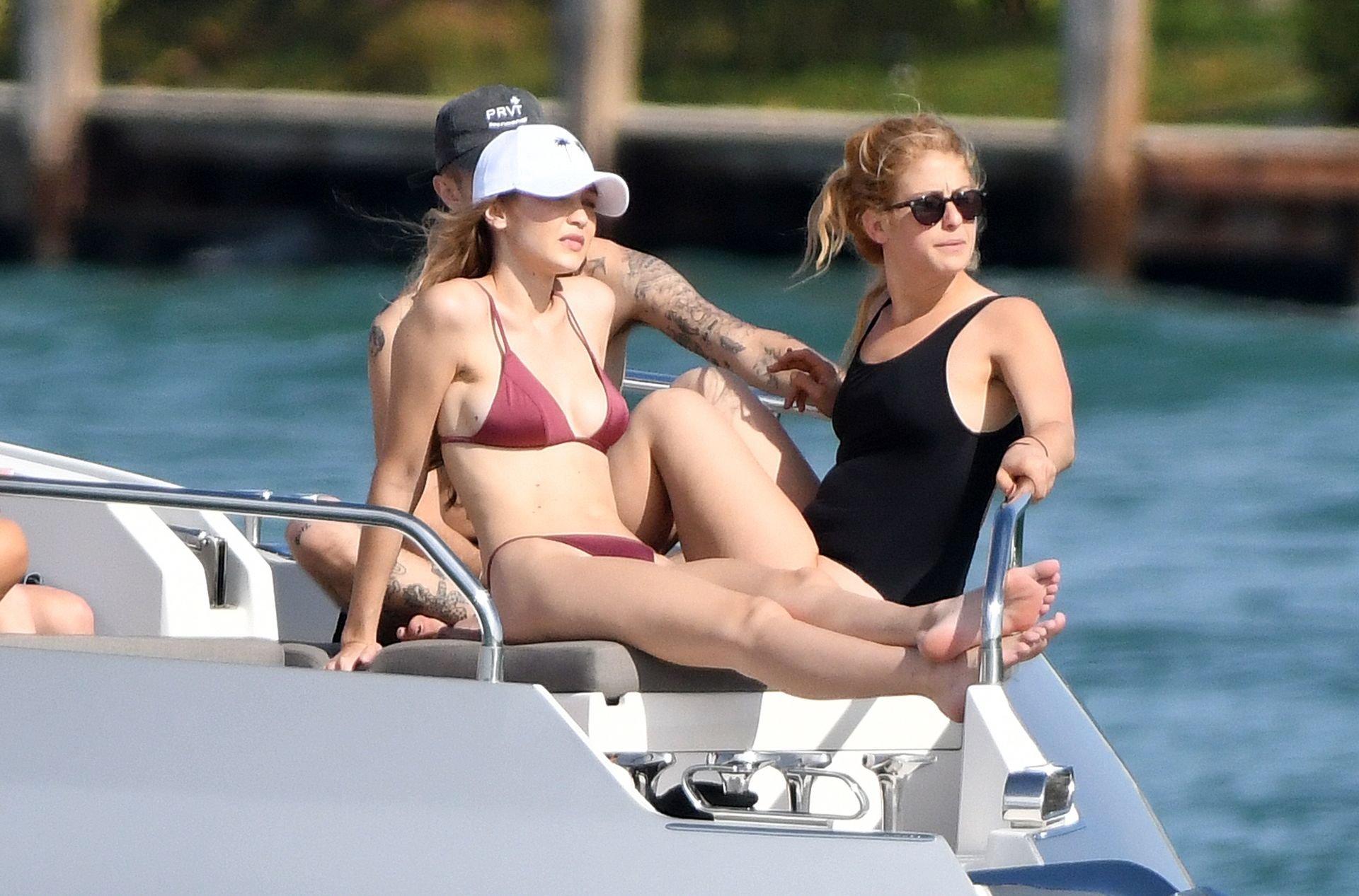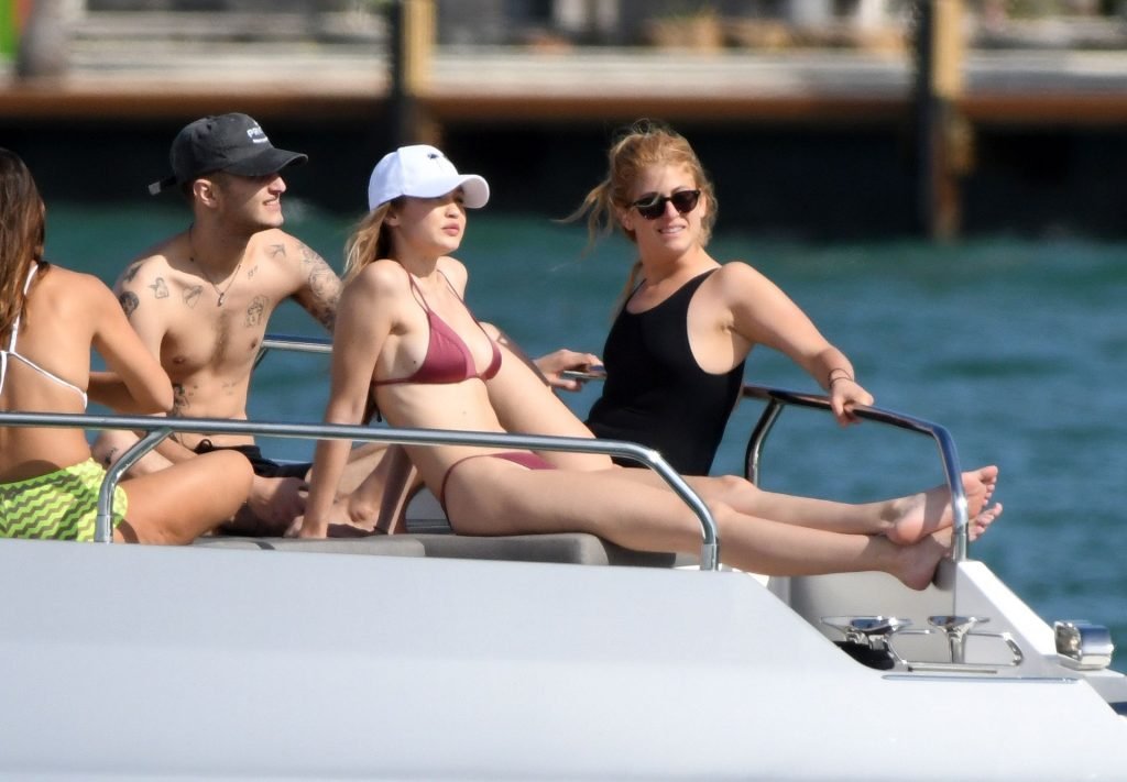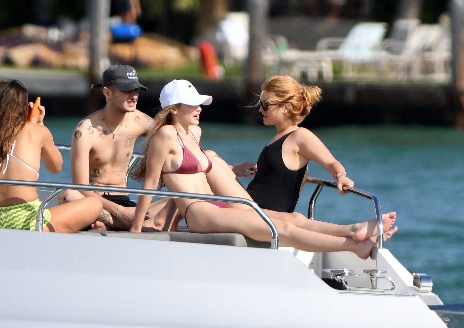 Model Gigi Hadid (23) é vista usando um biquíni vinho enquanto navega em um iate com o irmão Anwar Hadid e alguns amigos em Miami, 25/11/2018.