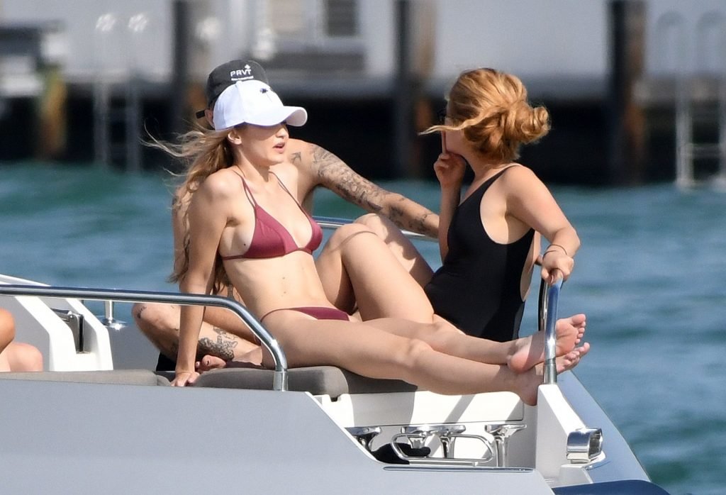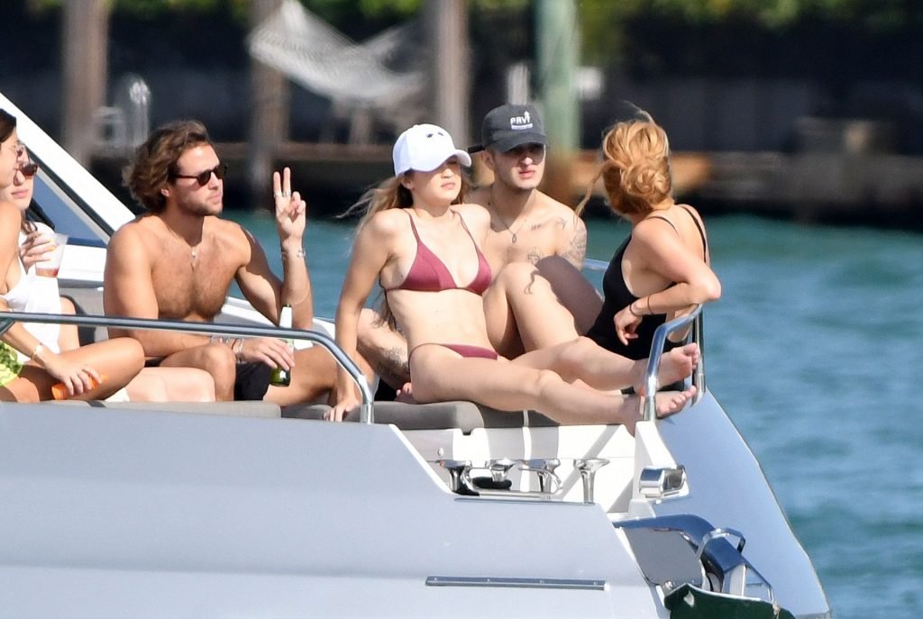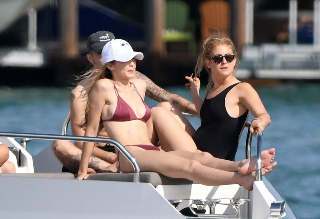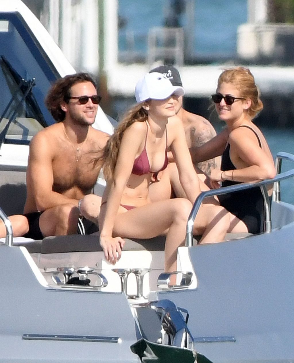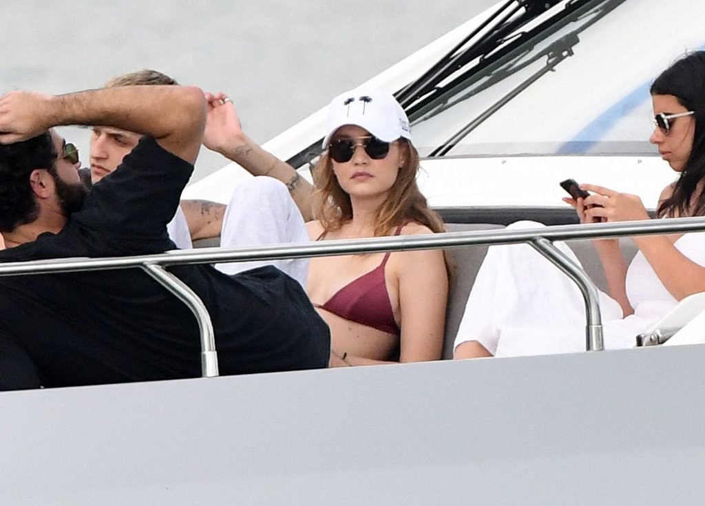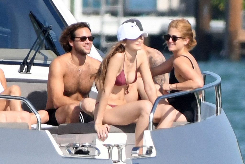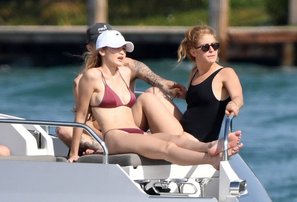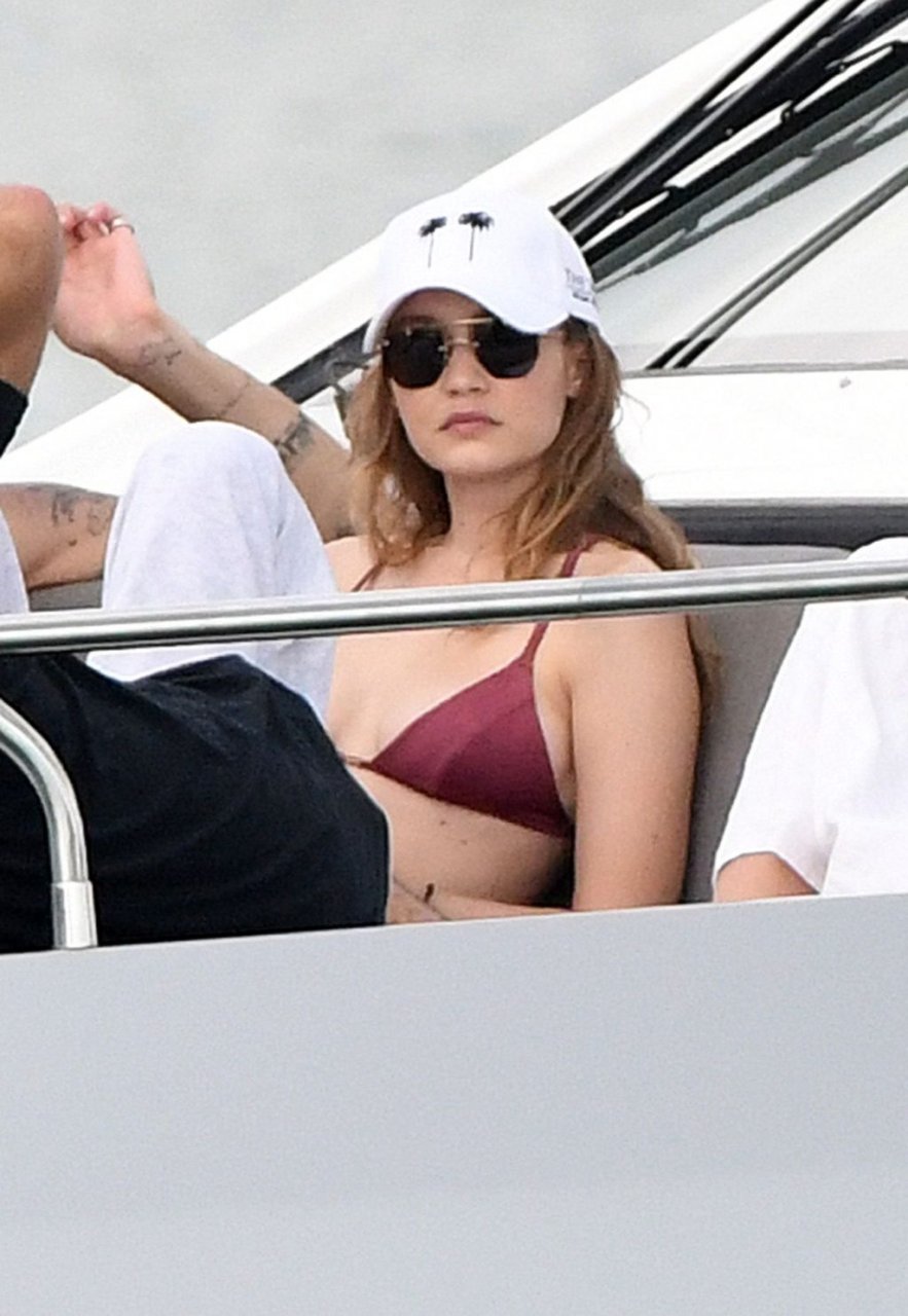 Model Gigi Hadid (23) é vista usando um biquíni vinho enquanto navega em um iate com o irmão Anwar Hadid e alguns amigos em Miami, 25/11/2018.