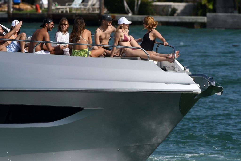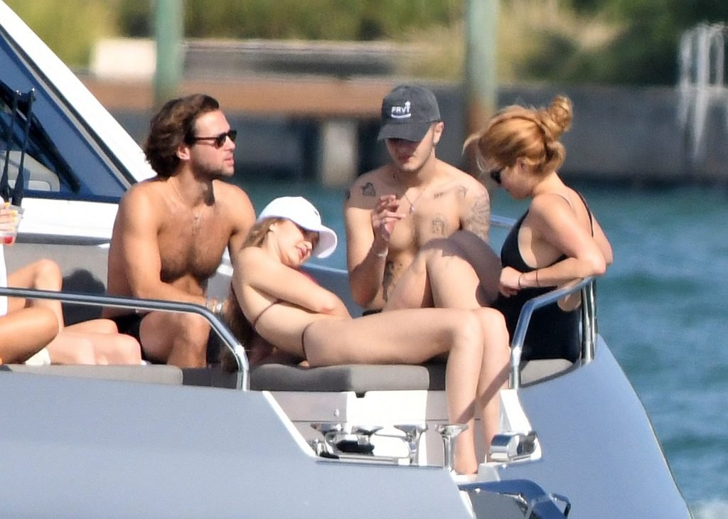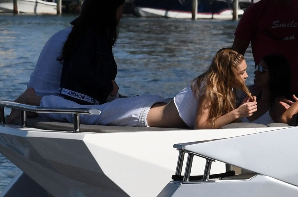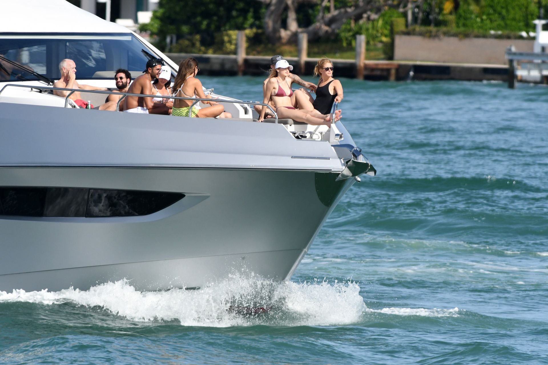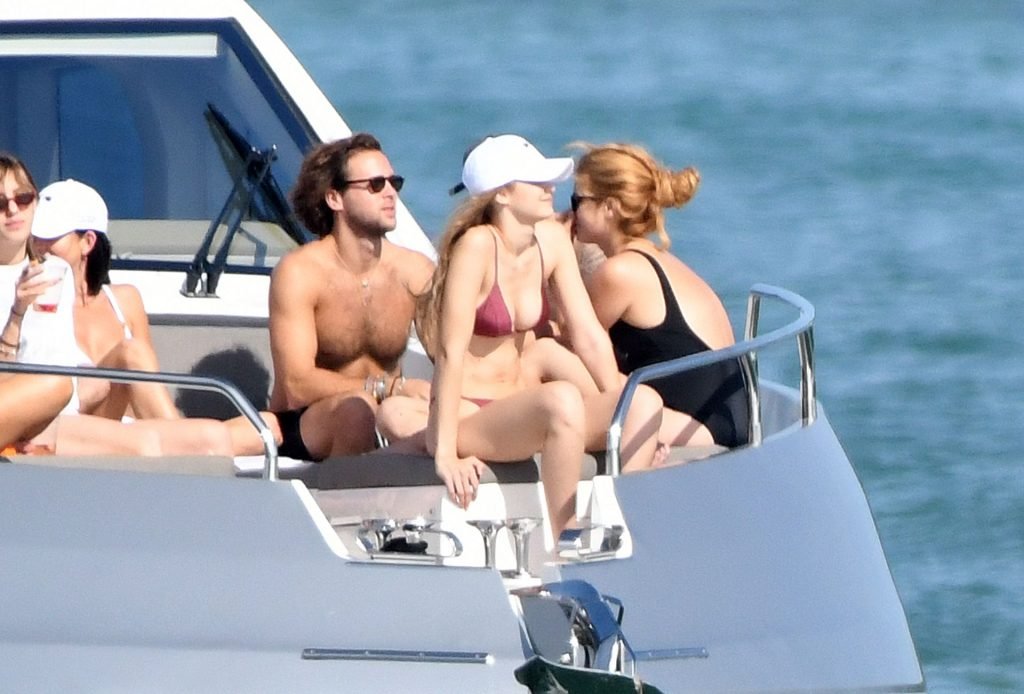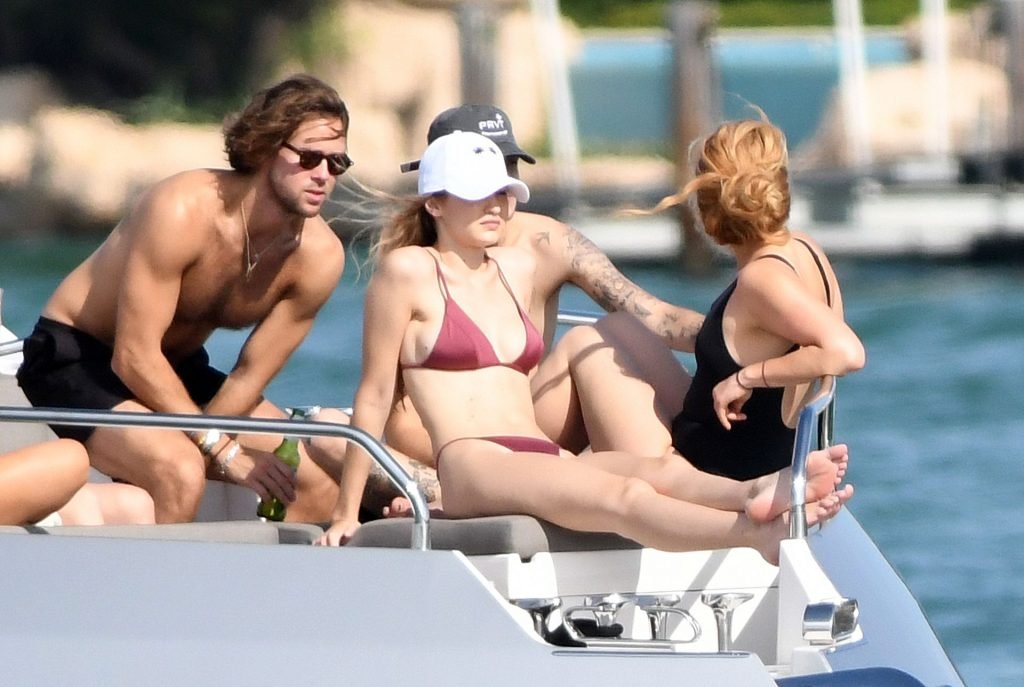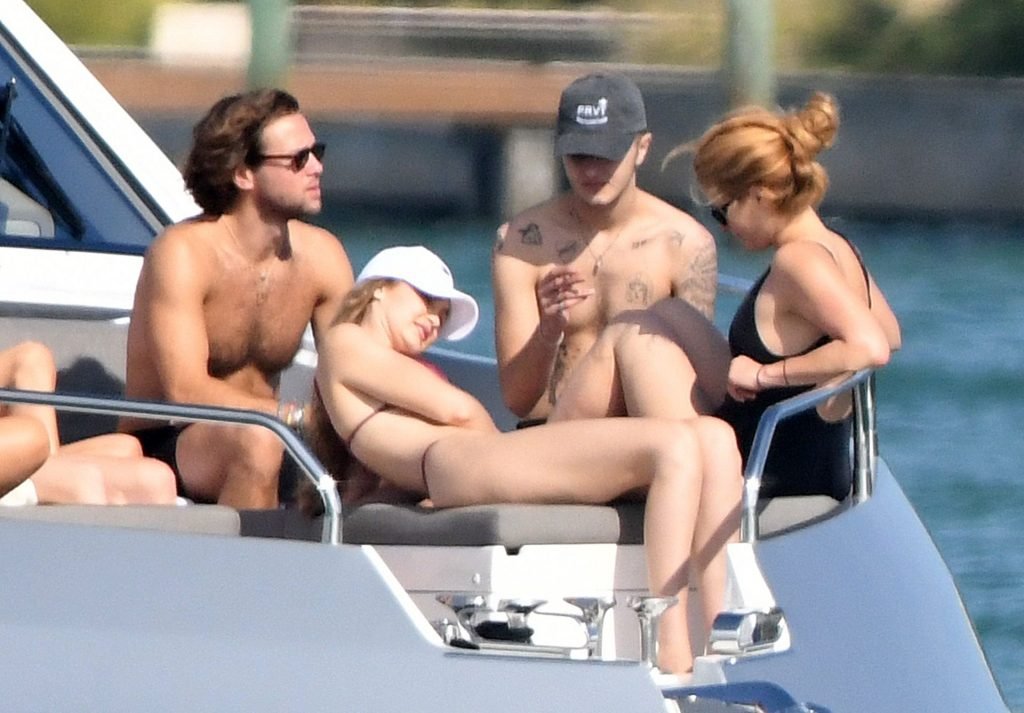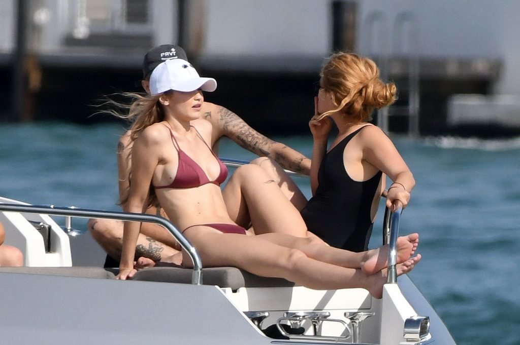 Model Gigi Hadid (23) é vista usando um biquíni vinho enquanto navega em um iate com o irmão Anwar Hadid e alguns amigos em Miami, 25/11/2018.